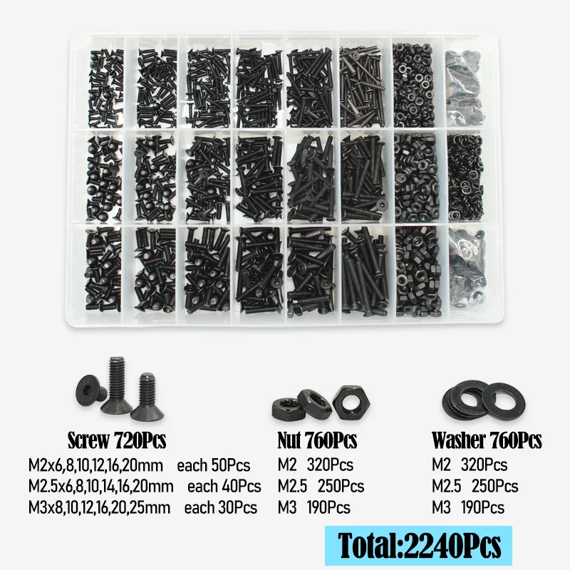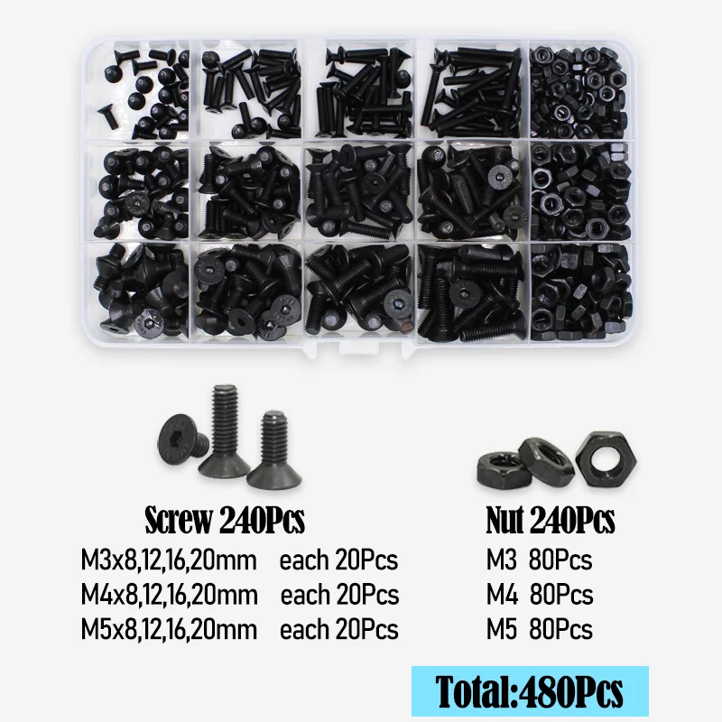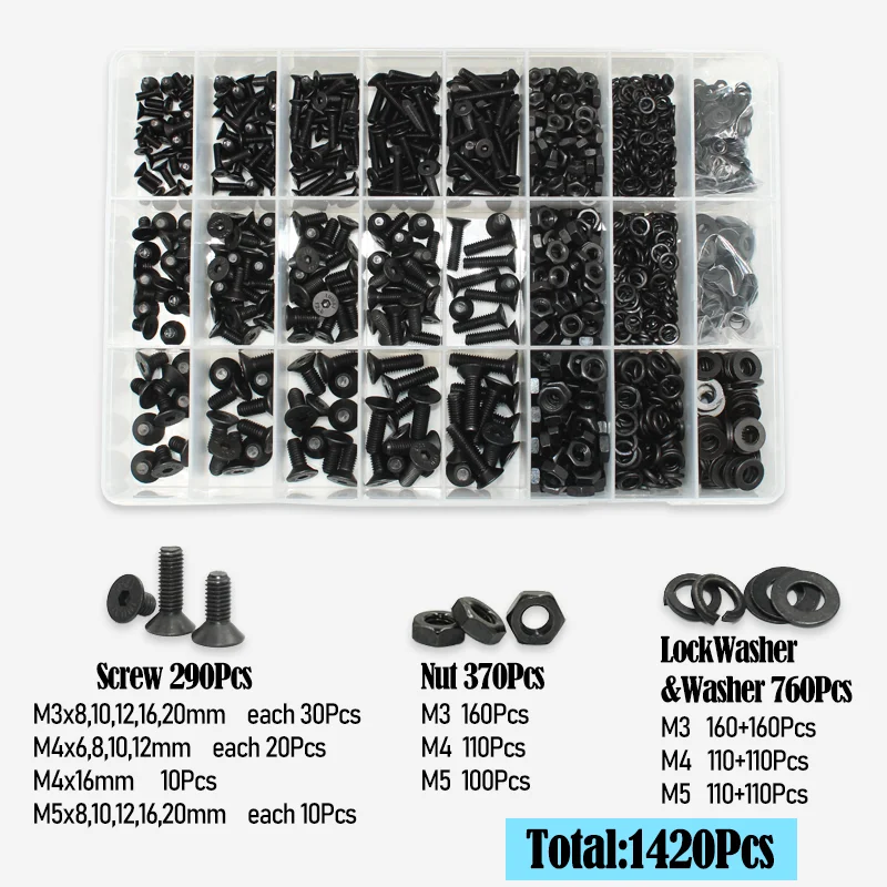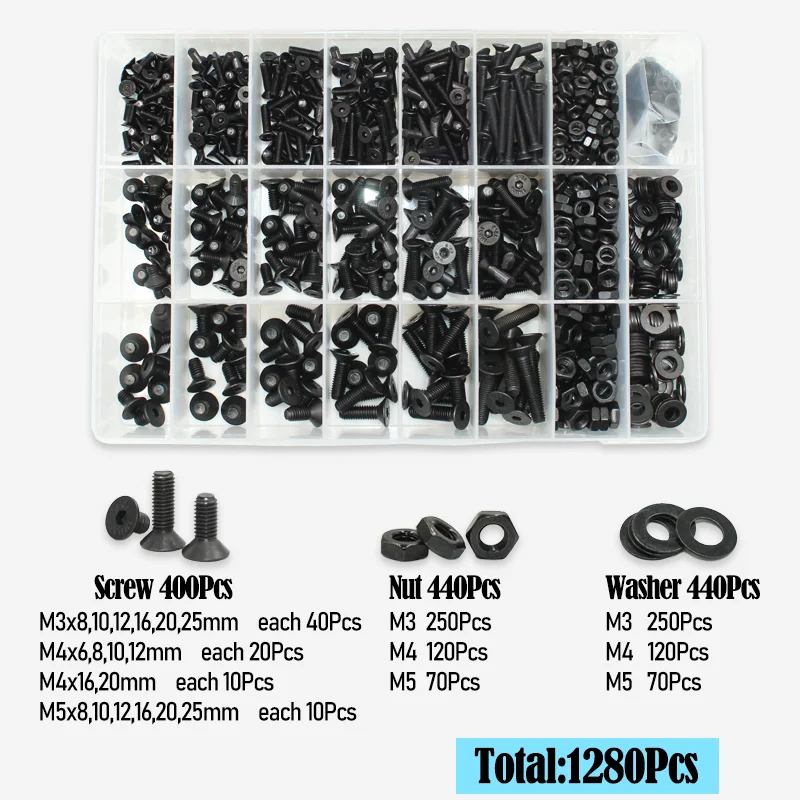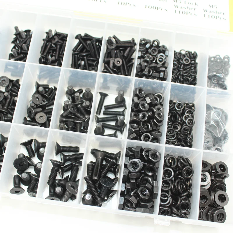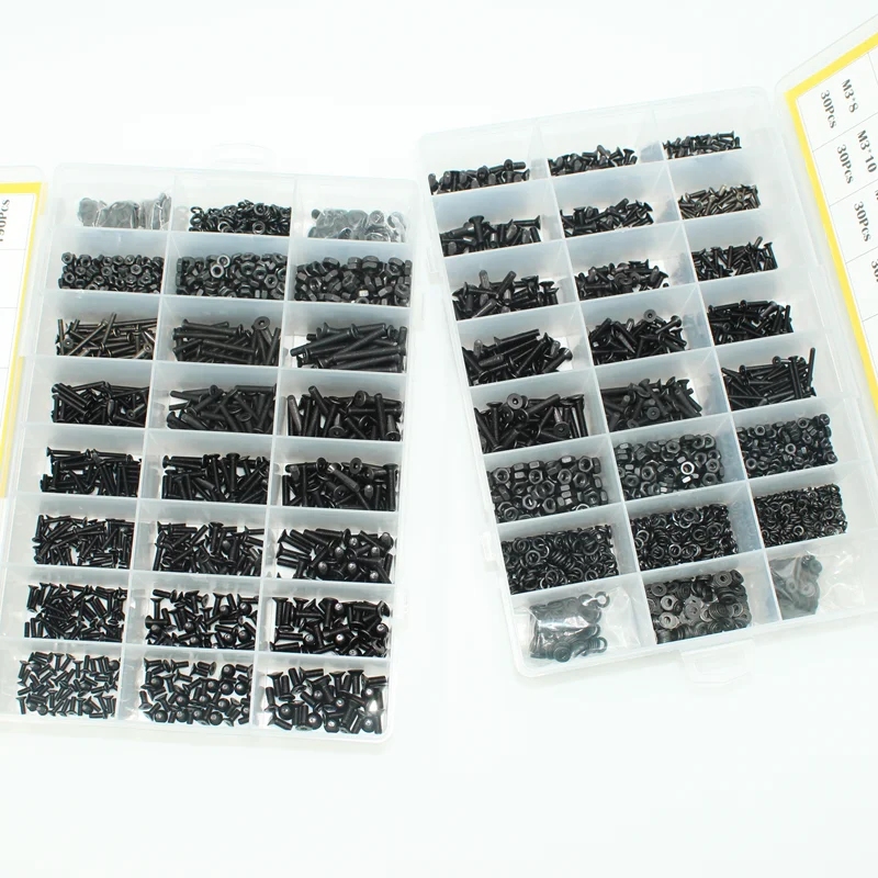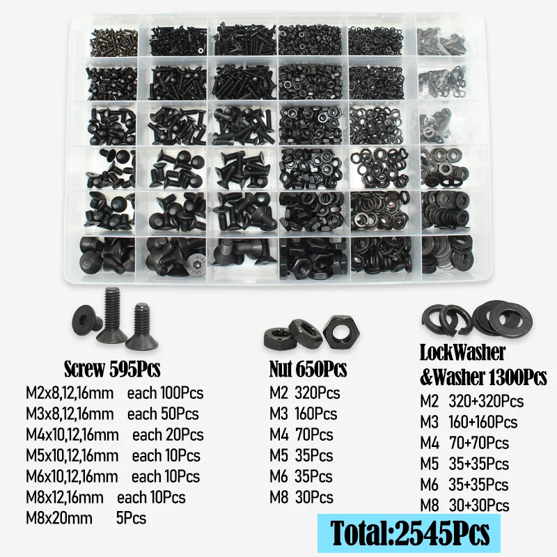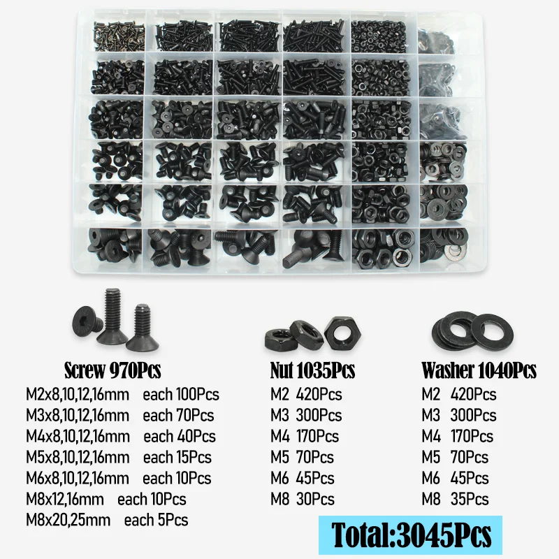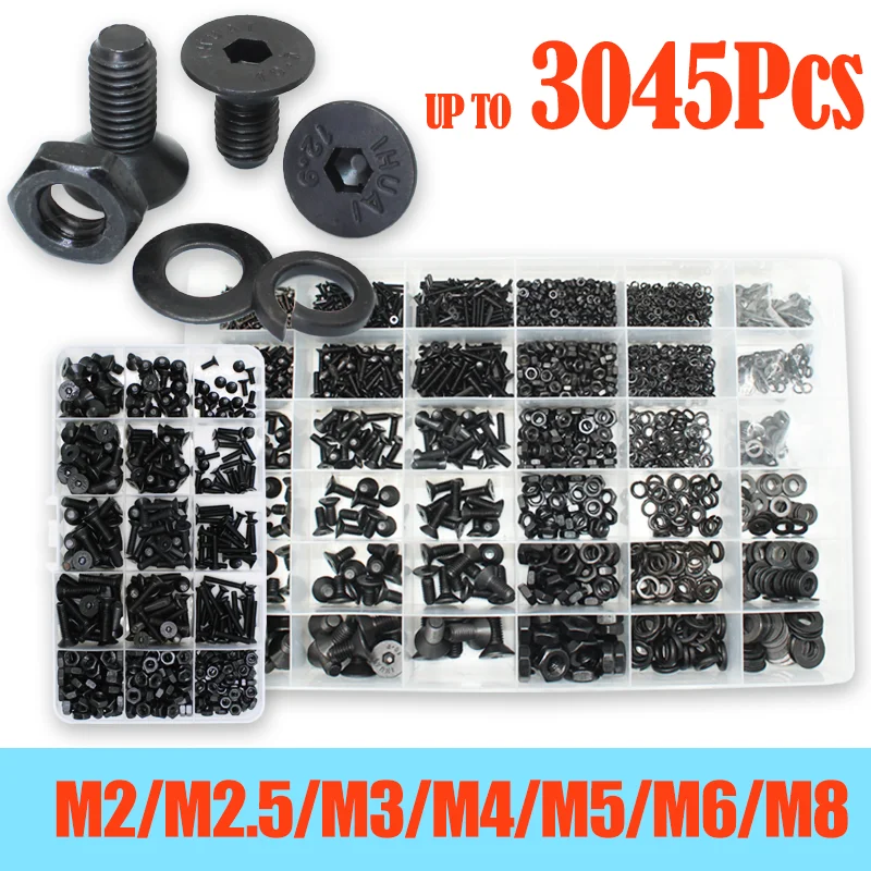 3045p/set Hex Socket Flat Head Screws Bolts Nuts Assortment Kit M2 M2.5 M3 M4 M5 M6 M8 Black Grade 10.9 Steel with Washers Set