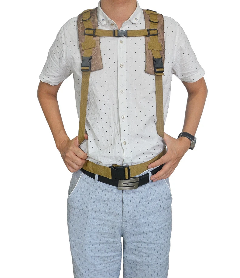 This backpack is made of high-density waterproof Oxford fabric, which is waterproof and wear-resistant. It is suitable for outdoor hiking, camping, travel, real-life simulation games, and more.