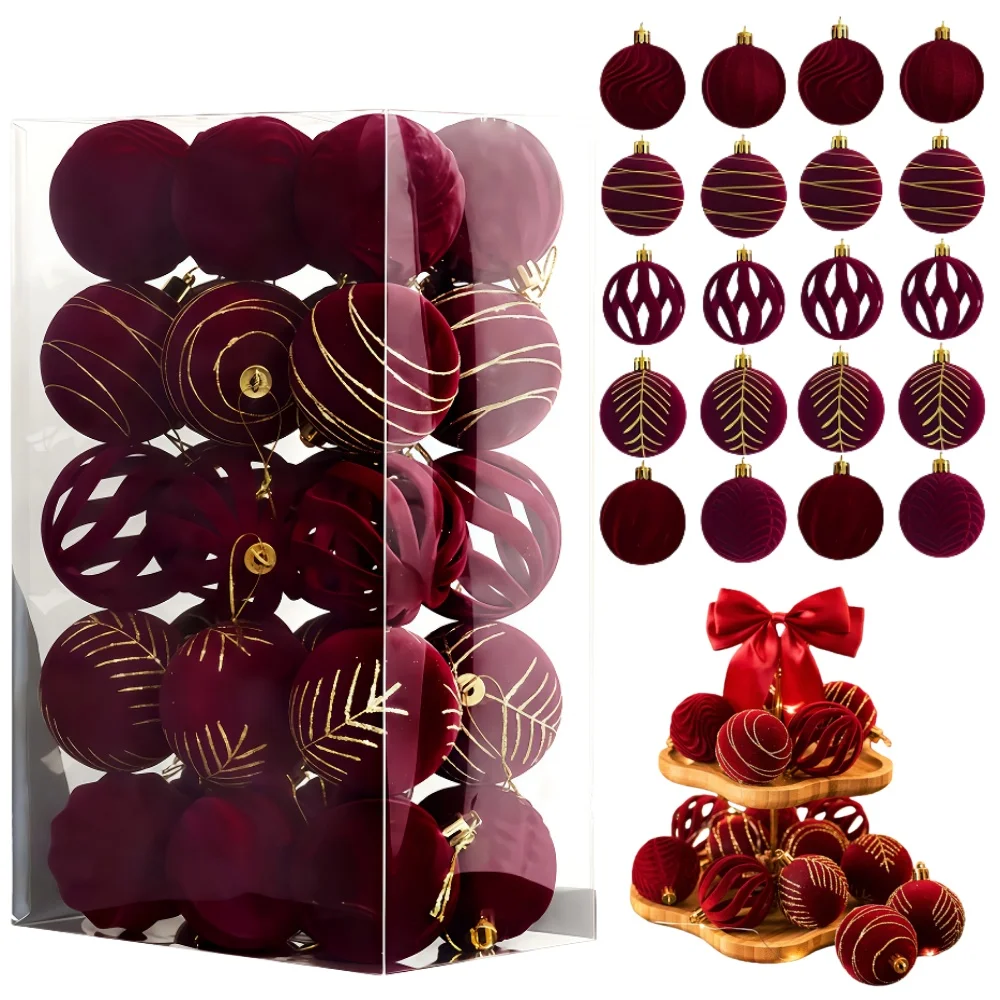 30PCS 6CM Velvet Red Christmas Balls Merry Christmas Spheres Pendant Flocked Christmas Tree Ornaments New Year Gifts Home Decor