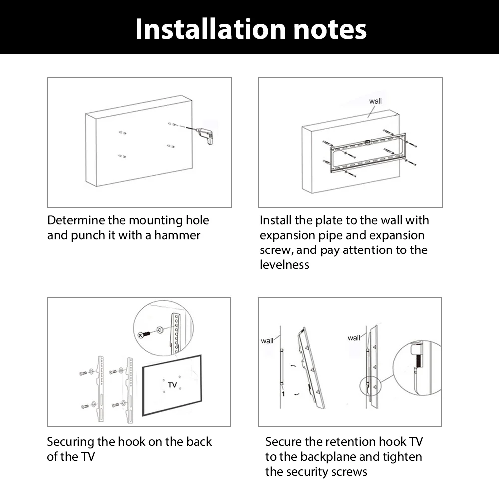 Features: Fixed wall-mounted bracket (no tilt adjustment for TV hanging bracket)
