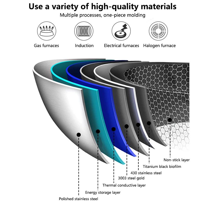 ● 13.4 inch stir fry pan made of stainless steel, nonstick cookware interior is Honeycomb texture,It can heat up quickly when cooking, and cook tastier food.