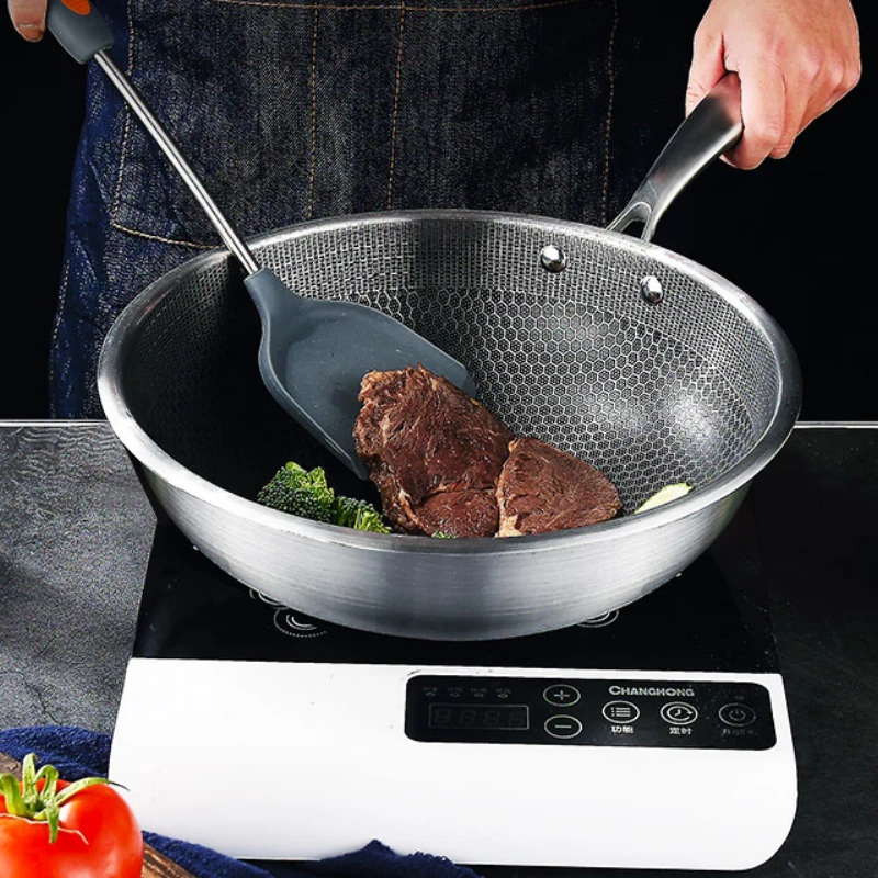 ● 7-ply traditional round-bottom wok has a wide cooking surface ideal for stir-frying on gas or electric ranges. The wok spatula does not scratch the surface of the wok.