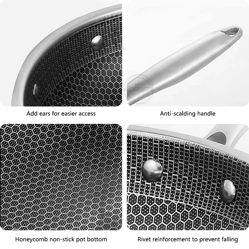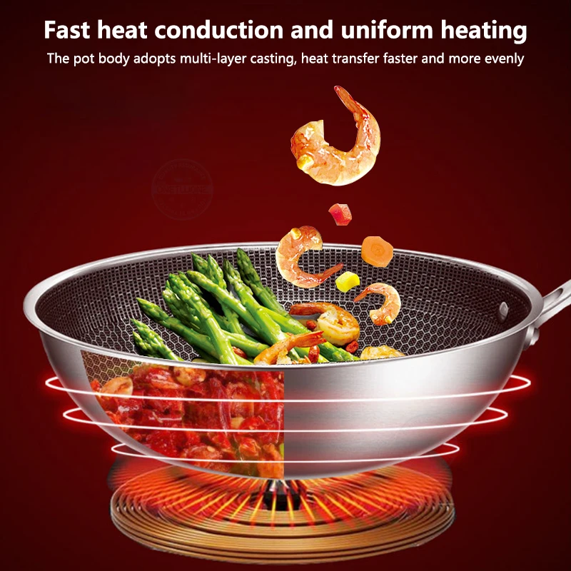 ● This product is a high-quality stainless steel honeycomb-textured wok, crafted with precision and rivet reinforcement. It is a versatile home cooking wok. It is very suitable for giving gifts to family and friends, they will definitely be very happy.
