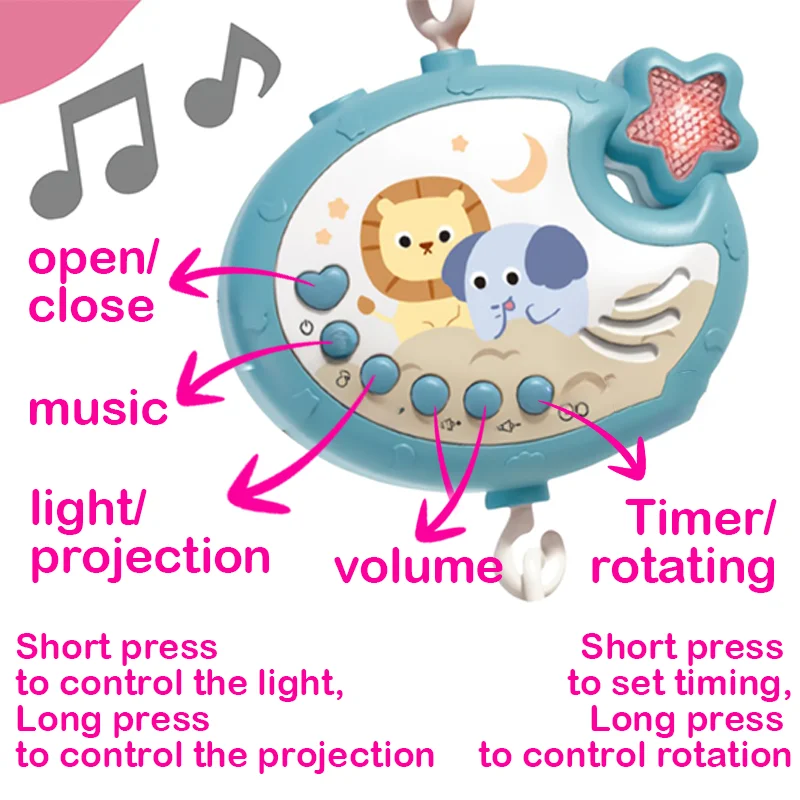 The four detachable hanging cute and cartoon animal toys improve cognition. 360° rotating hanging rattles with music and light to attract the baby’s attention and exercise their vision.