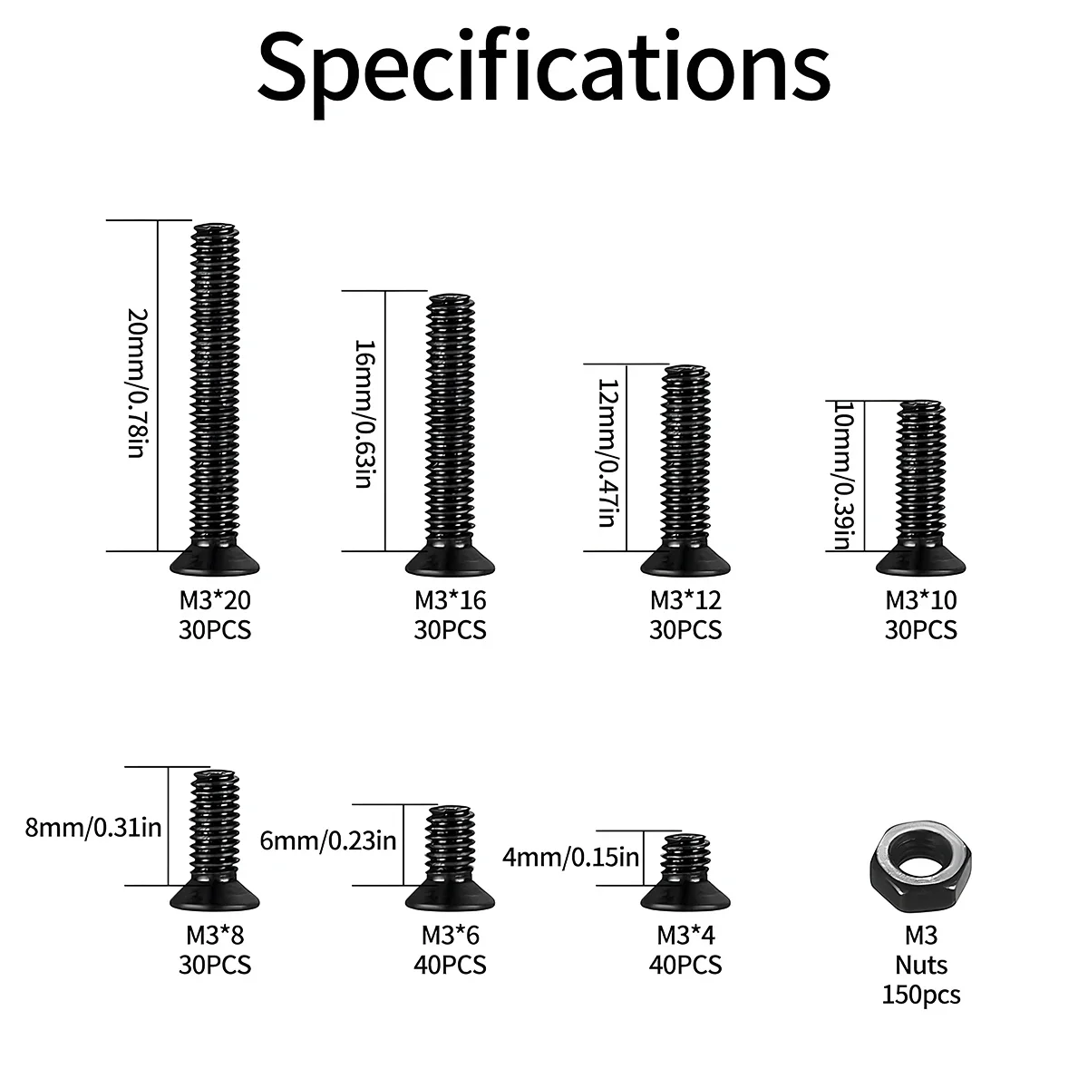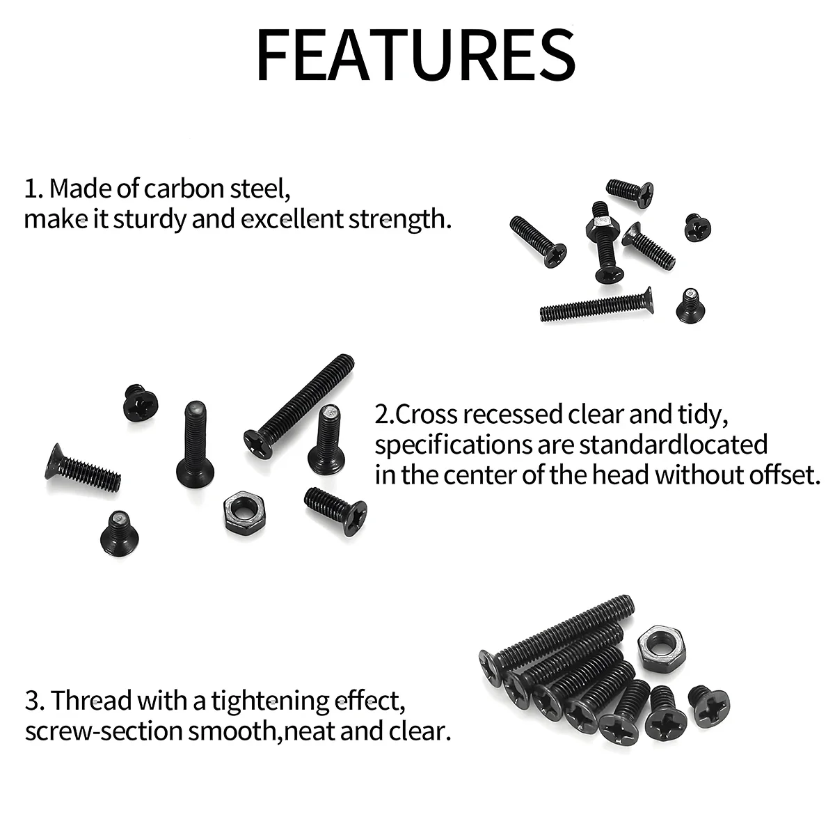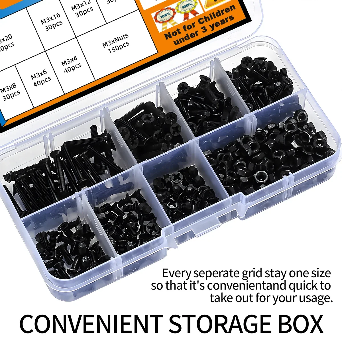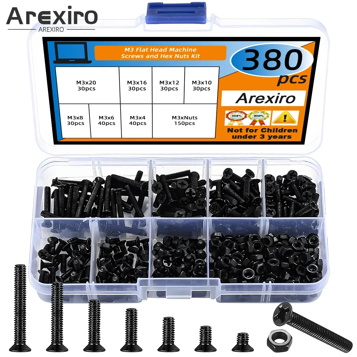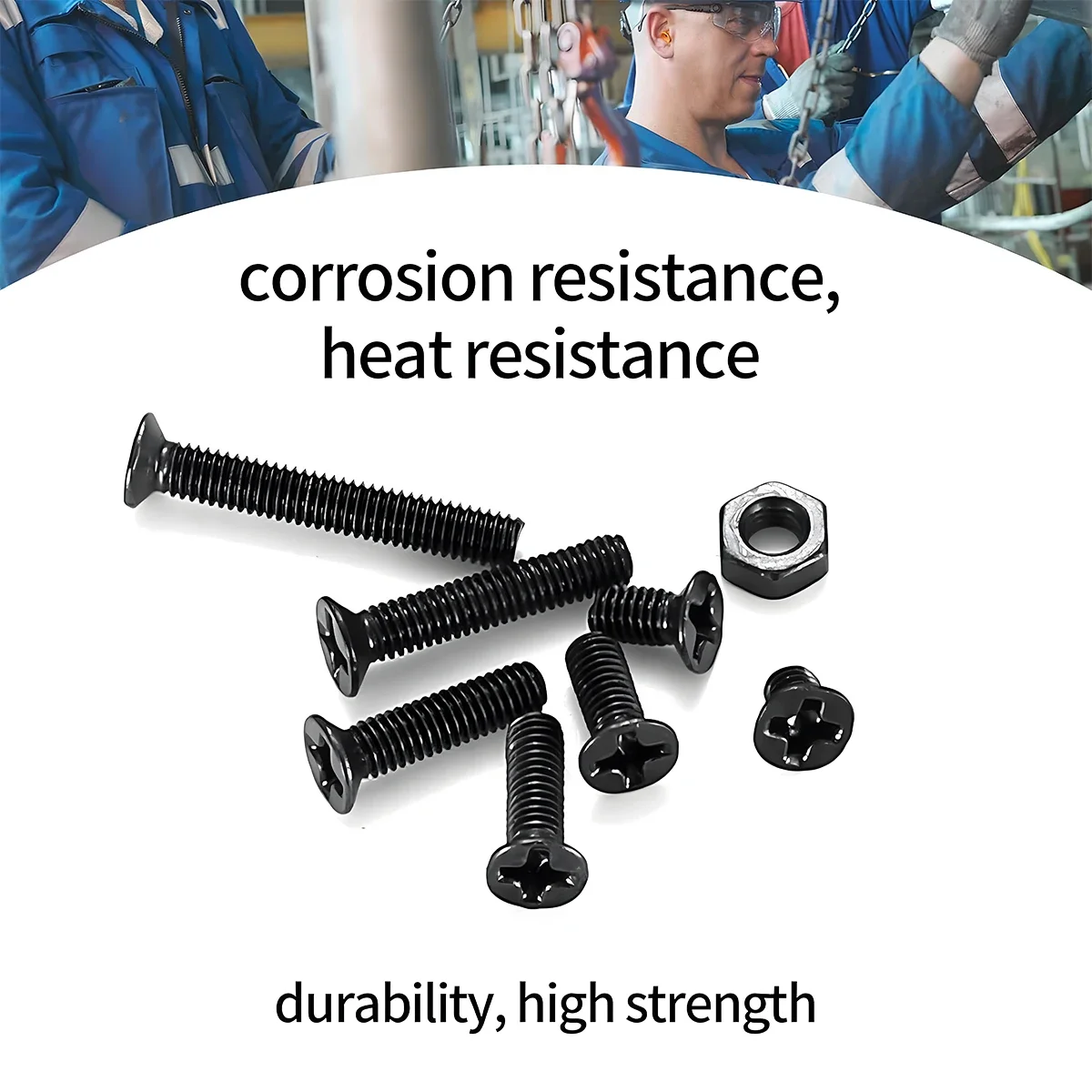 380Pcs M3 Flat Head Machine Screws and Hex Nuts Kit Black Countersunk Head Phillips Screws Bolts Nuts Assortment Kit