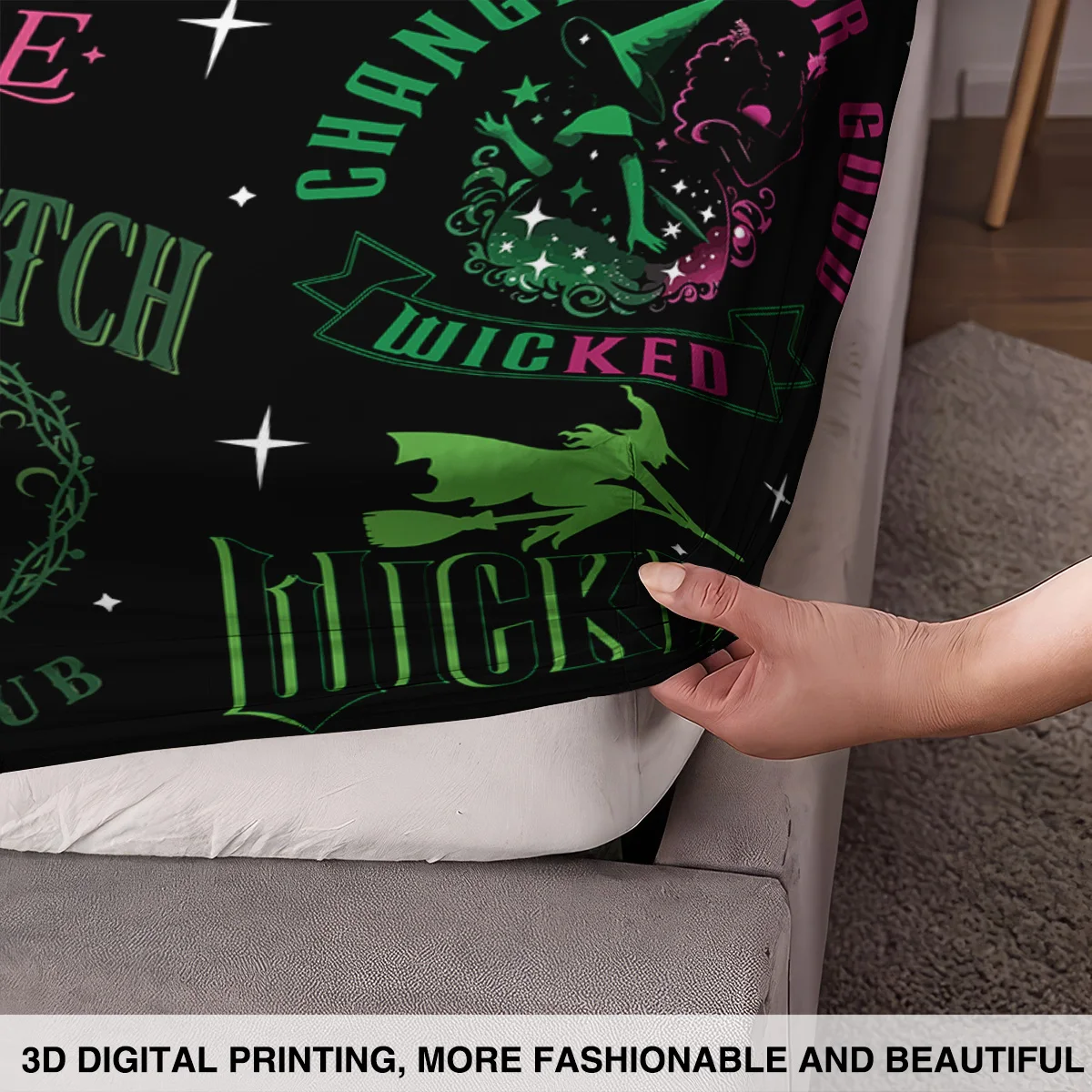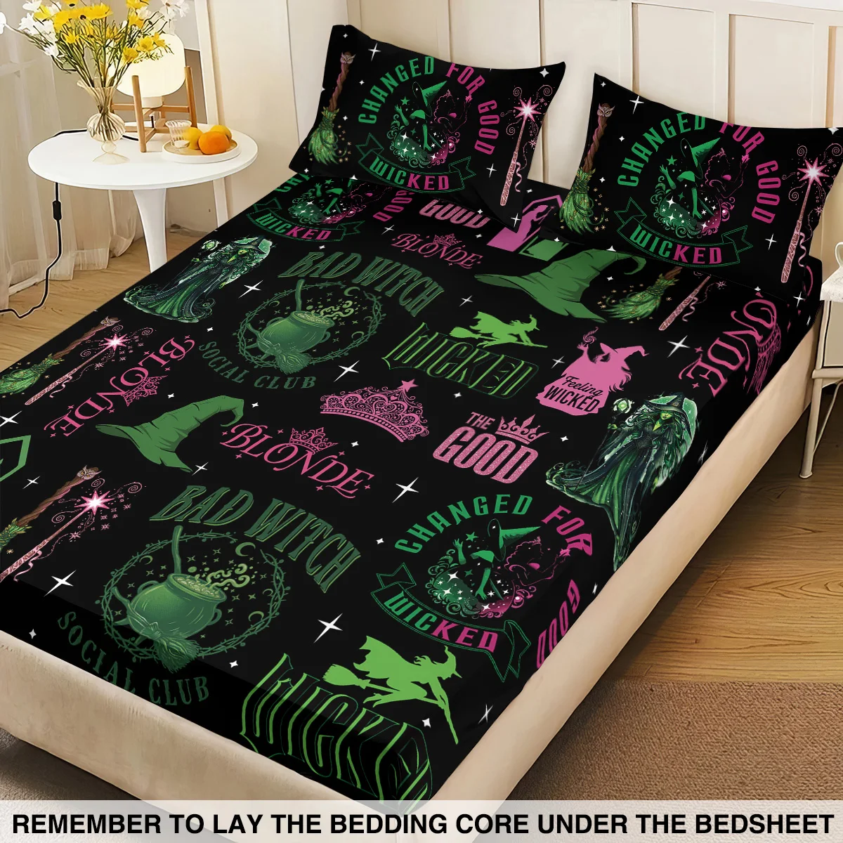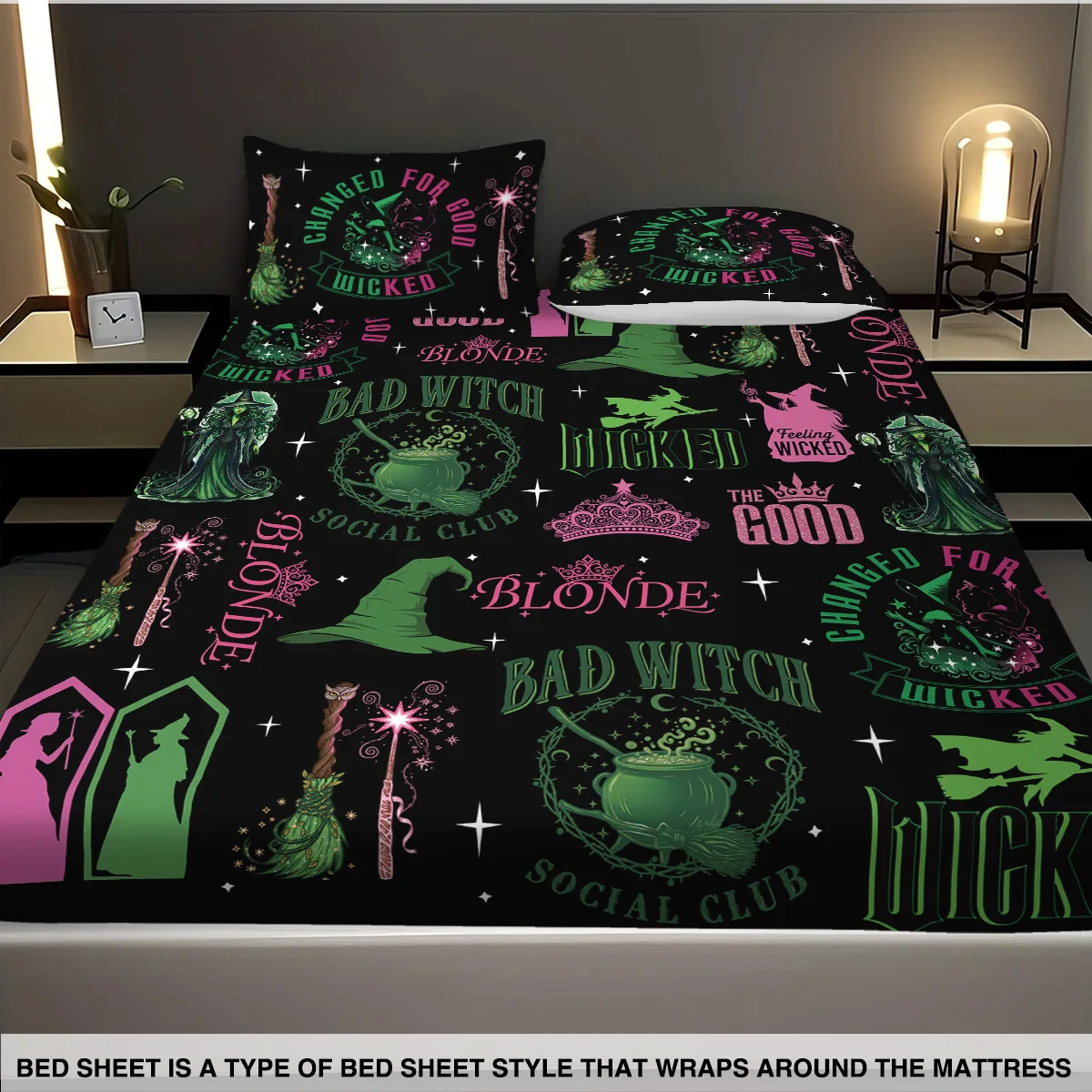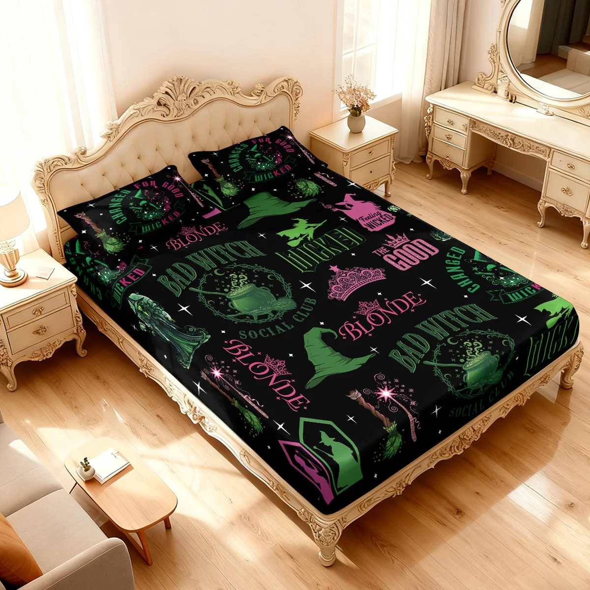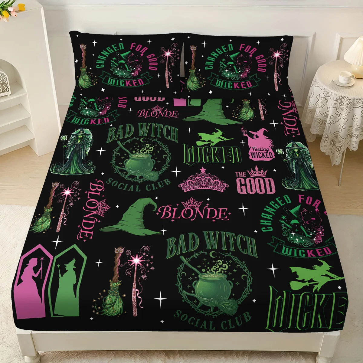 3pcs Magic Wicked Witch Printed Chipless Bed Sheet Set, Multi Size Soft Bed Cover, Bedroom Bedding Decoration