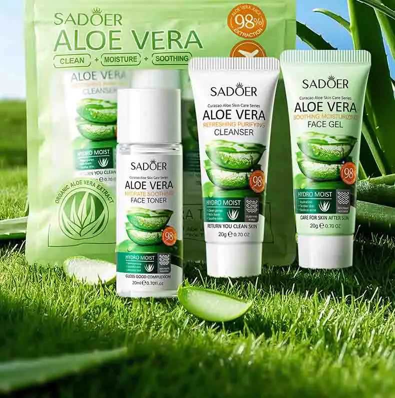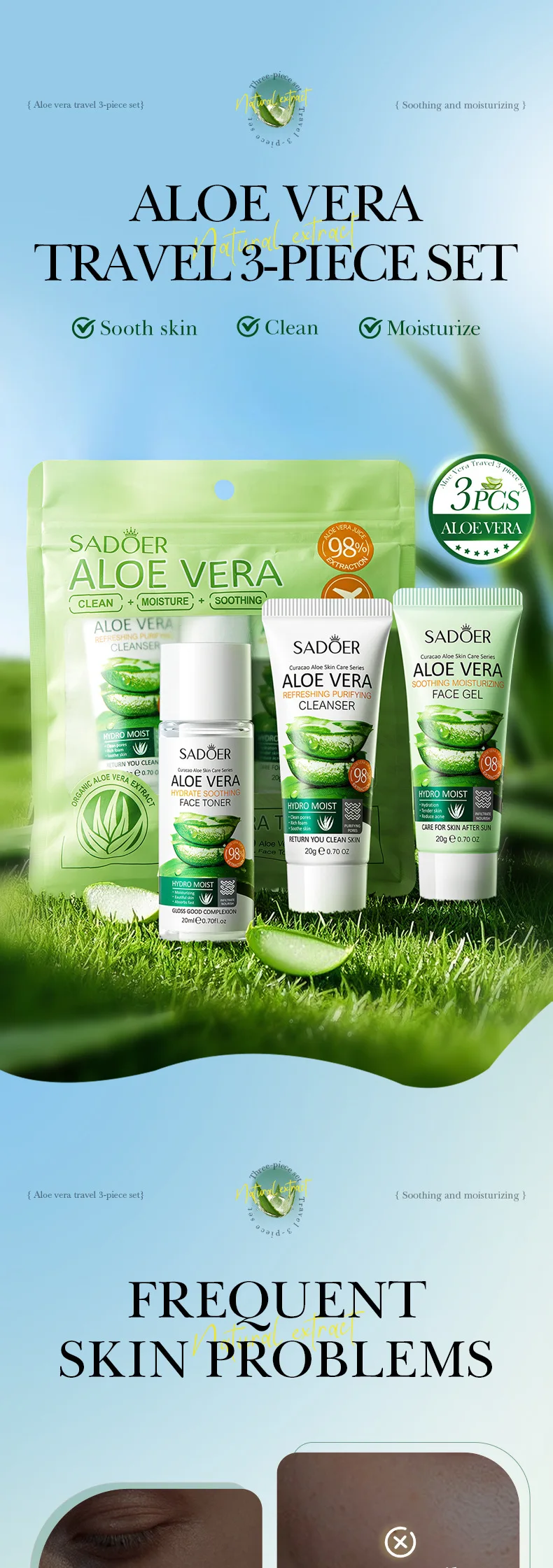 3pcs SADOER Aloe Vera Skin Care Sets Face Wash Facial Cleanser Aloe Gel Toner Face Cream Moisturizing Anti-aging Skin Care Kit