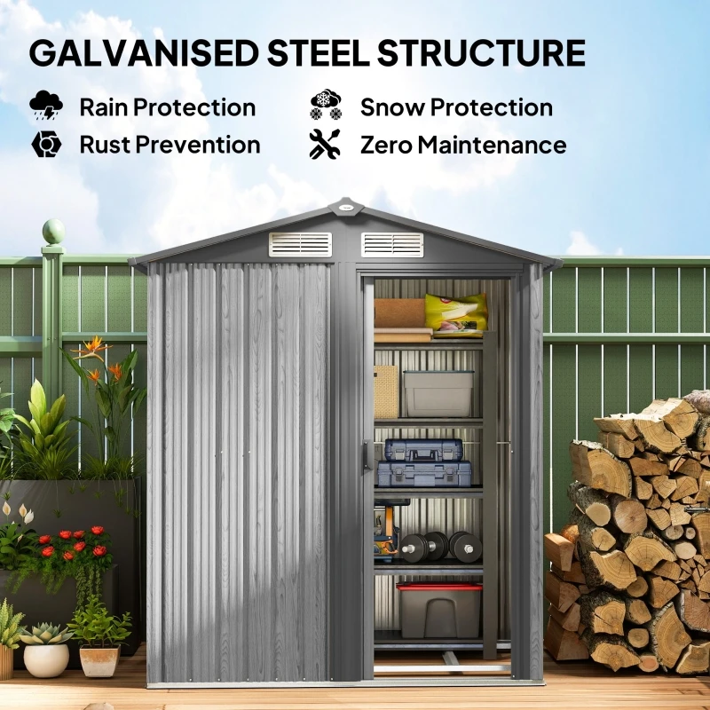 Steel frame: A strong, sturdy shelter – this metal storage shed offers a safe and weather protected shelter for inside items. Water-resistant finish.
