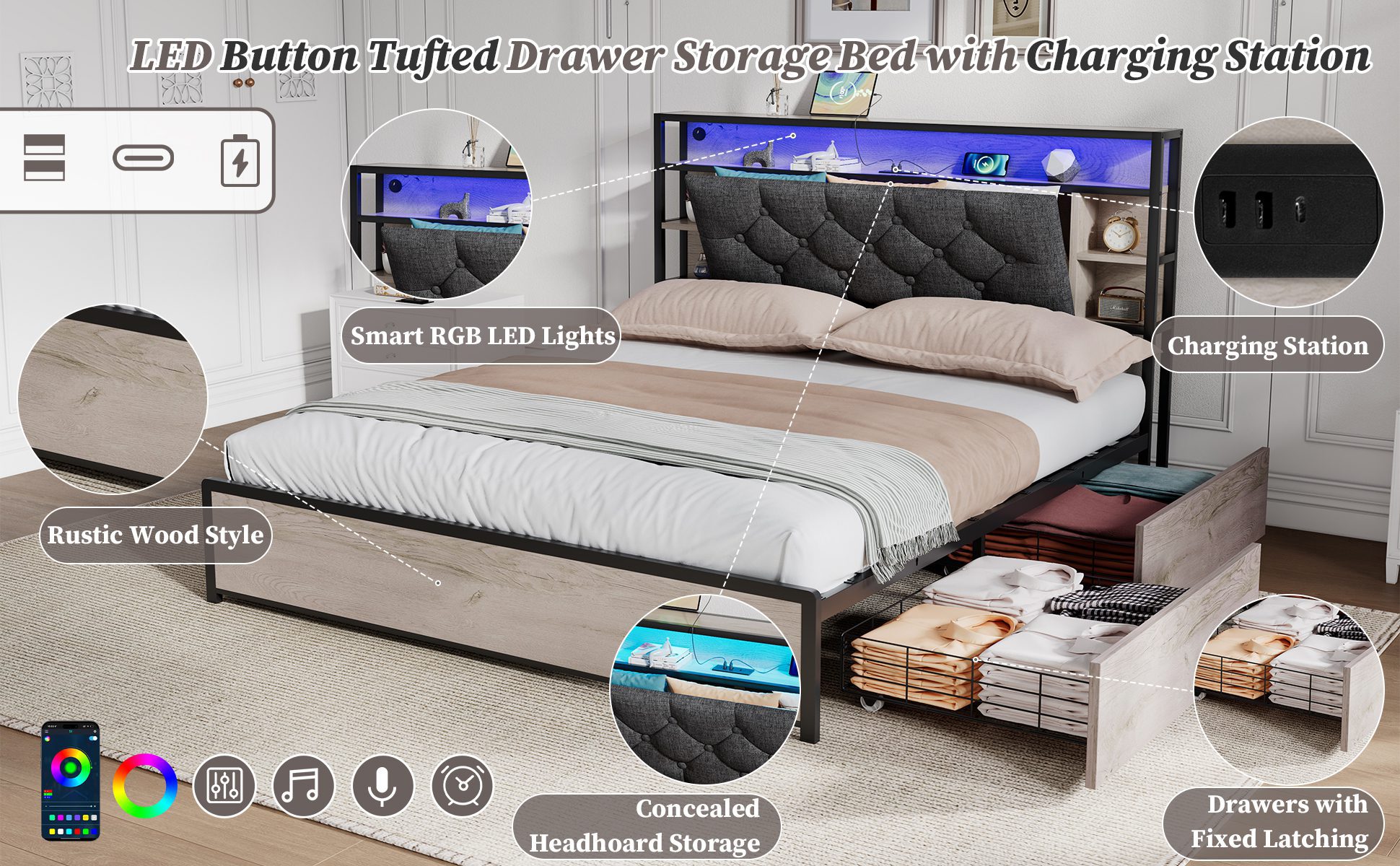 Storage drawers & Concealed headboard storage Charging station & Smart RGB LED lights & Vintage rustic wooden style