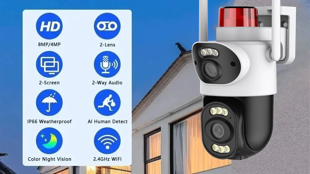 4K 8MP WiFi Surveillance Camera With warning lights,AI Human Detect, Dual Lens Cam, 10X Digital, Outdoor Security PTZ IP Cameras
