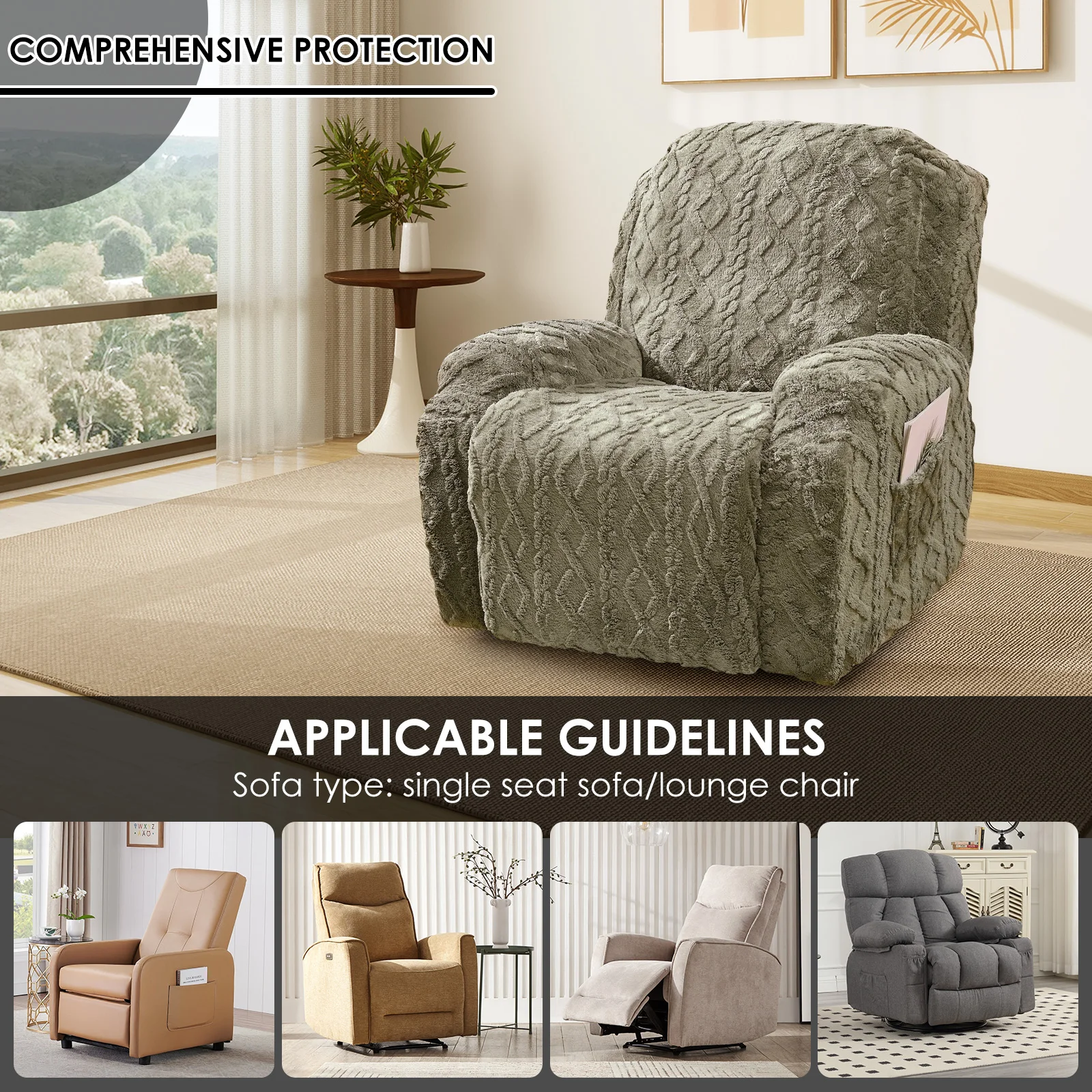 Effective Protection : The bottom of the recliner cover features adjustable straps that provide all around coverage and anti slip functionality . It protects against daily scratches , children’s drawings , and pet scratches and shedding , making it ideal for households with pets . It also serves to protect furnishings while adding elegance to your home