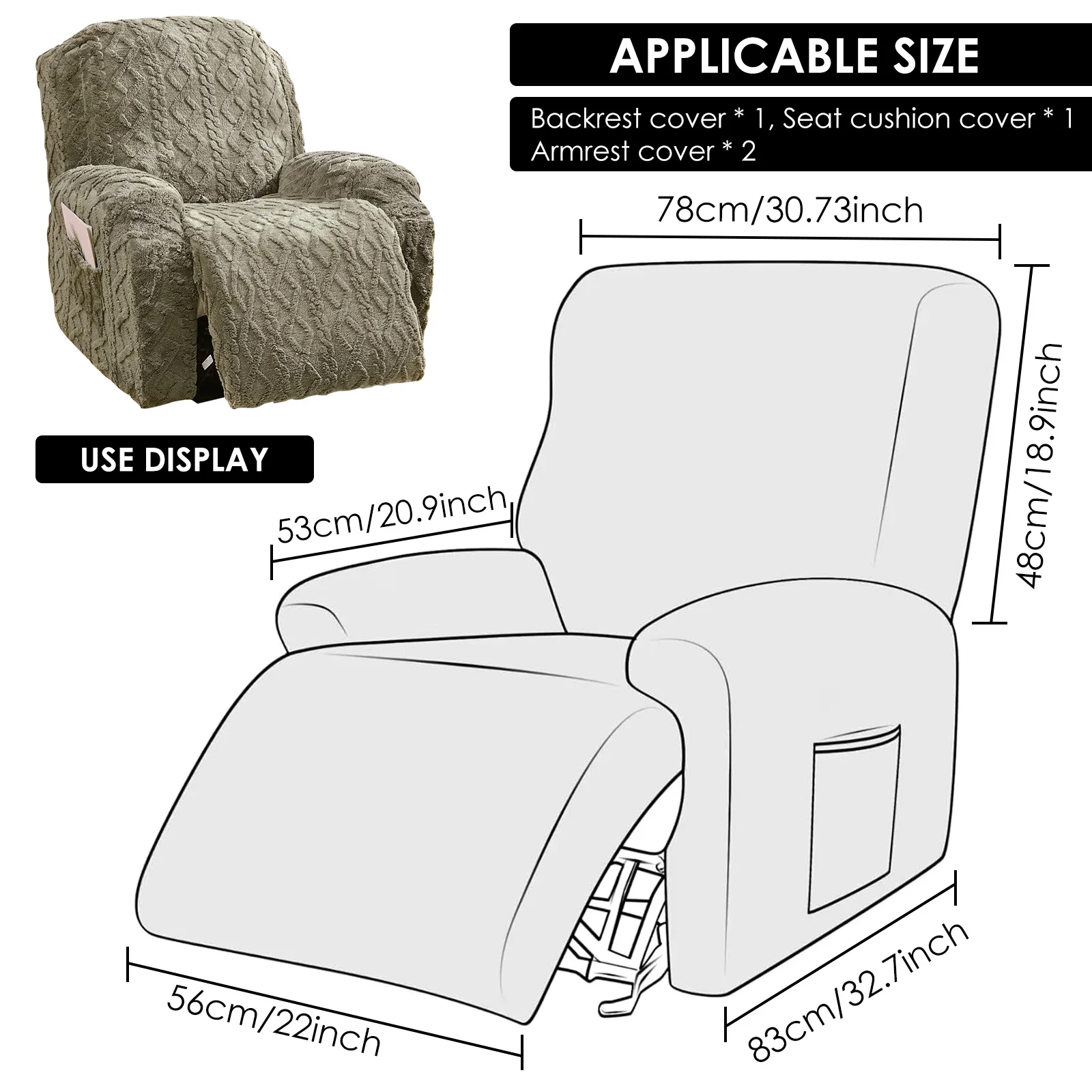 Wide Application : A 4 piece recliner sofa cover set crafted from polyester fabric , compatible with both manual and electric recliner sofas . Dimensions : Backrest width 78cm , height 48cm , base width 56cm , length 83cm , armrest length 53cm . Please refer to the measurement images for verification before purchase