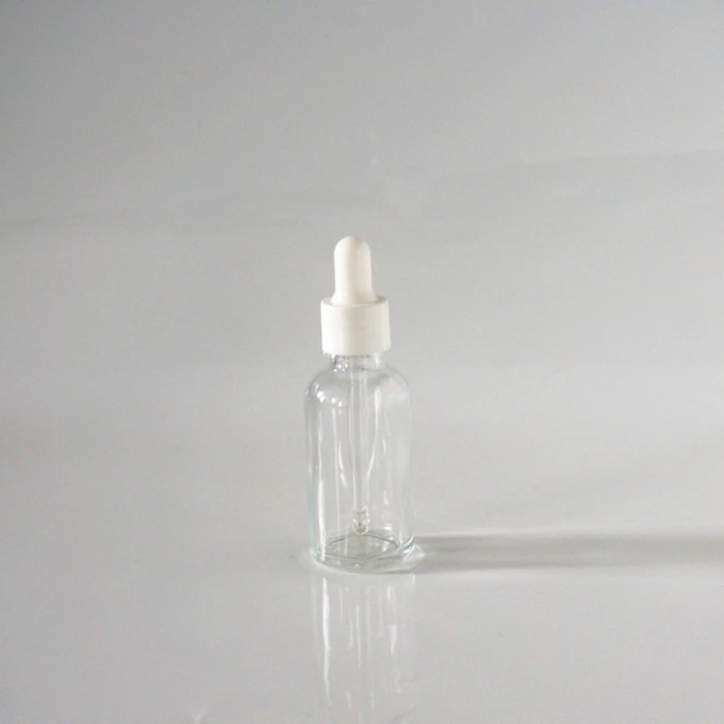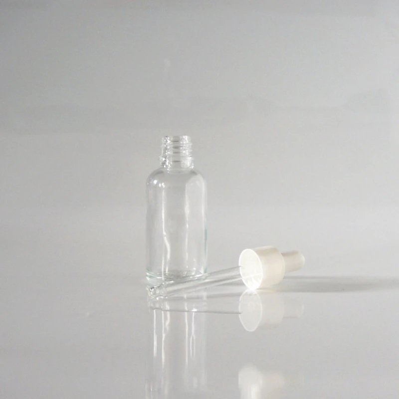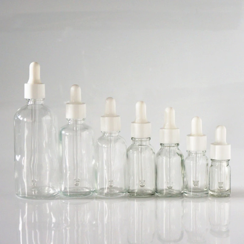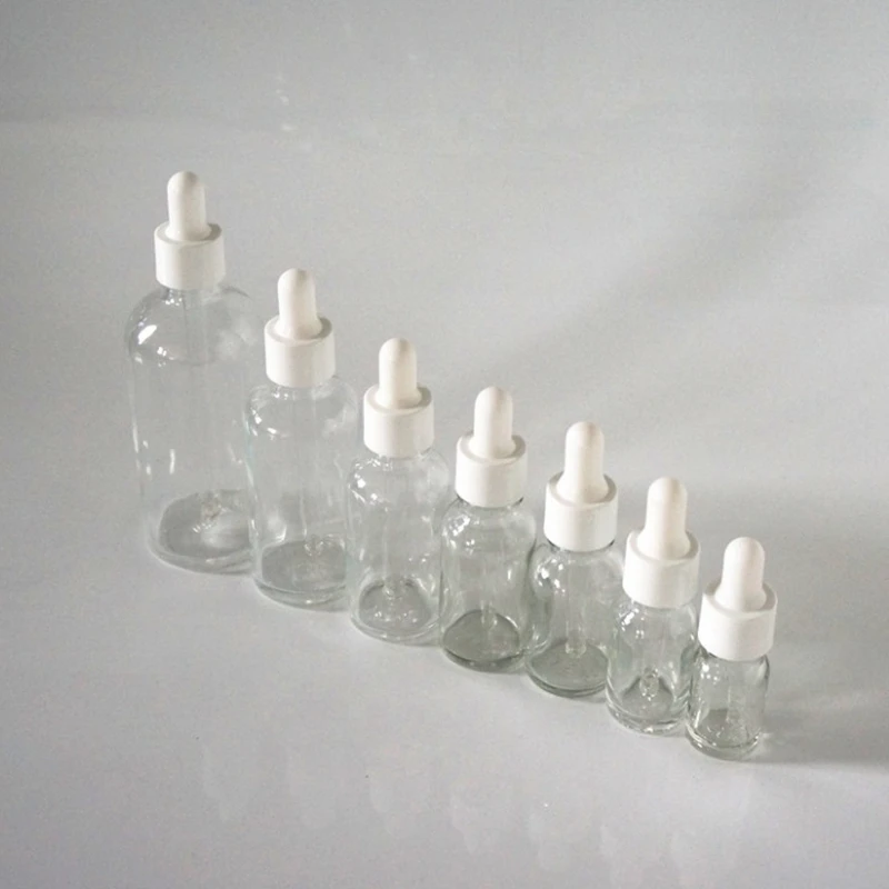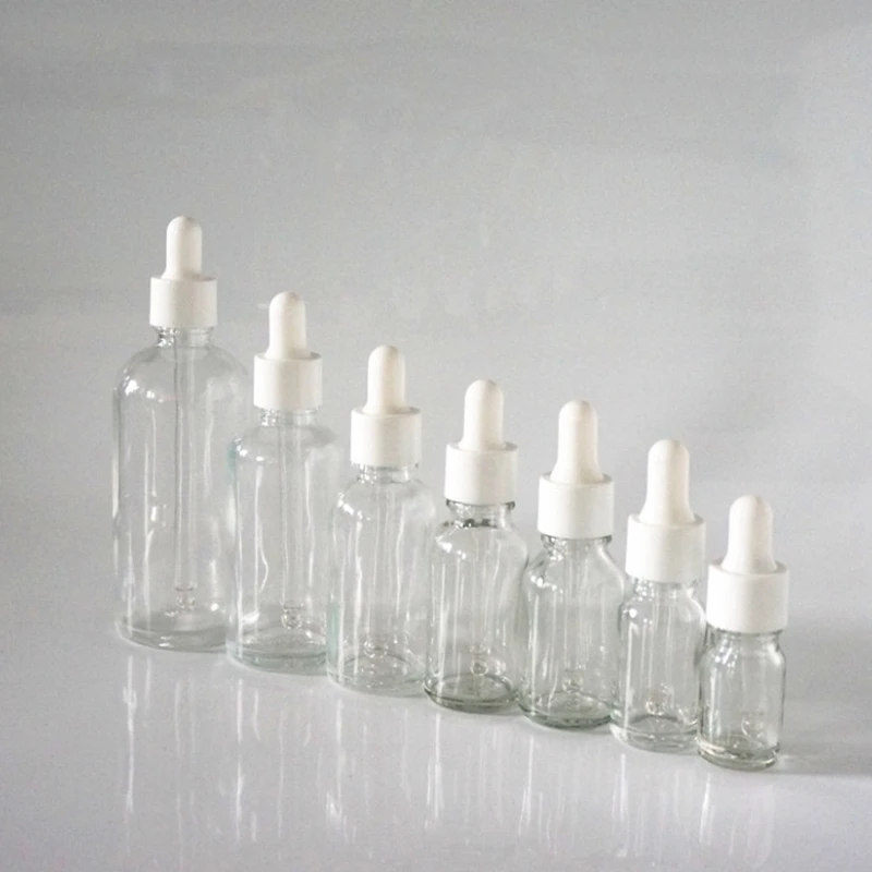 5/10/15/20/30/50/100ml Reusable Clear Essential Oil Bottle with Rubber Head Dropper Cap White Plastic Cover Glass Containers