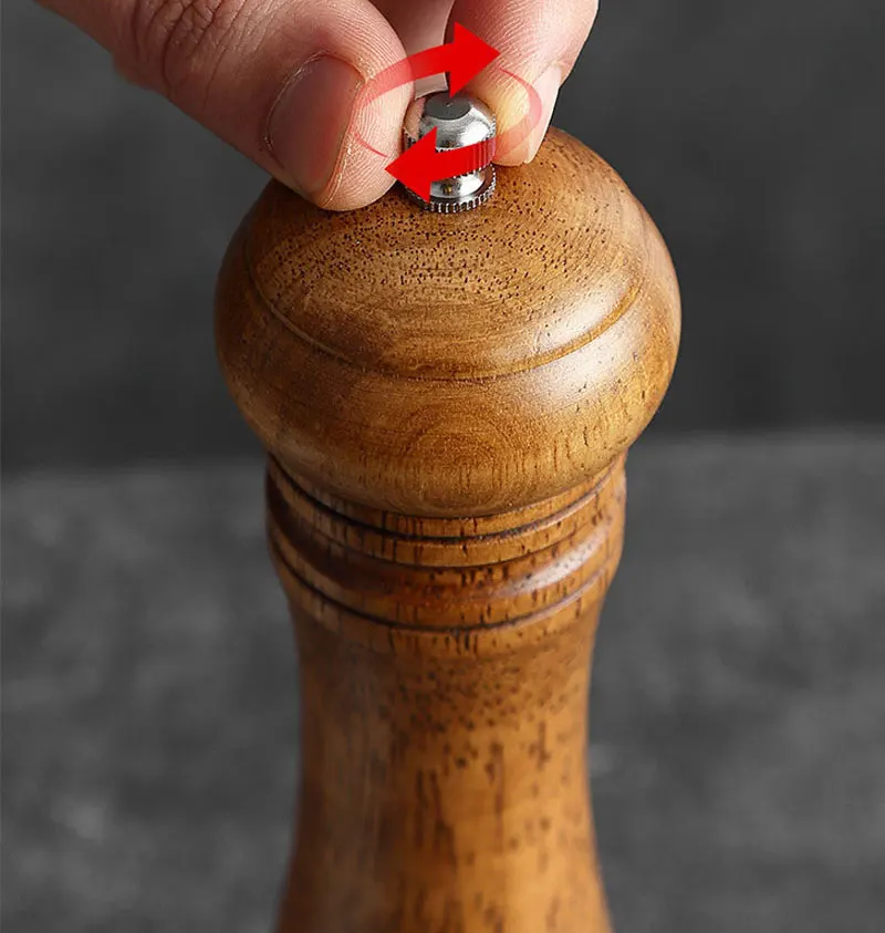 Adjust the seasoning from fine to coarse by twisting the rotary knob on top.Unscrew and remove top nut, pour in peppercorns or sea salt and turn the top clockwise, Turn top nut to adjust from fine to coarse. For a fine grind, turn the nut clockwise. For a coarser grind, turn the nut counterclockwise.
