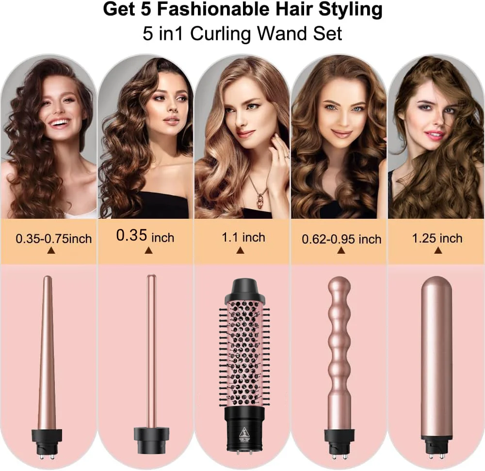 Different sizes of curling irons can create different hairstyles: YAWEEN 5-in-1 curling iron with a size of 1 inch (about 2.4 cm) for a bubble bucket curling iron; 0.5 inches (about 0.5 cm) for a small curling iron; 0.5-1 inches (about 0.5-1 cm) for a conical curling iron; 1.25 inches (about 3.9 cm) for a curling iron; 1.49 inches (about 3.9 cm) for a curling iron; 1.49 inches (about 3.9 cm) for a curling brush.