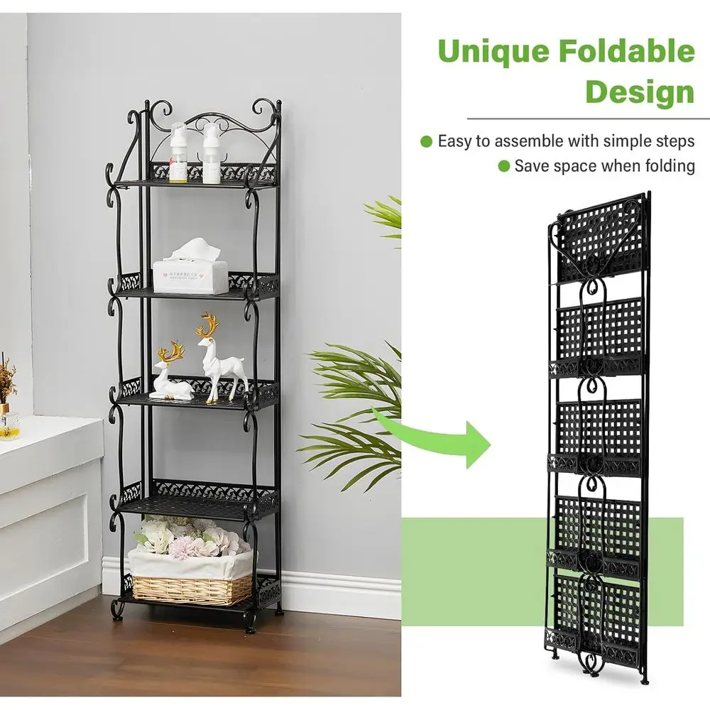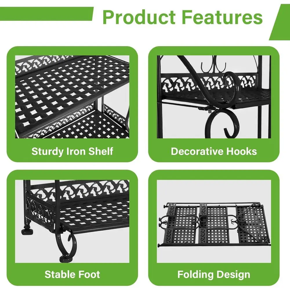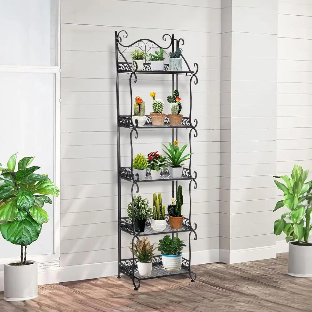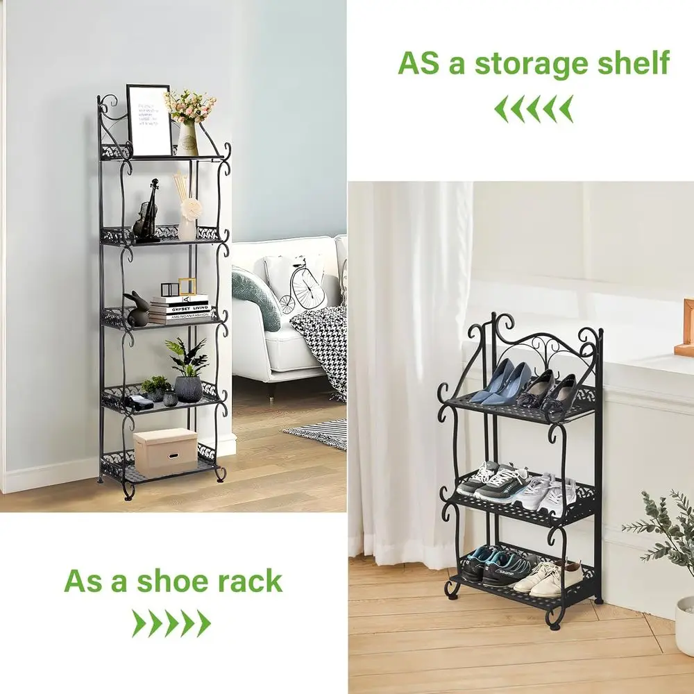 The metal rack serves multiple purposes, functioning as a plant stand, bookshelf, display rack, shoe rack, and more in various settings such as living rooms, entryways, offices, or outdoor patios.