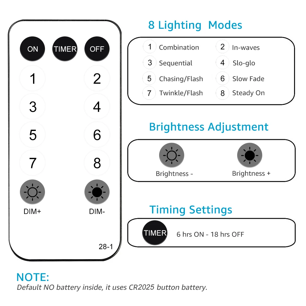 These string lights has 8 MODES (combination, in waves, sequential, slogs, chasing/flash, slow fade, twinkle/flash, steady on.) You can easily control it by press the button on power adapter to turn on/off the fairy lights, and switch different modes you like.