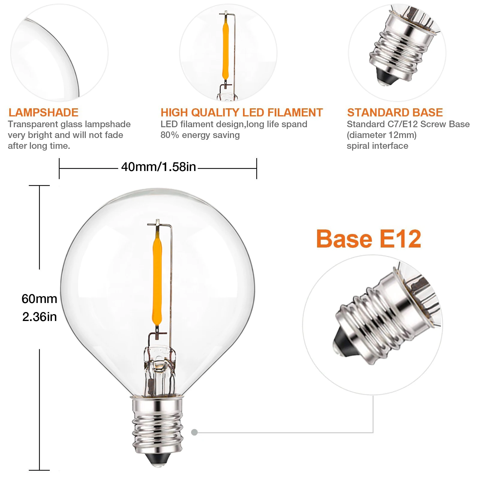 Fits Socket: G40 led bulbs fit in C7/ E12 candelabra base sockets, candelabra led light bulbs perfer for night lights, chandeliers, sconces, fixtures, candle lamps and G40 outdoor decorative string lights