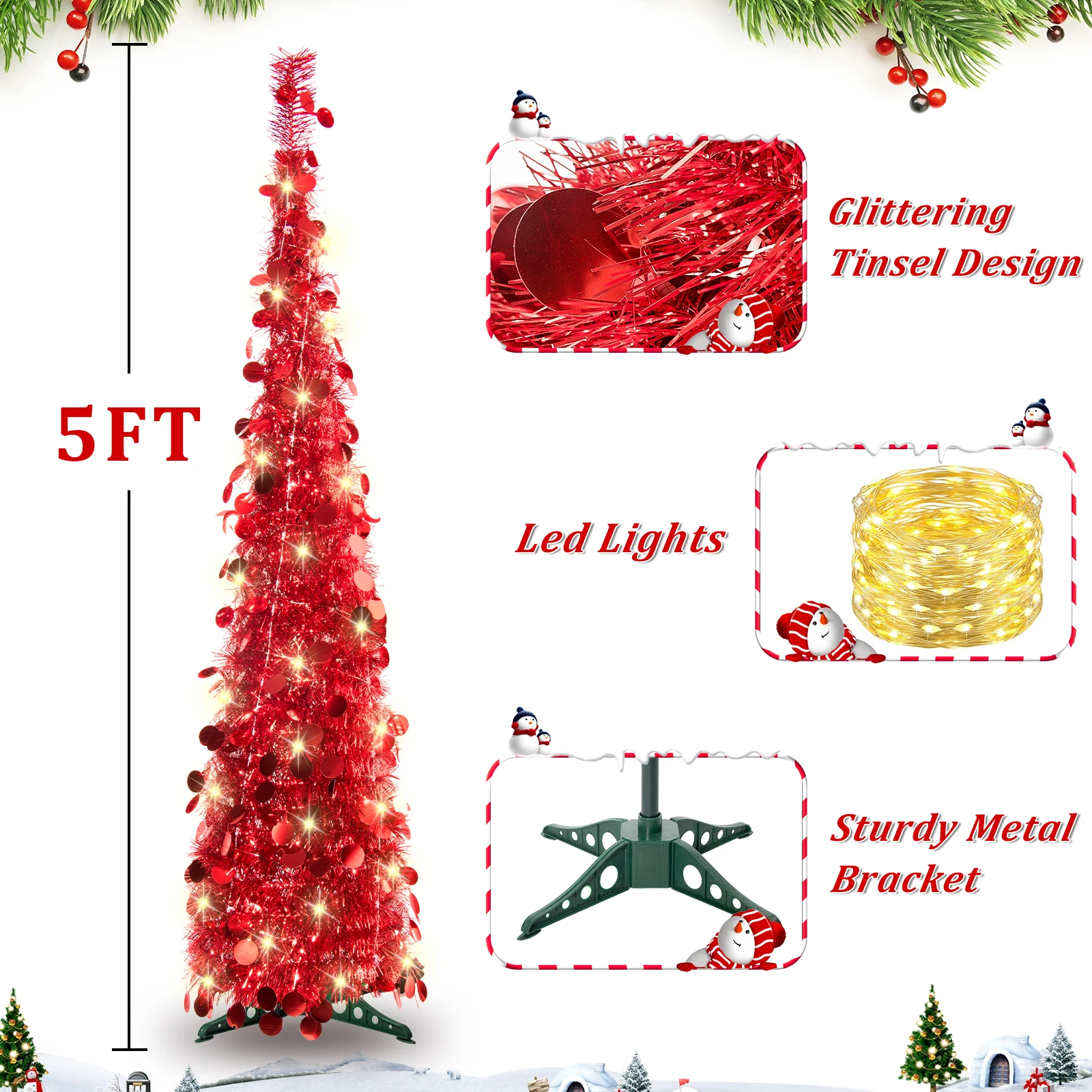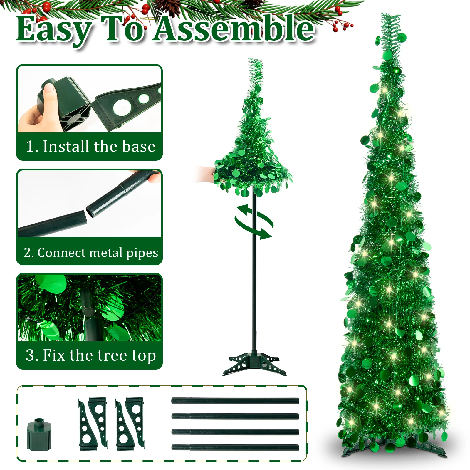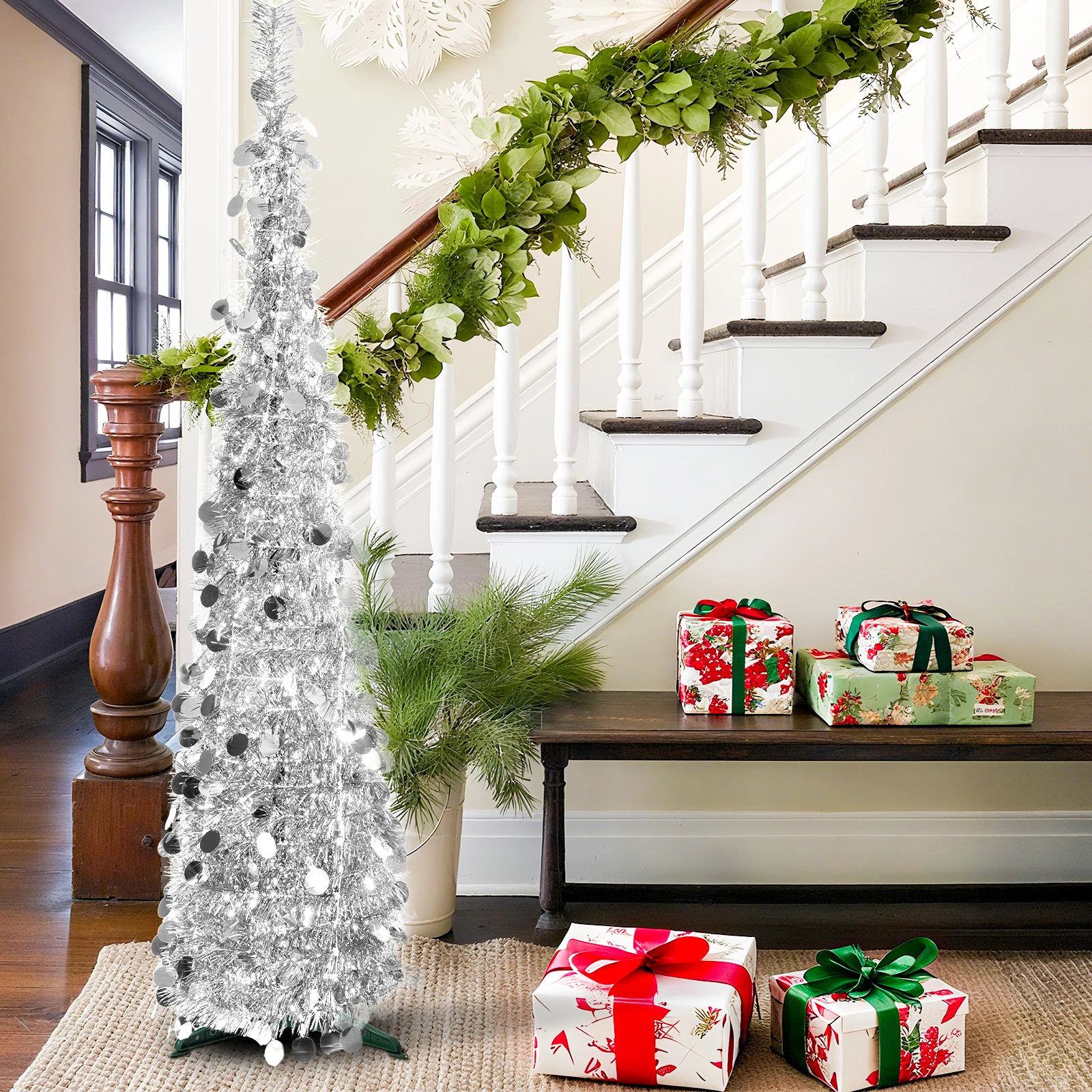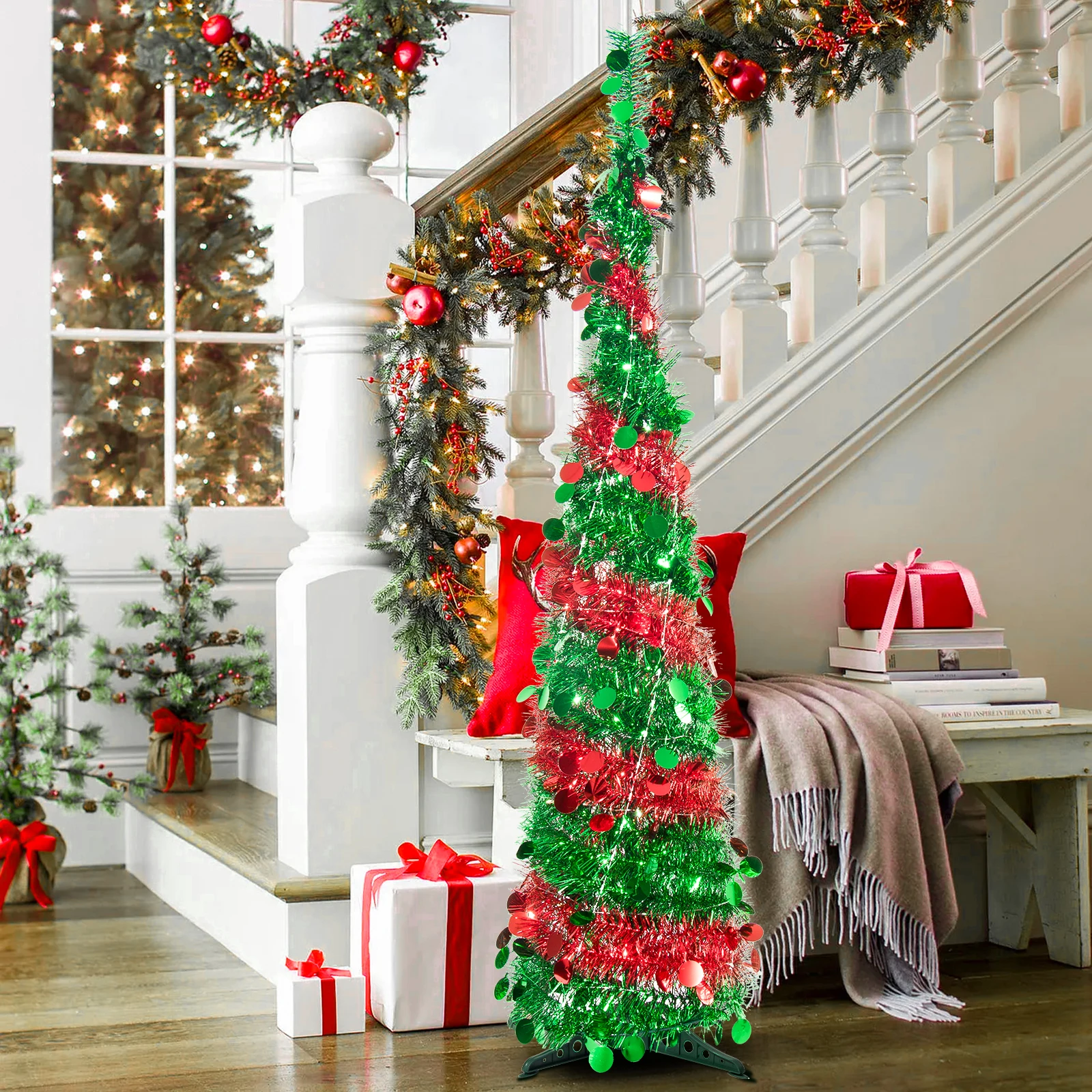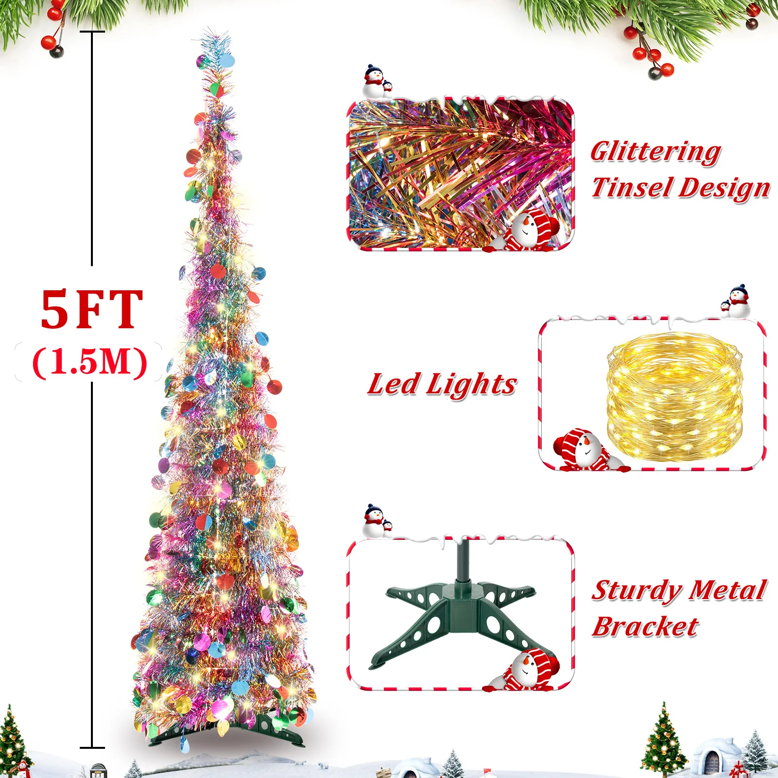 Pop Up Tinsel Christmas Tree: The 5ft pop up green tree is made of PVC material and metal stand. You can trust that your tree will remain upright throughout the holiday season.