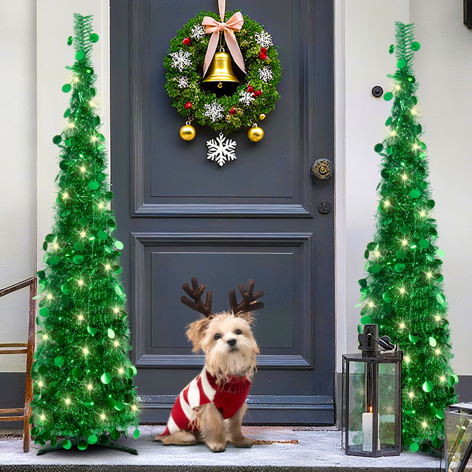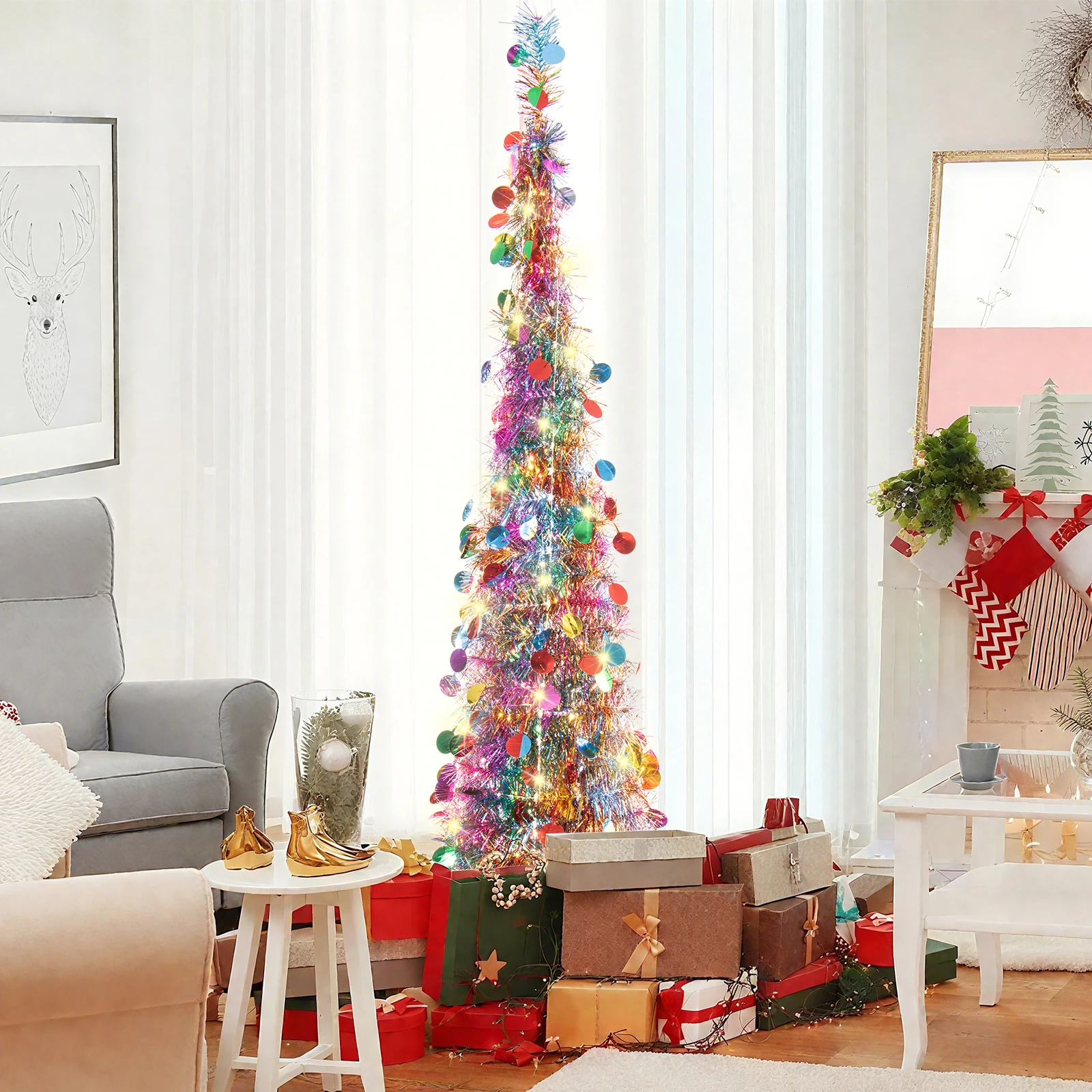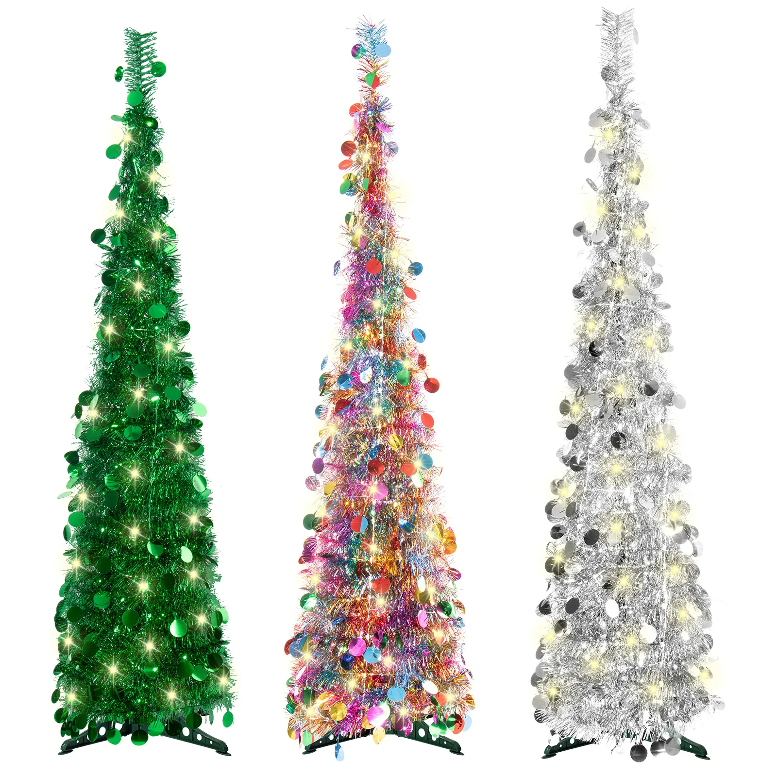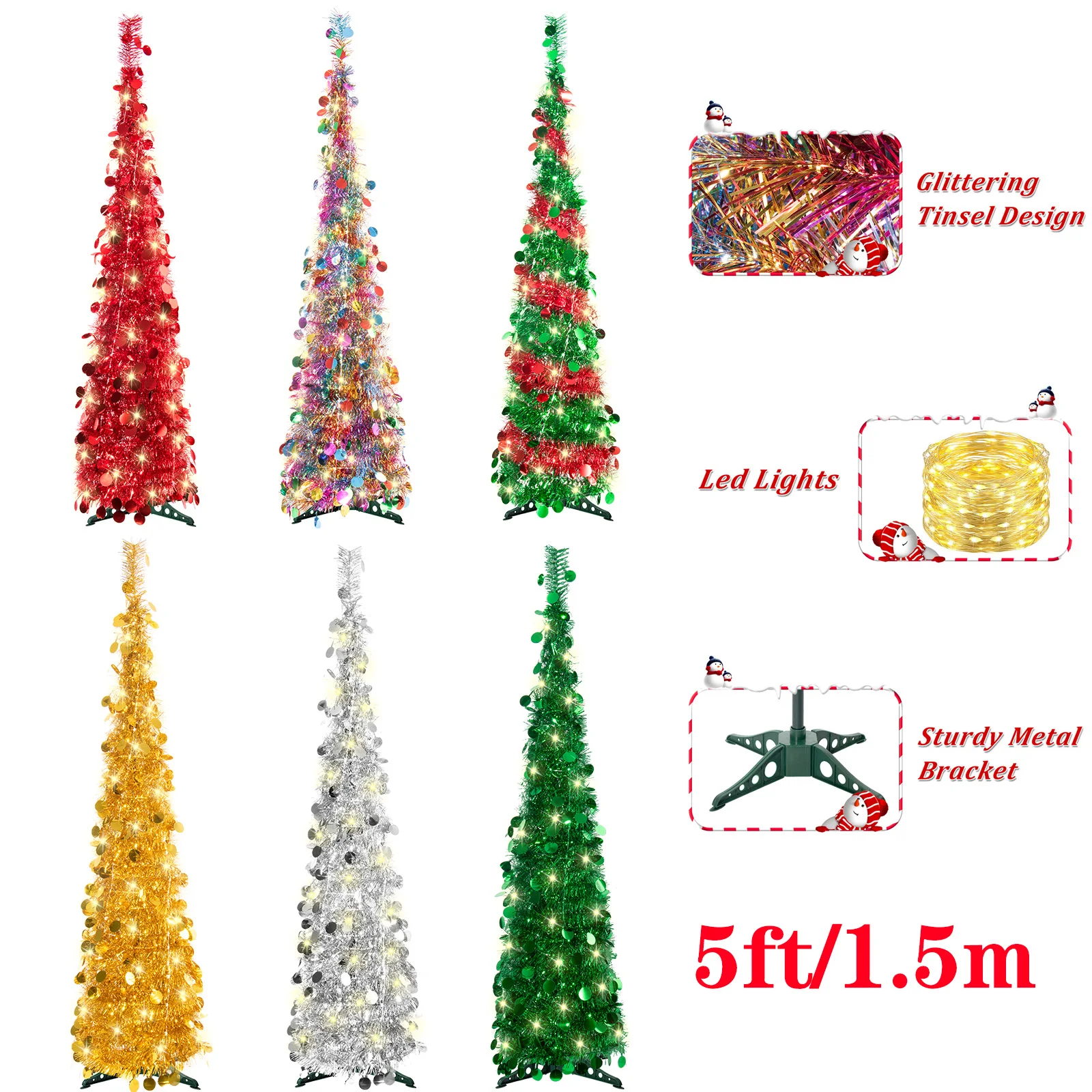 Pop Up Tinsel Christmas Tree: The 5ft pop up green tree is made of PVC material and metal stand. You can trust that your tree will remain upright throughout the holiday season.