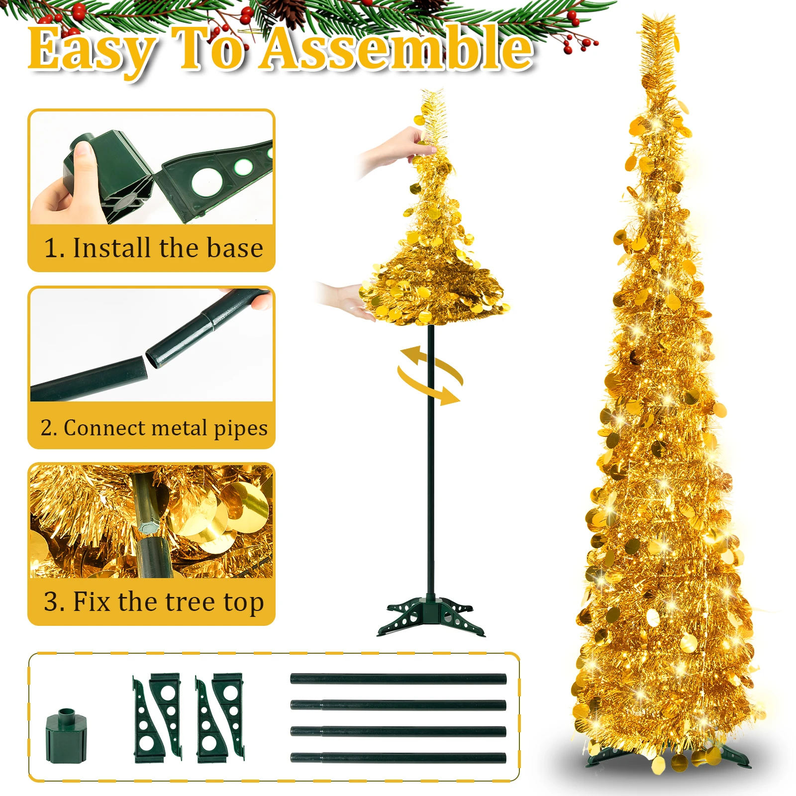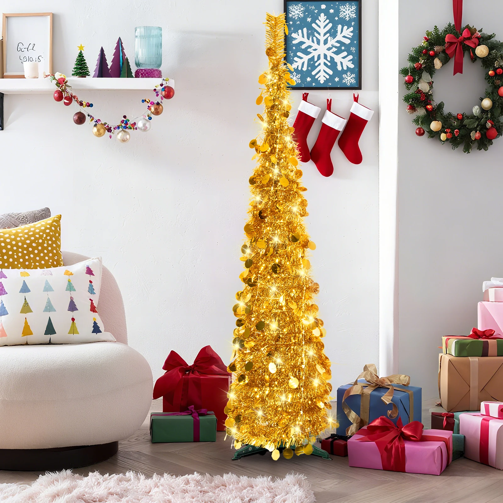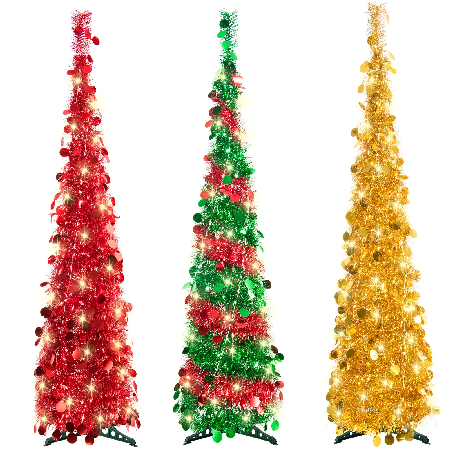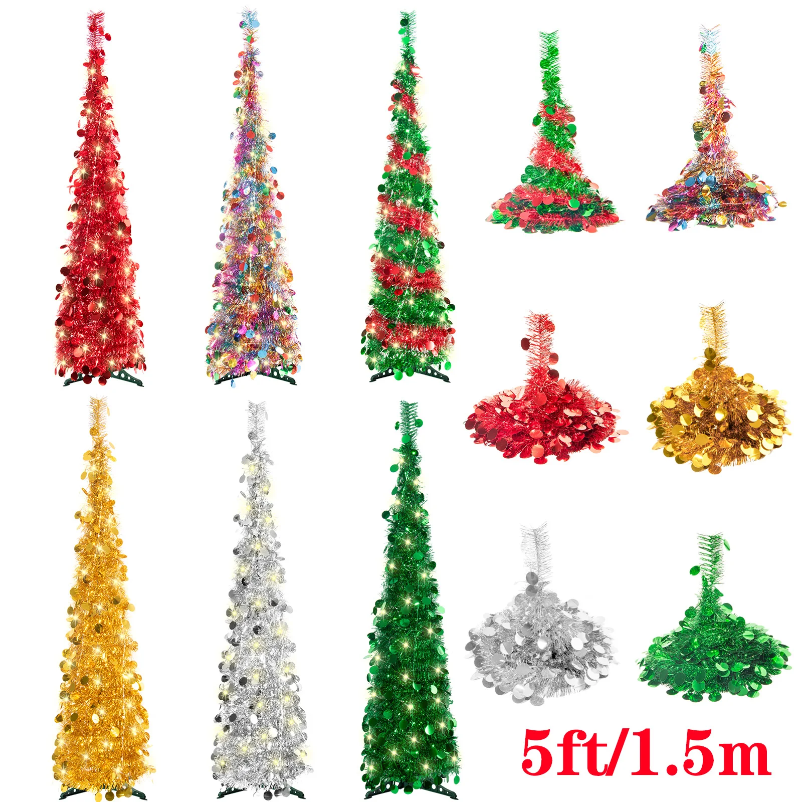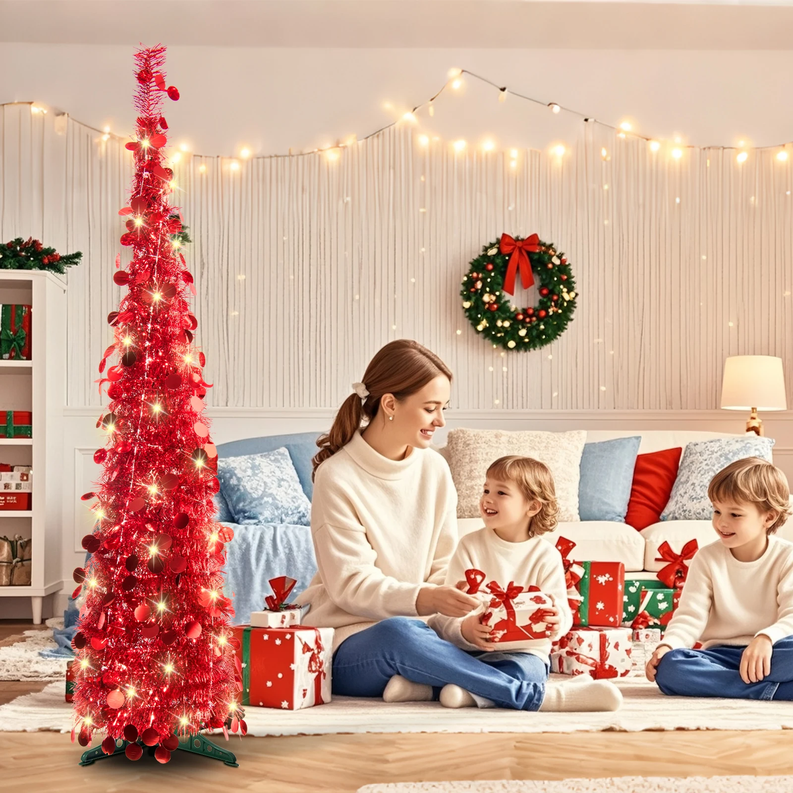 Pop Up Tinsel Christmas Tree: The 5ft pop up green tree is made of PVC material and metal stand. You can trust that your tree will remain upright throughout the holiday season.