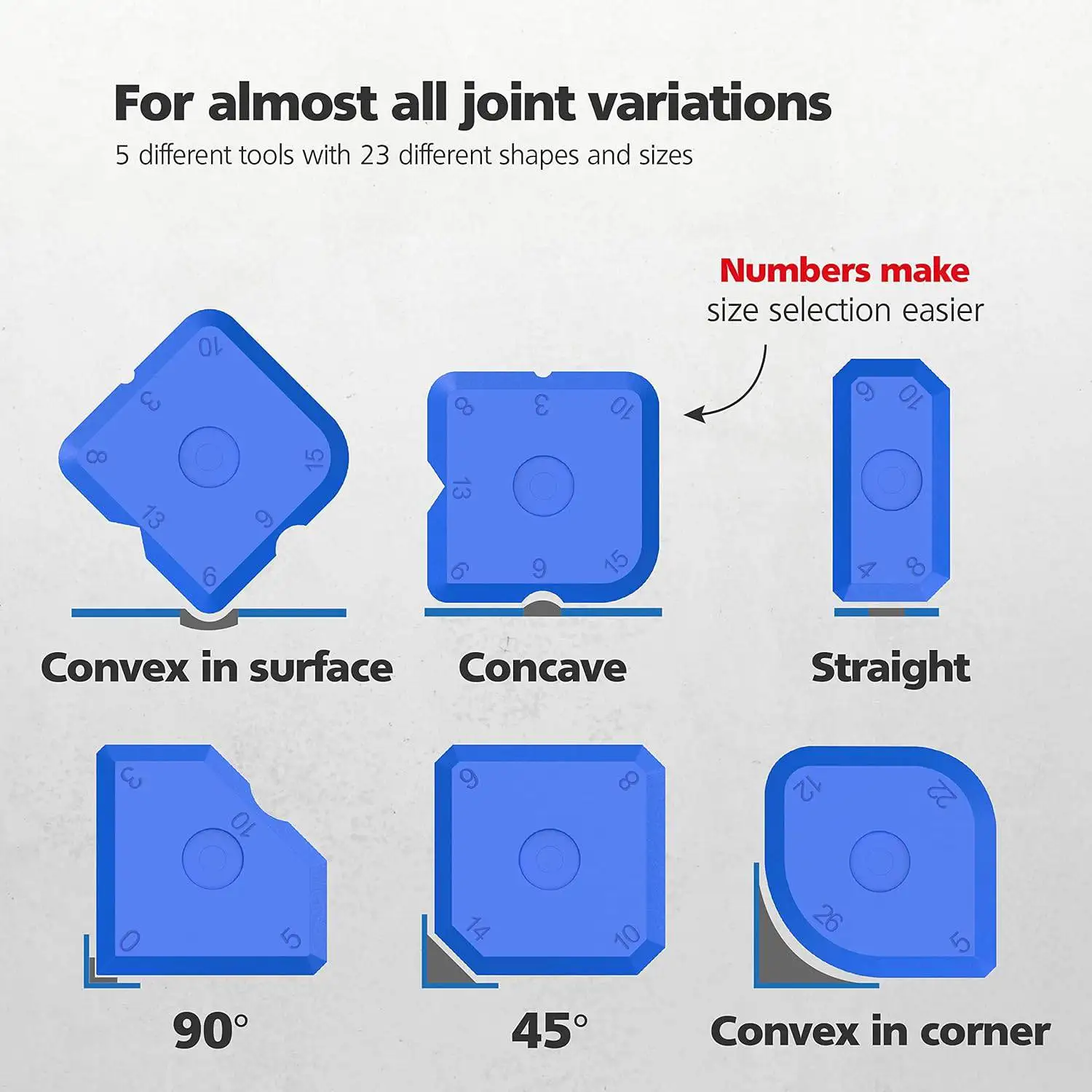 2. Five different trowels offer 23 unique shapes and sizes suitable for nearly all types of joints, with markings that make it easy to find the right size.