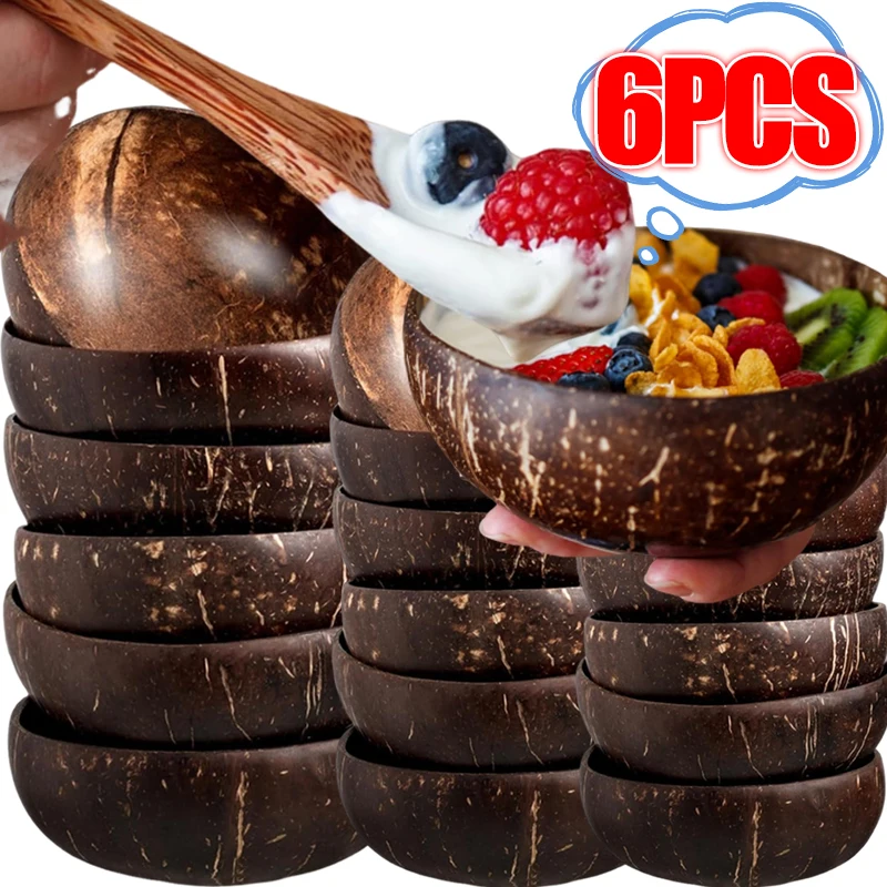 6/1PCS Natural Coconut Bowl set wooden Salad Ramen bowl Coconut Wood Spoon Set coco smoothie Kitchen tableware Coconut bowl
