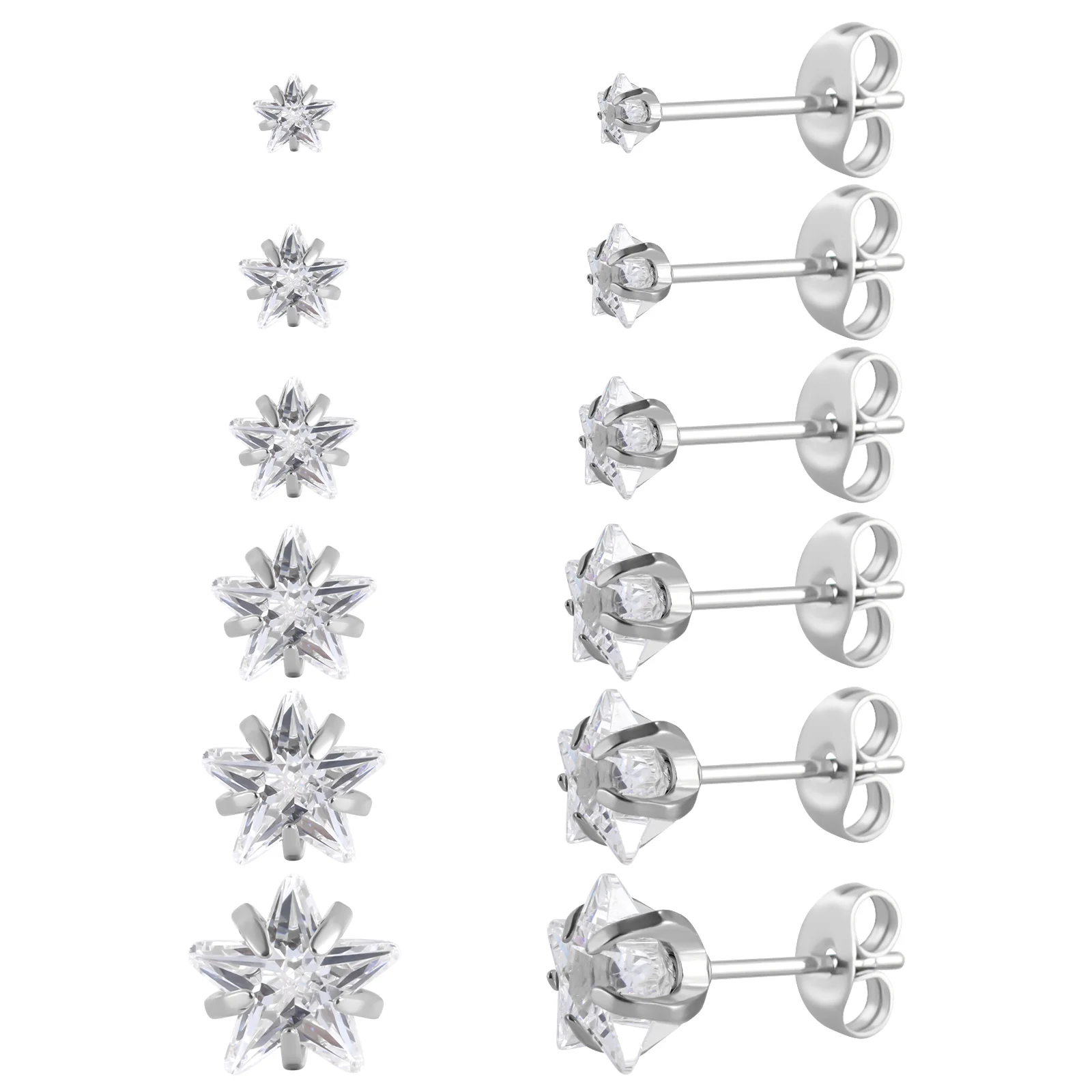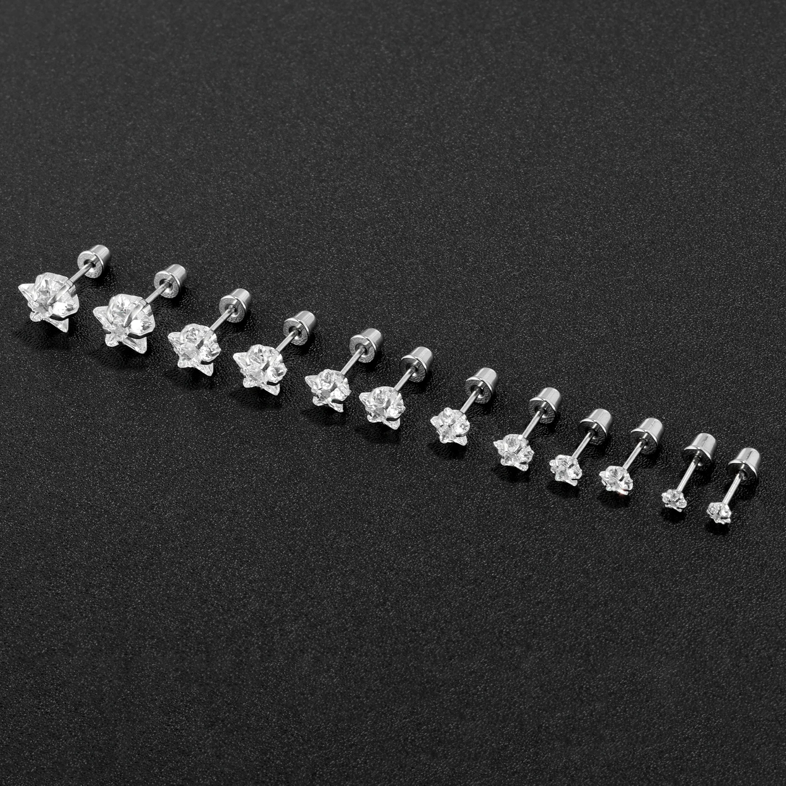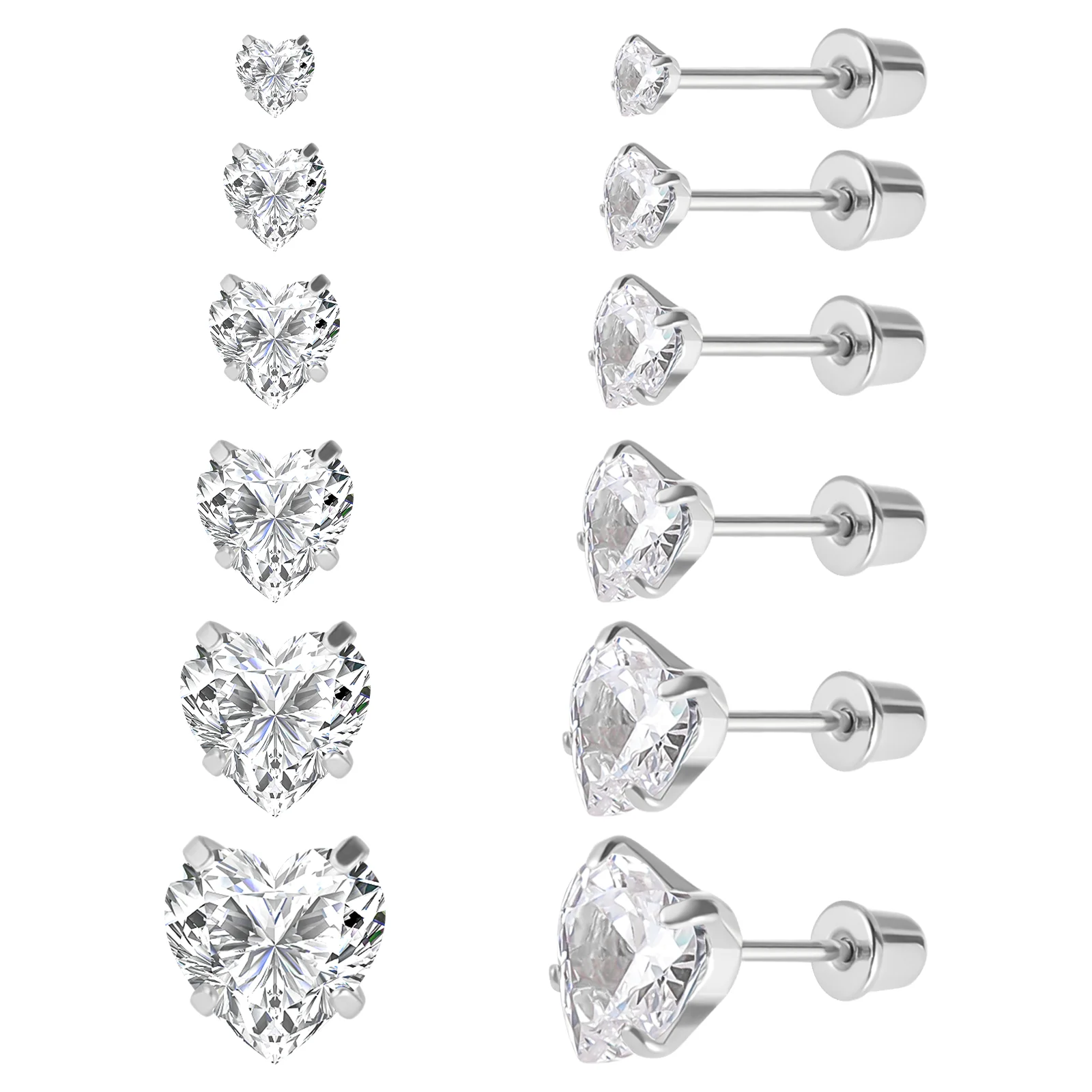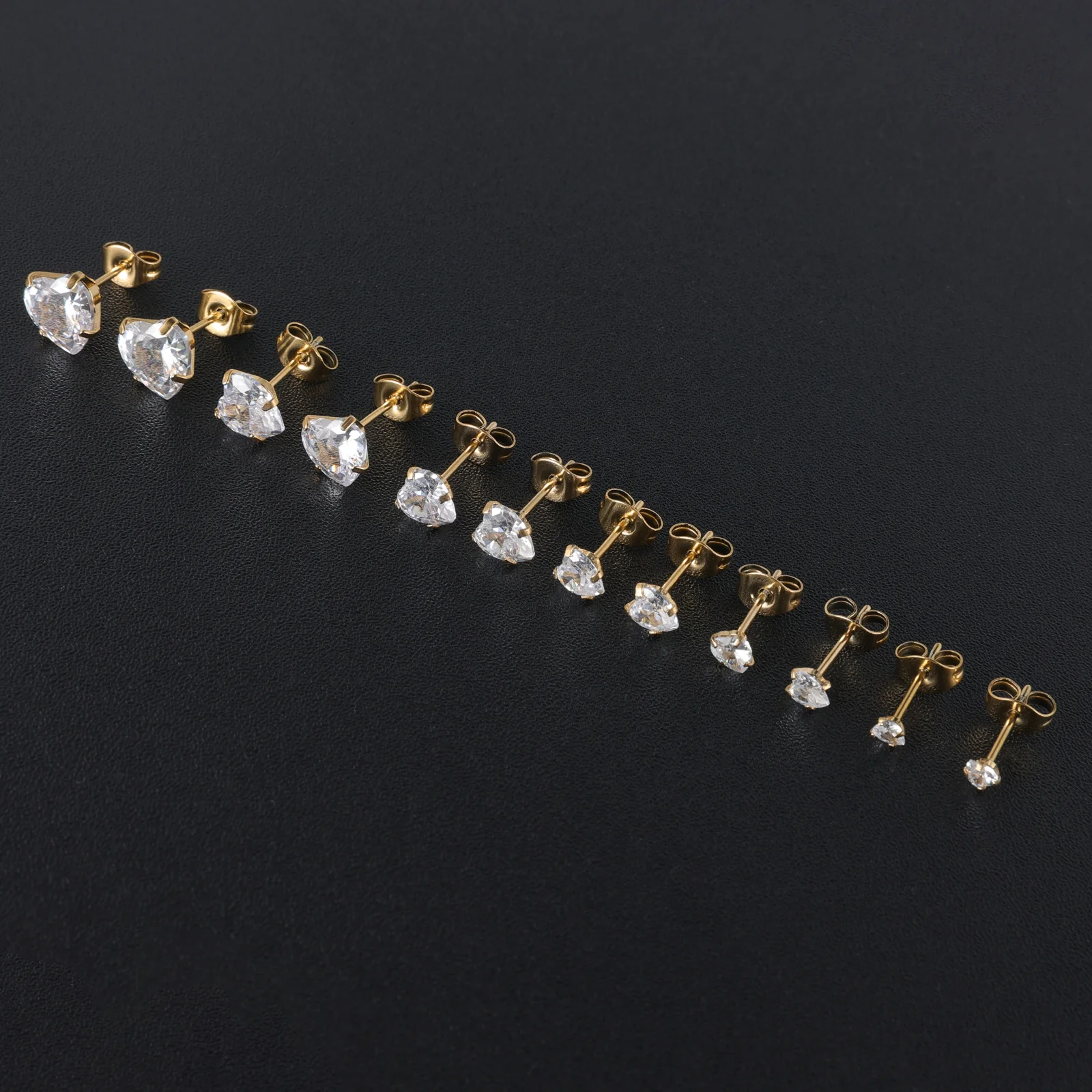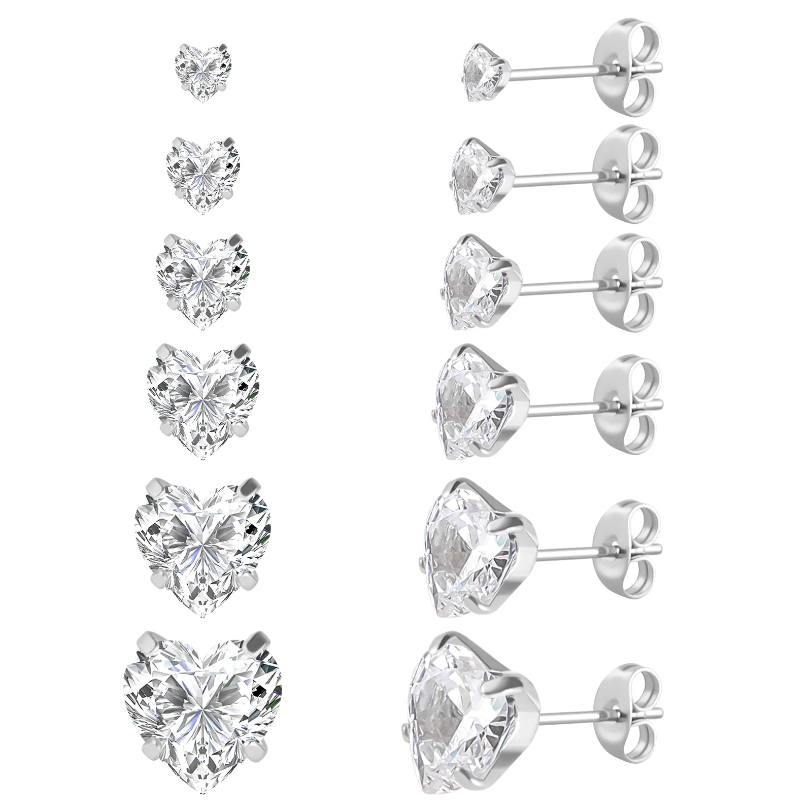 One order you can get 6 pairs CZ stud earrings. It included sizes of 3mm/4mm/5mm/6mm/7mm/8mm; Good choice for anyone with  multiple ears piercings or needs of multiple sizes. We provide heart Star square and round shape stud earrings for your selections