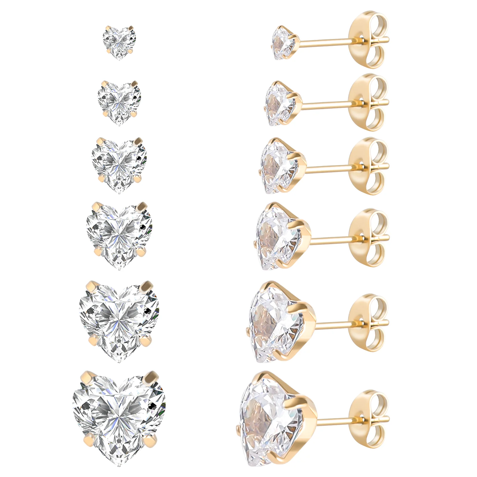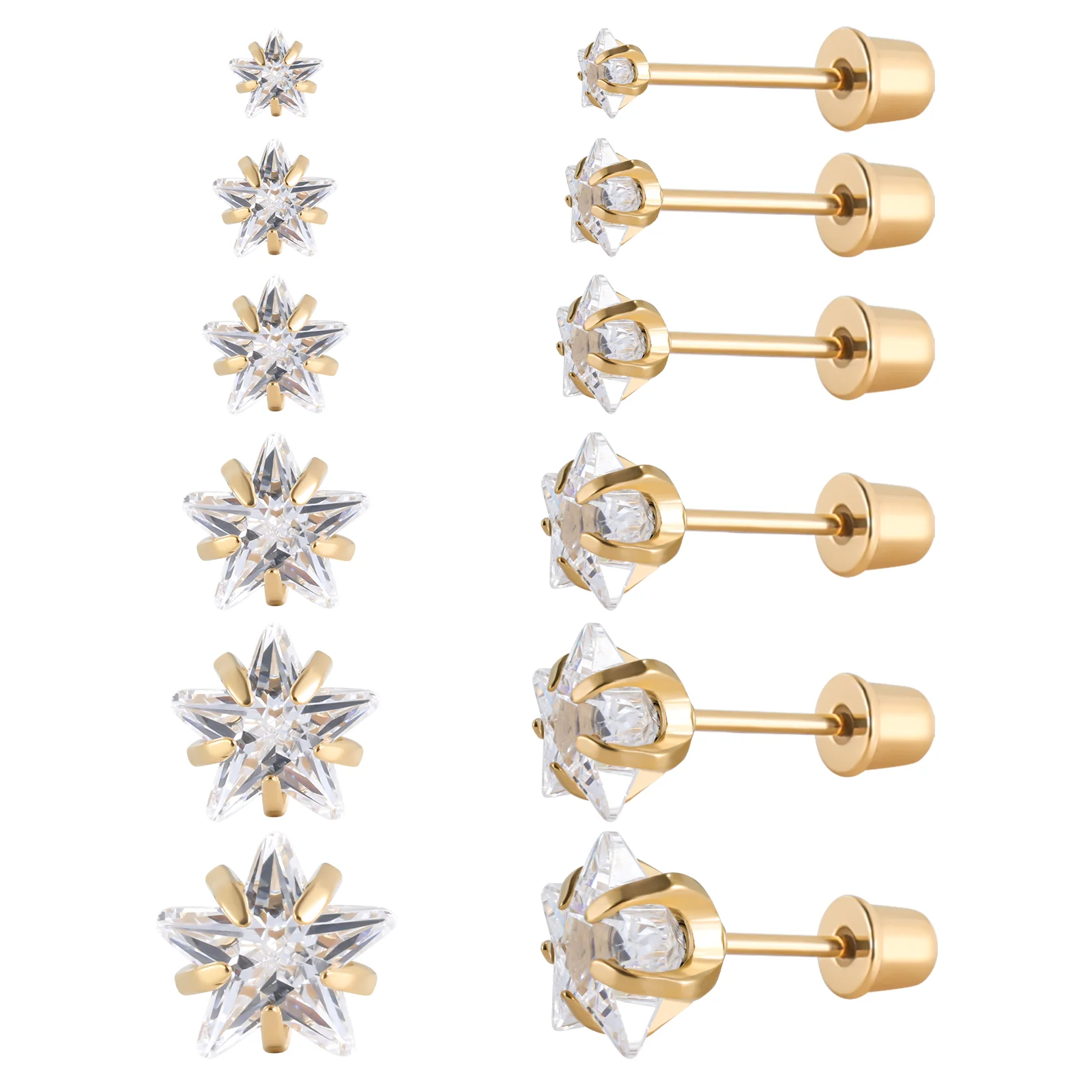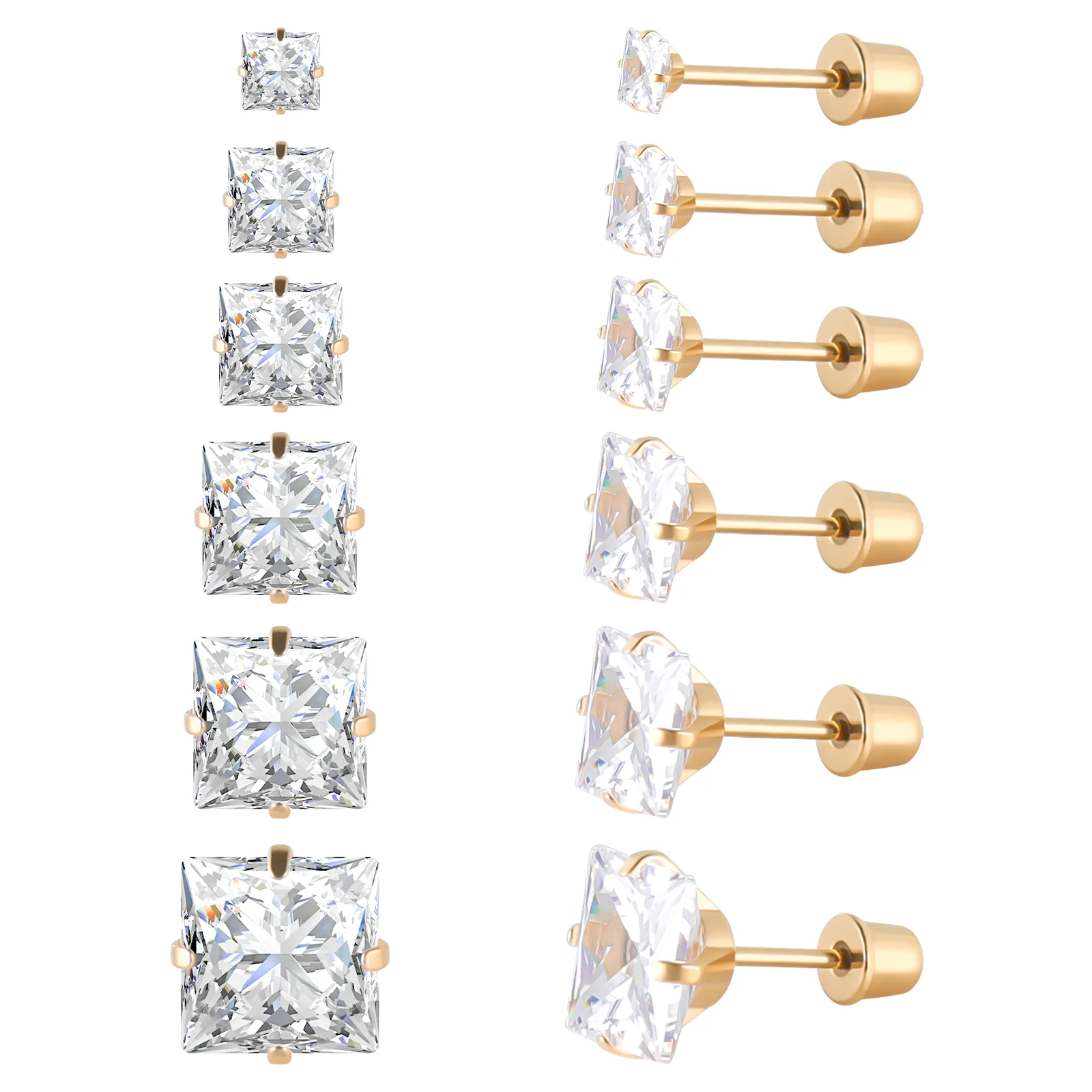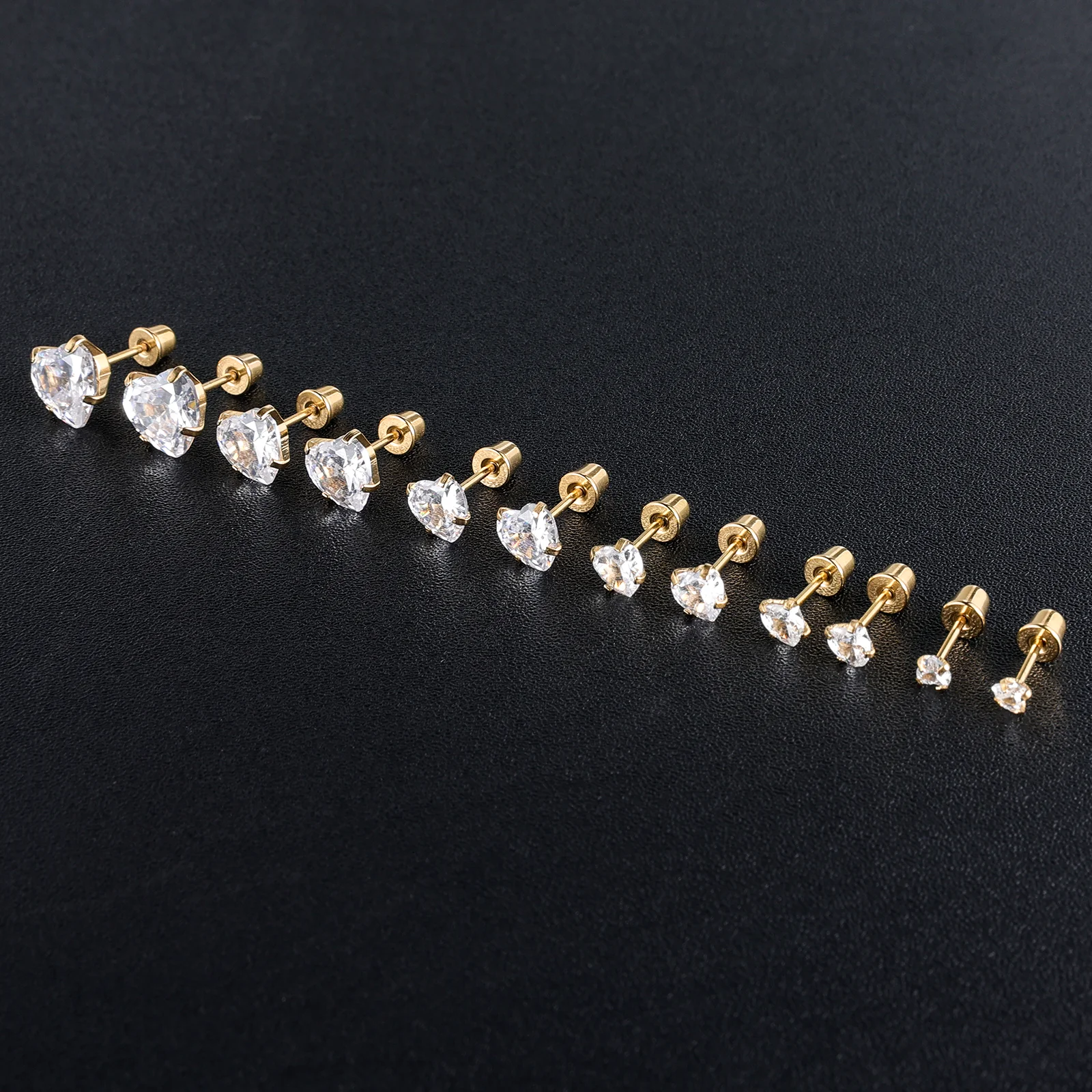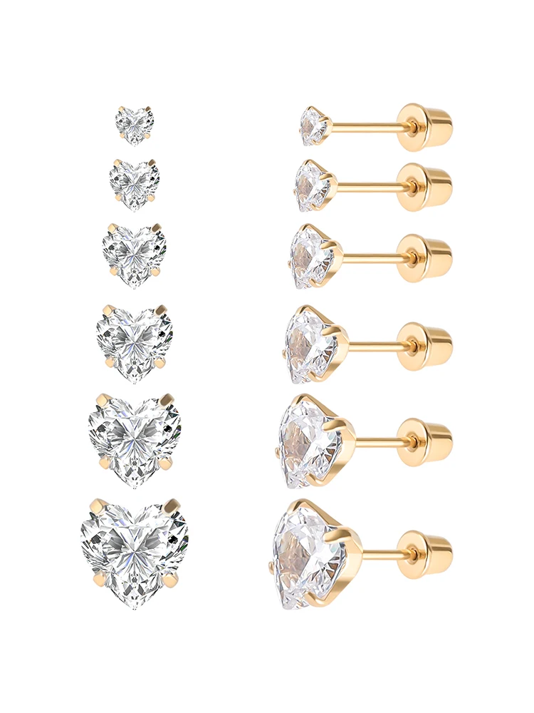 6 Pairs Stainless Steel Screw back Stud Earring, Gold Plated Heart Star Square Princess Cut Round Cubic Zirconia CZ Stud Set
