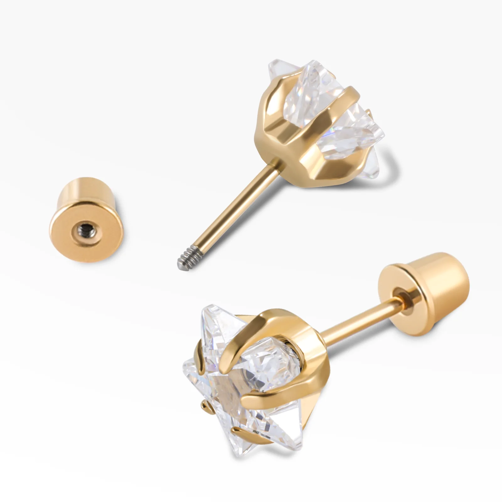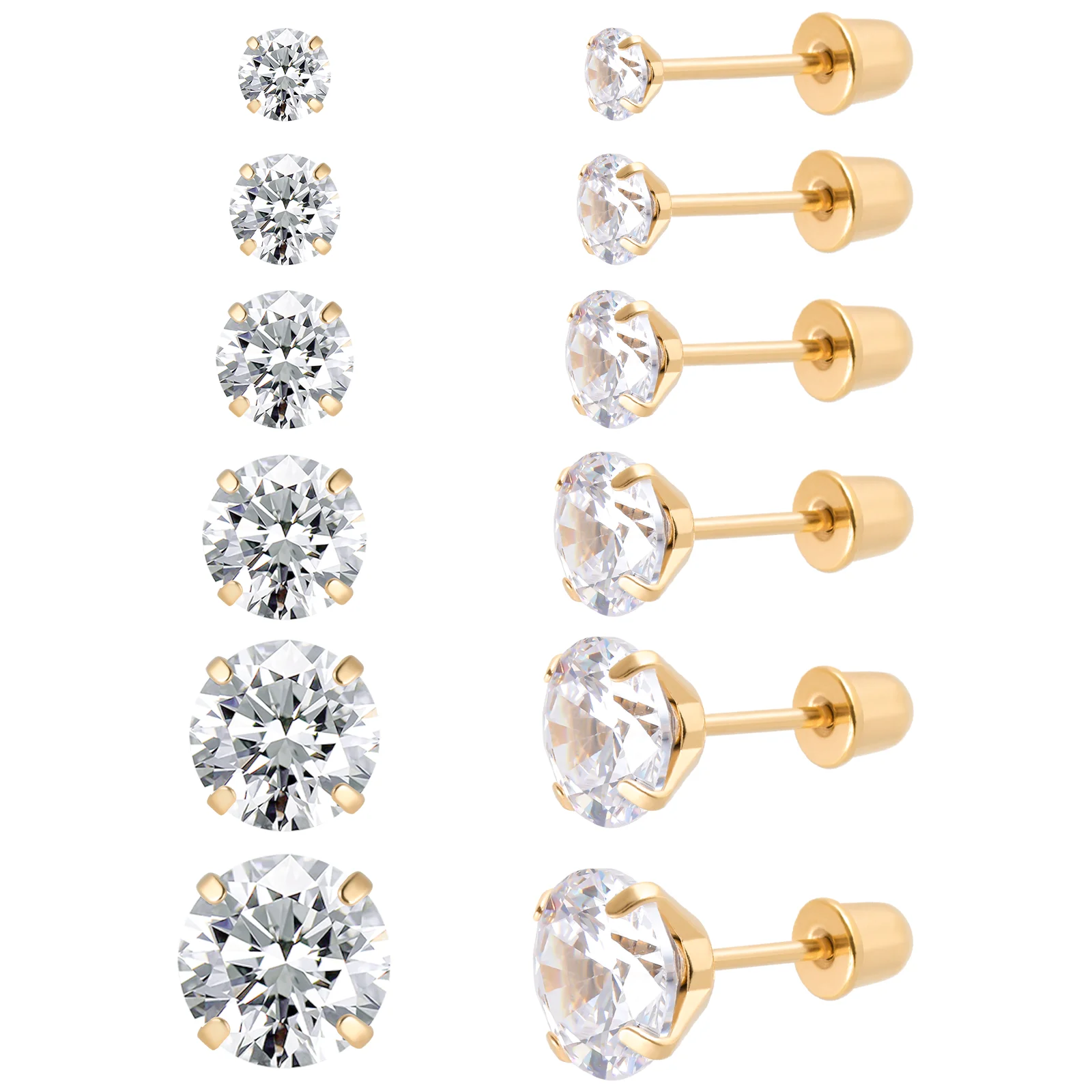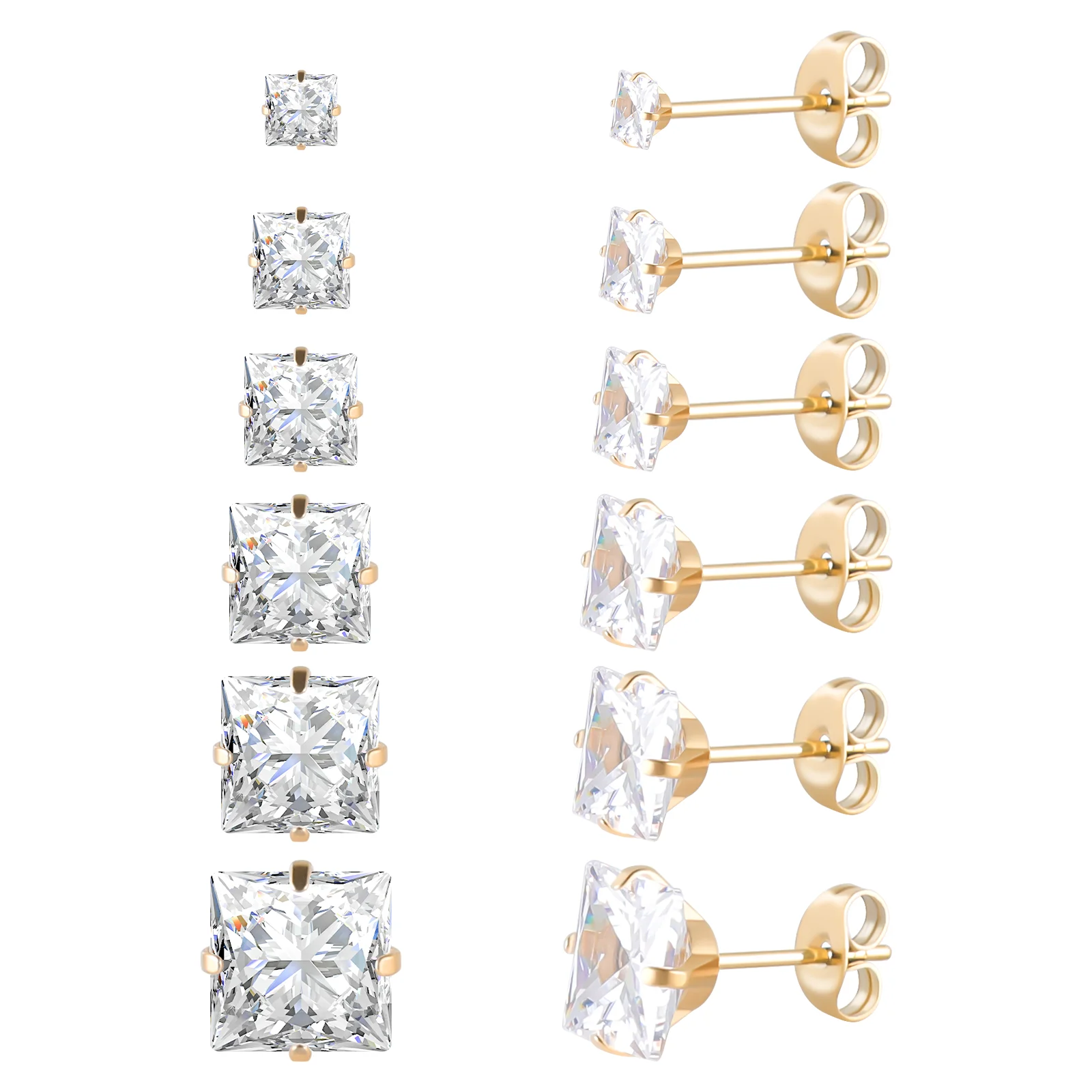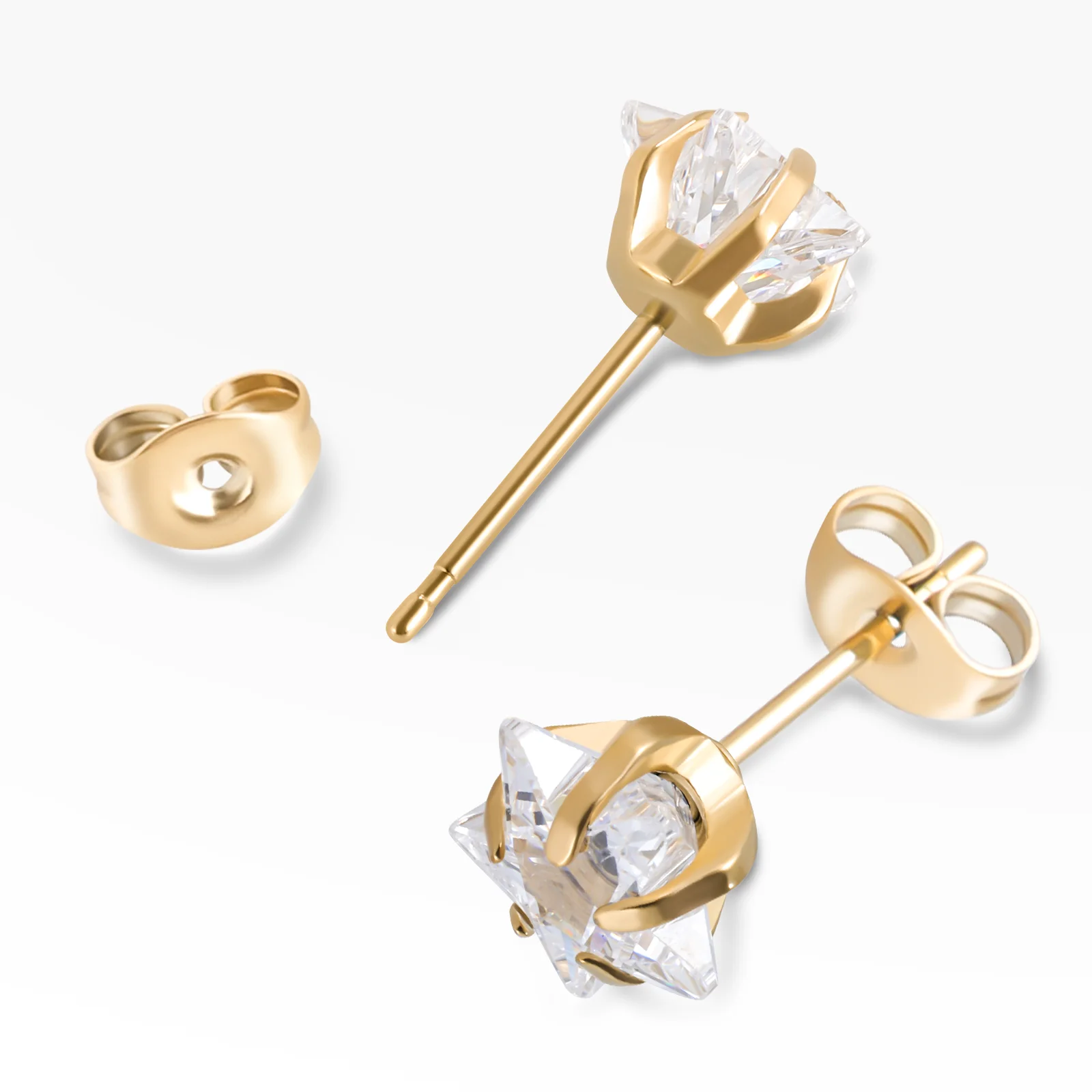 6 Pairs Stainless Steel Screw back Stud Earring, Gold Plated Heart Star Square Princess Cut Round Cubic Zirconia CZ Stud Set