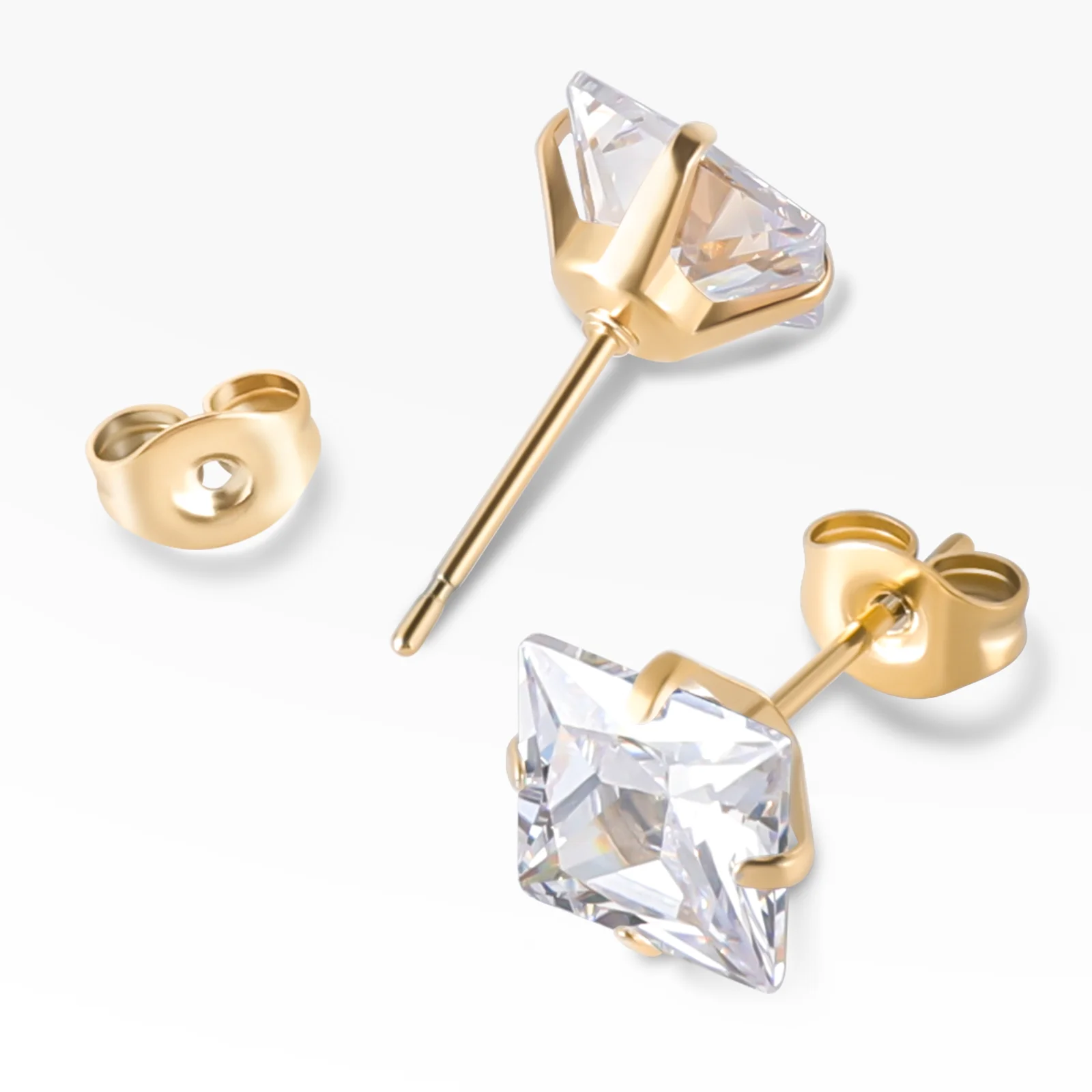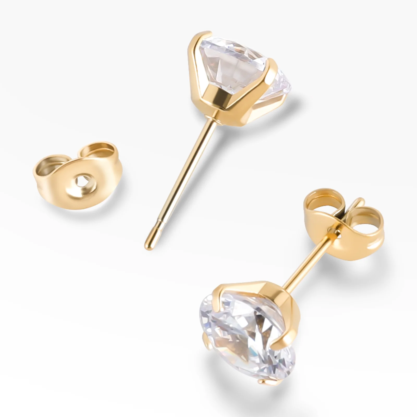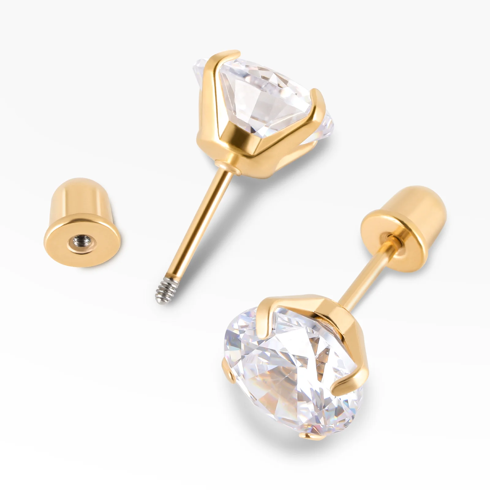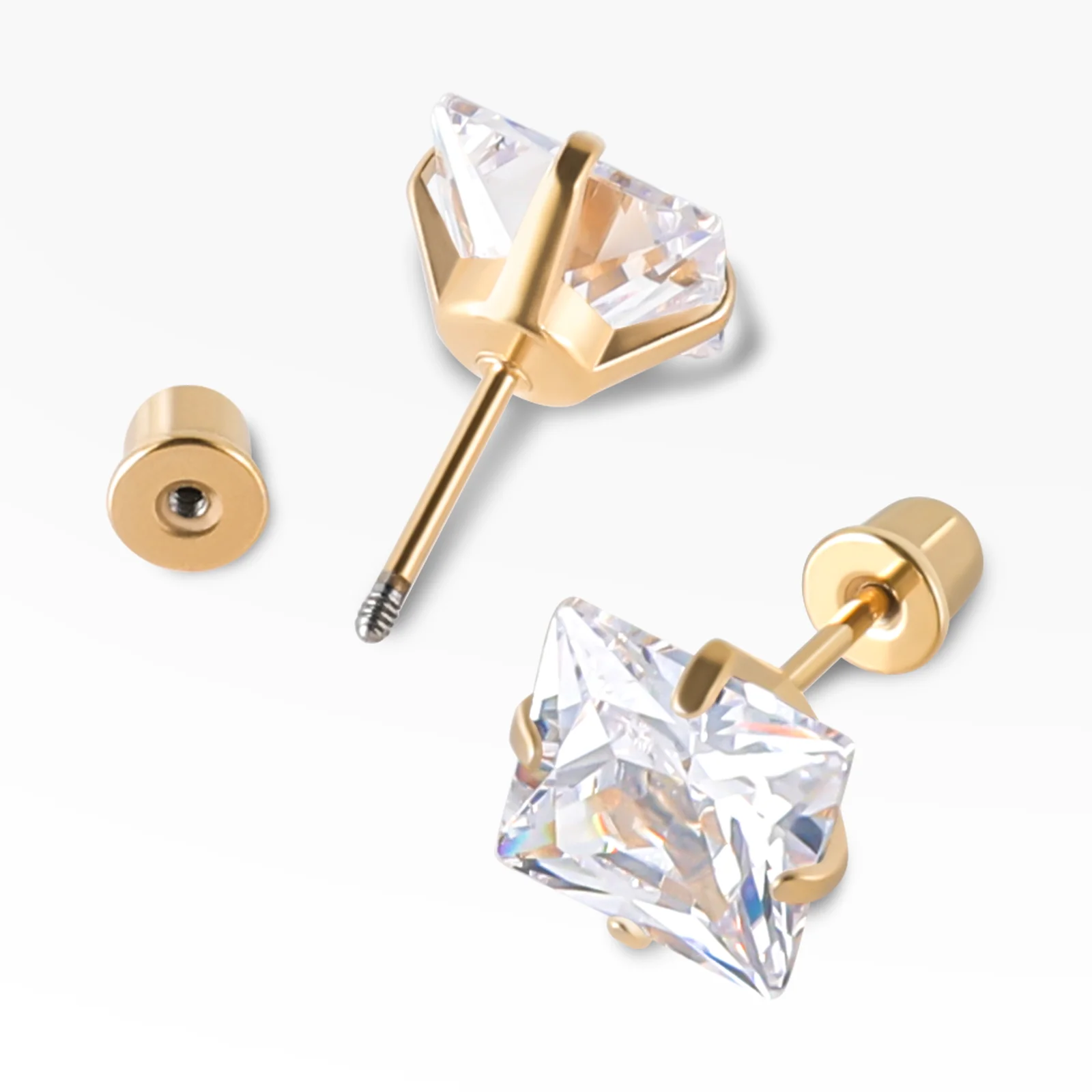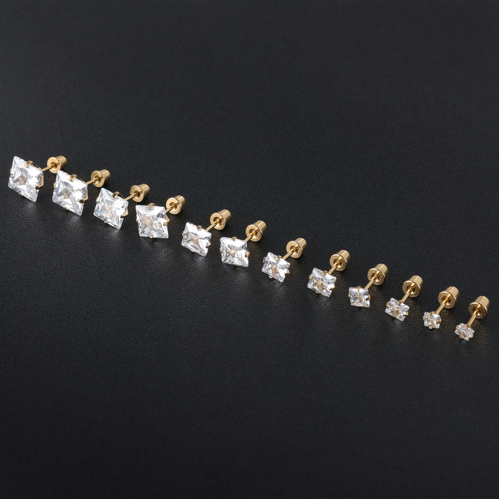 6 Pairs Stainless Steel Screw back Stud Earring, Gold Plated Heart Star Square Princess Cut Round Cubic Zirconia CZ Stud Set