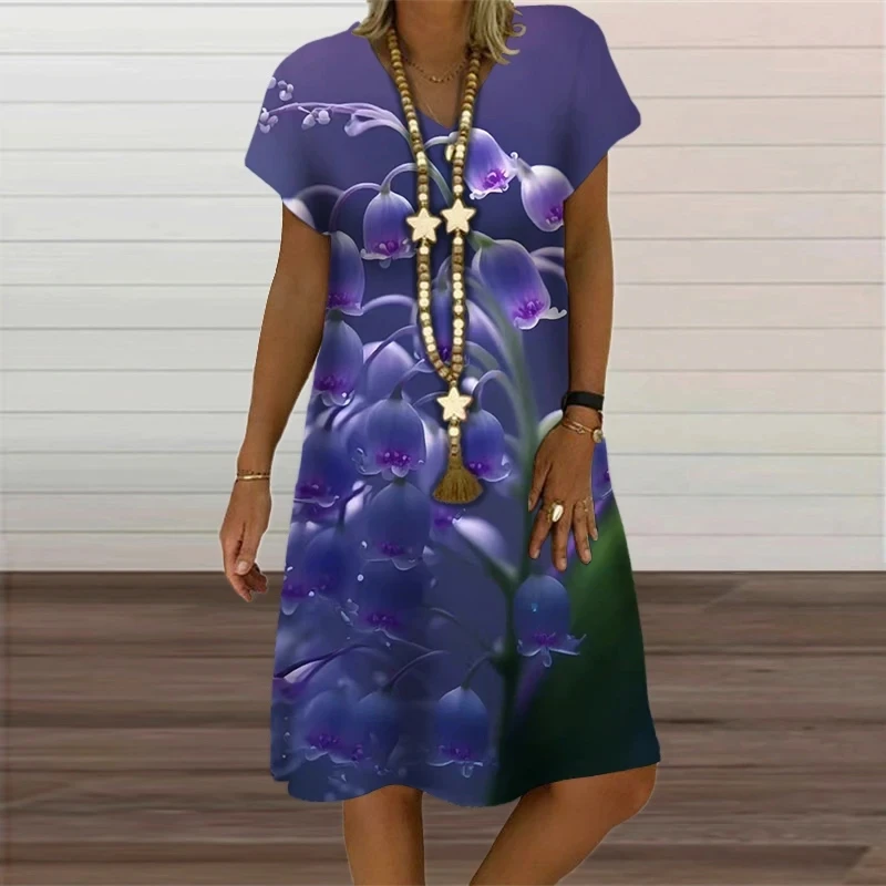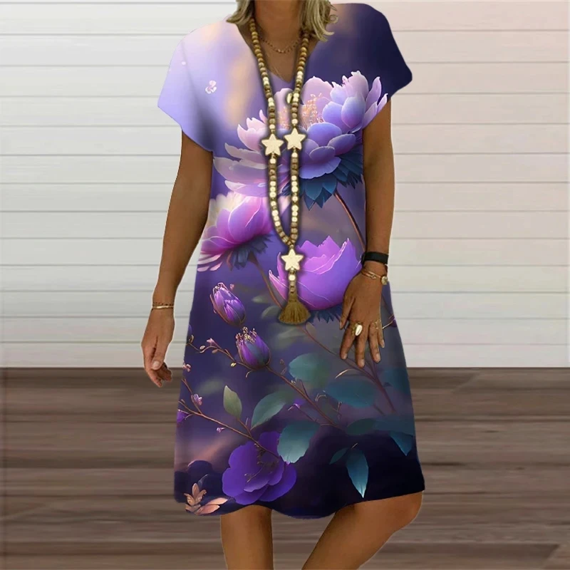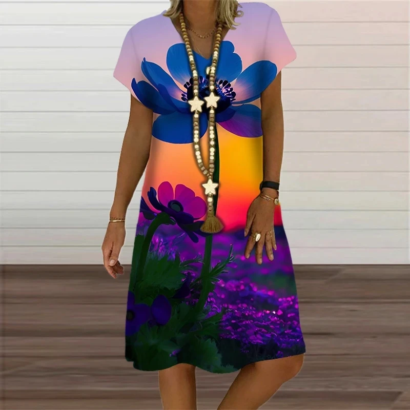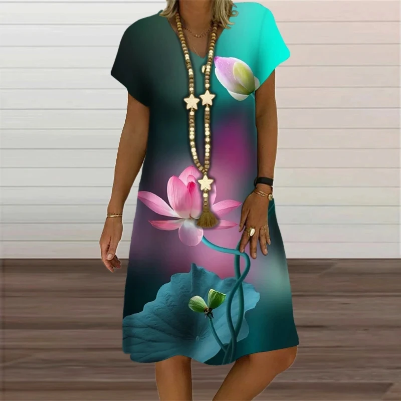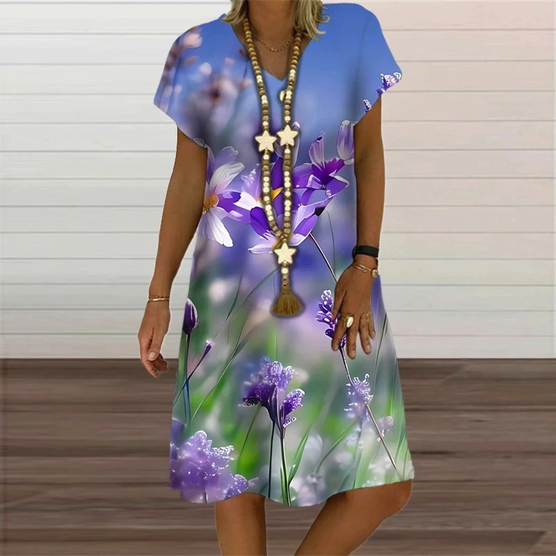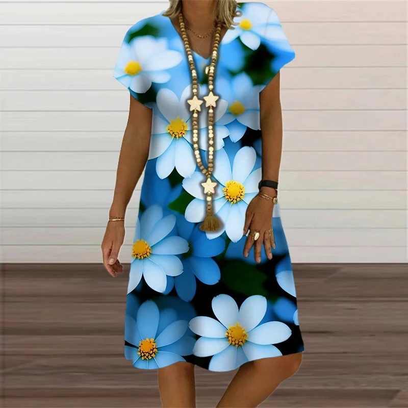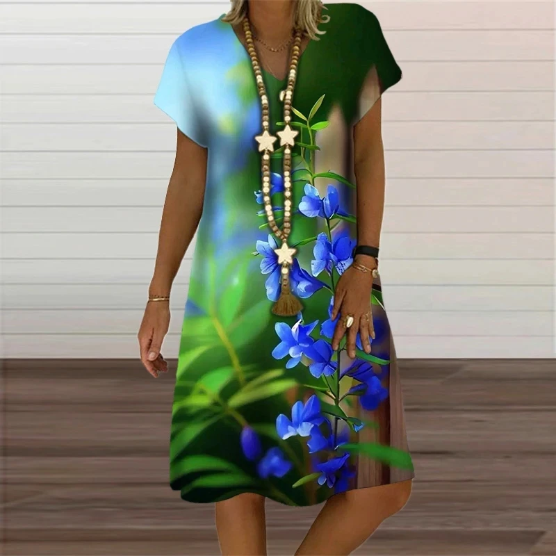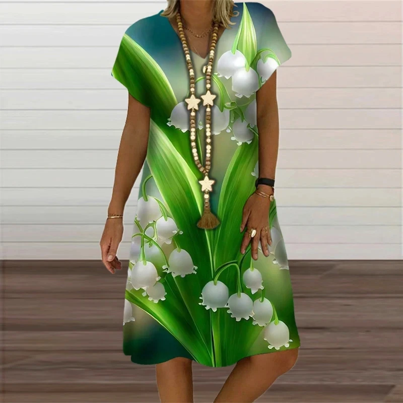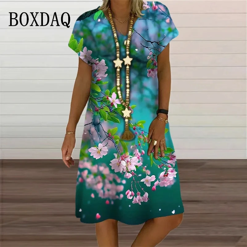 6XL Summer Plus Size Dresses Women Plant Flower Print Loose Dress Casual V-Neck Short Sleeve Knee-Length Dress Vestidos Sundress