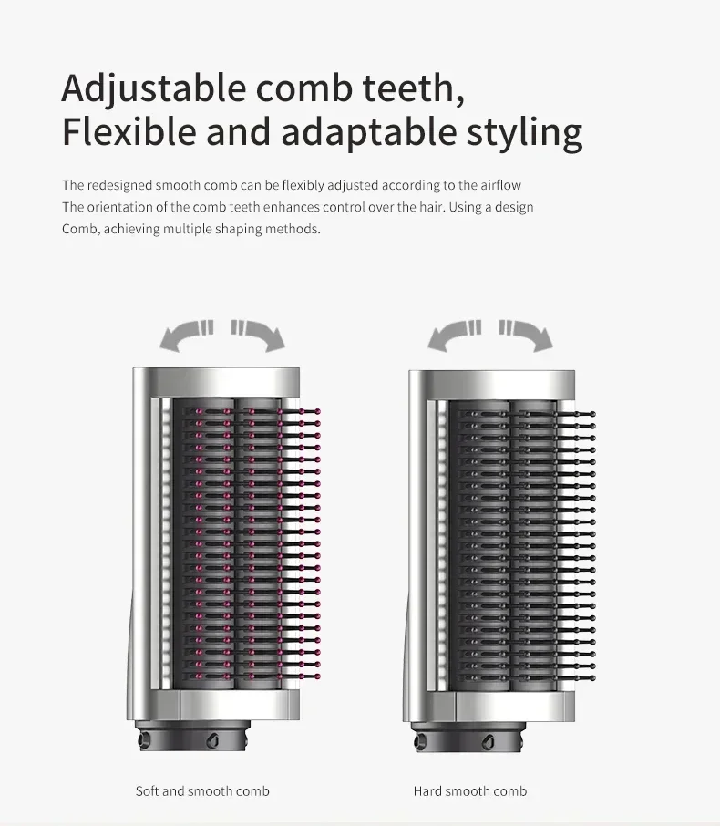 Dual-configuration comb teeth (rigid/soft, optional accessory).