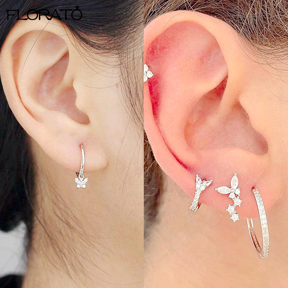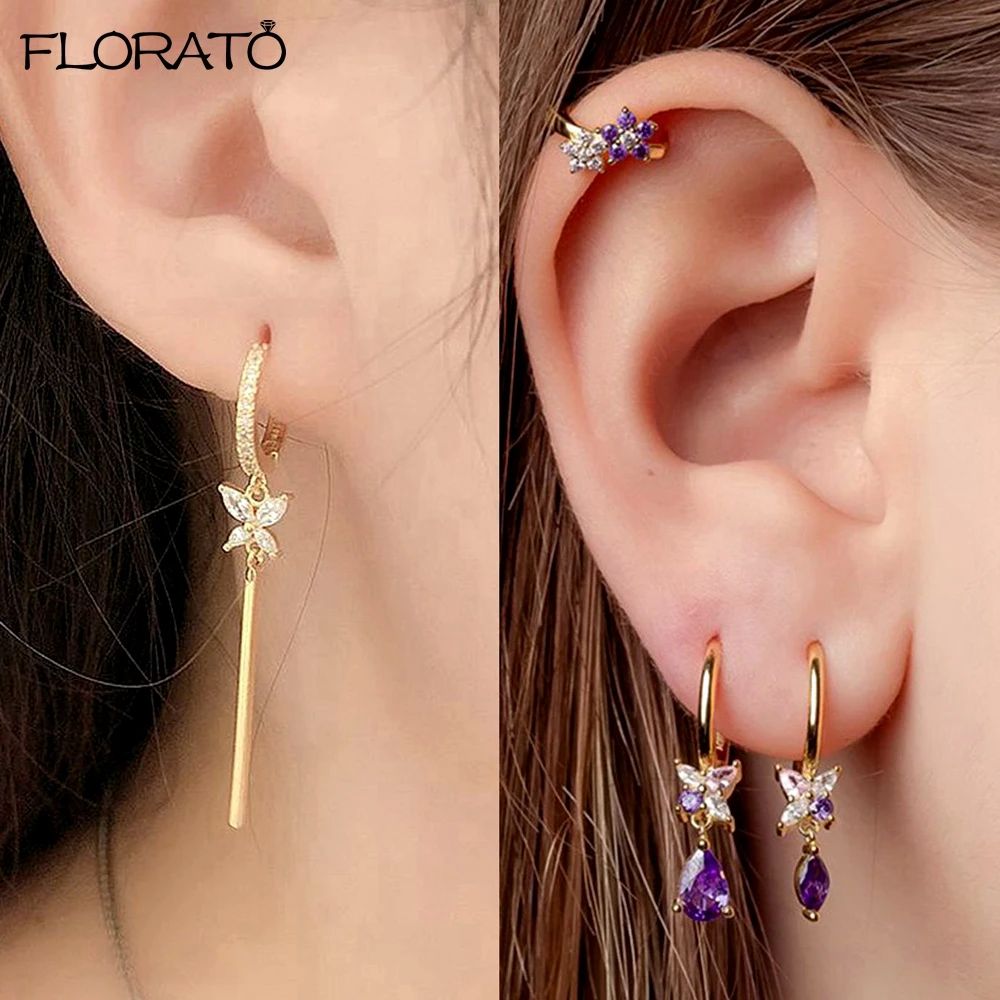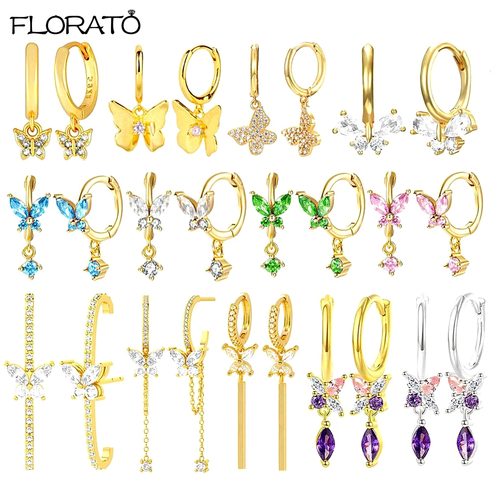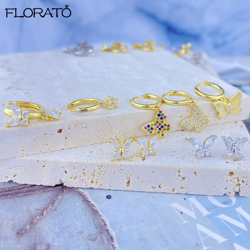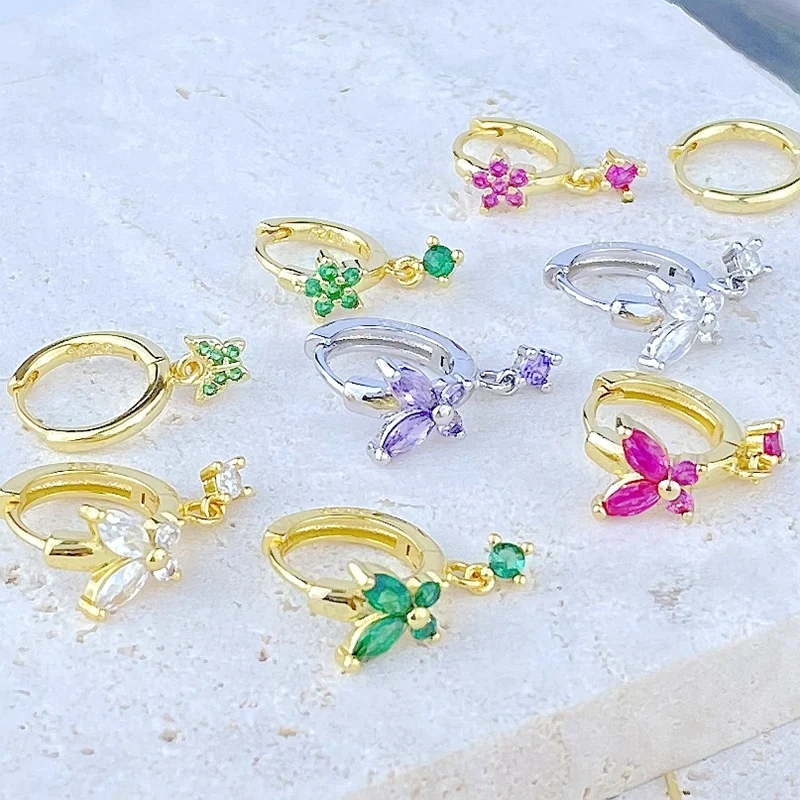 925 Sterling Silver Ear Needle Cute Crystal Butterfly Pendant Hoop Earrings for Women Colorful Flower Earrings Fashion Jewelry