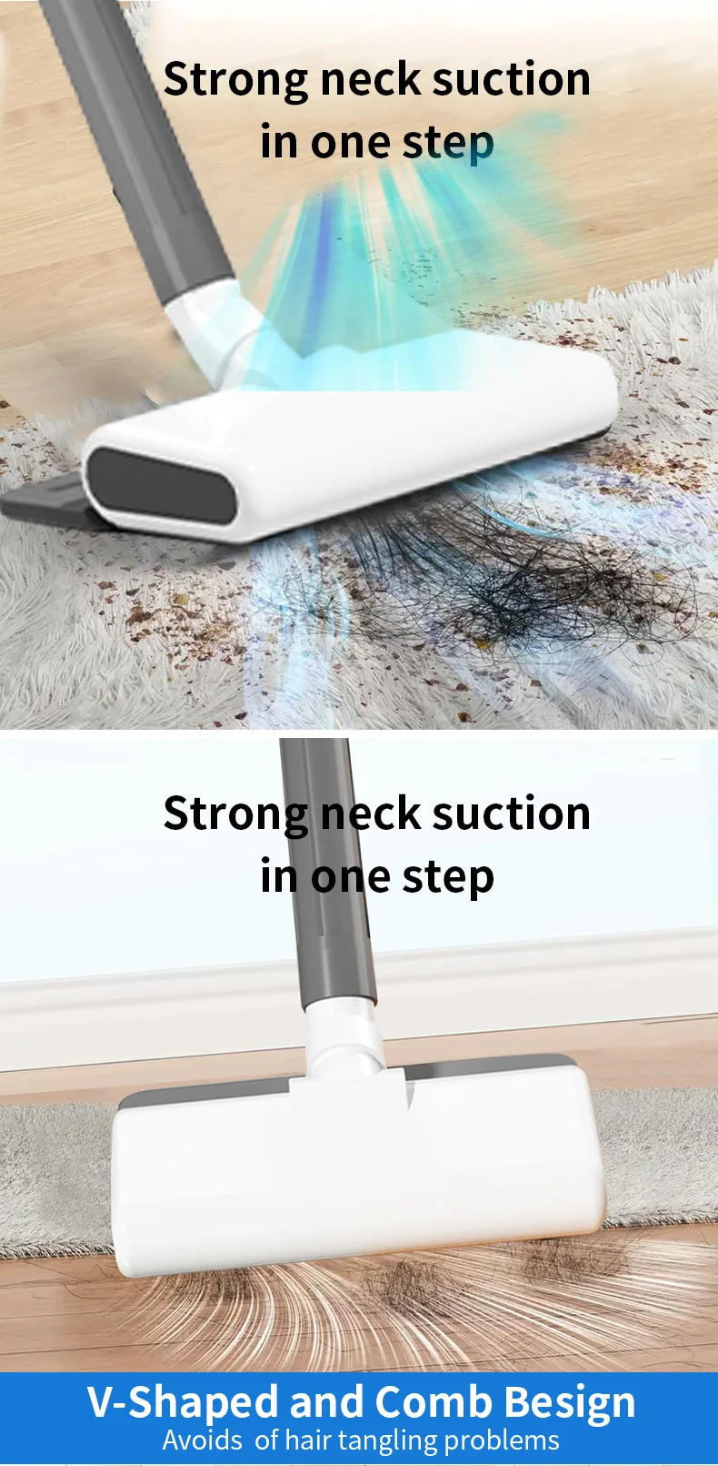 [De-tangle Design] The cleaner head with an de-tangle comb can lift all the long hair and dirt from carpets or hard floors.