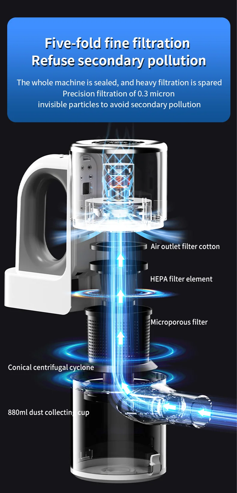 [Advanced System Filters] With the 4 stage advanced filter system, it efficiently captures 99.99% of dust particles as small as 0.1um to avoid secondary pollution。
