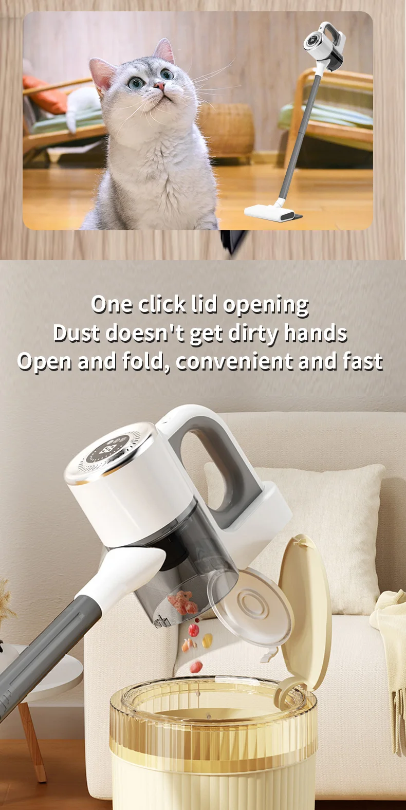 [1.4L XL Dust Cup] stick vacuum cleaner is equipped with a 1.4L big dust cup and one-click emptying of the dustbin after cleaning, never need to touch the mess.