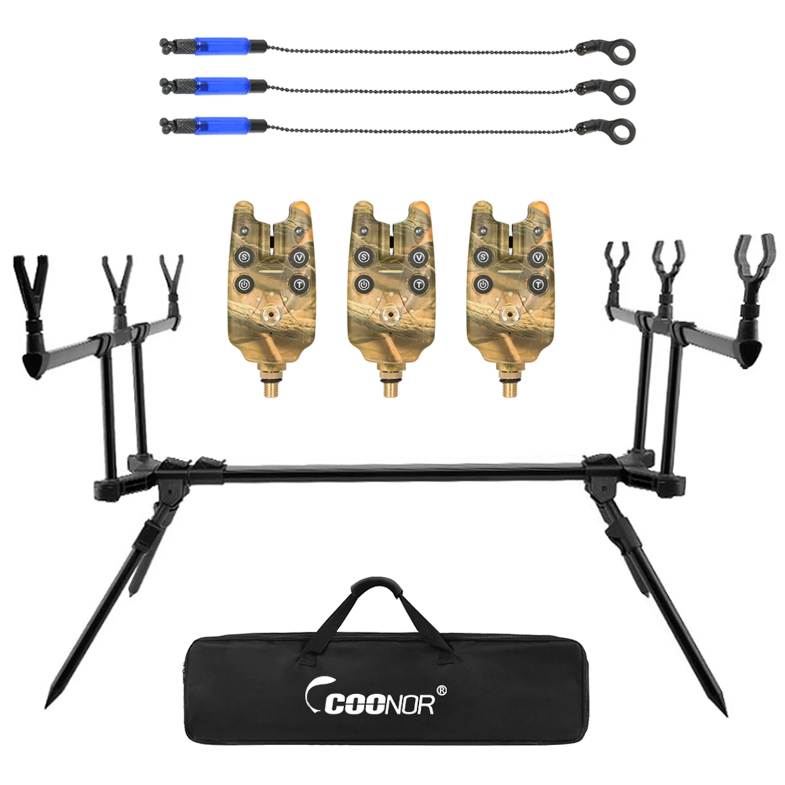 This fishing tool set includes an adjustable fishing rod stand, 3 fishing bite alarms and 3pcs fishing bait swingers, wonderful gift for fishing enthusiasts.