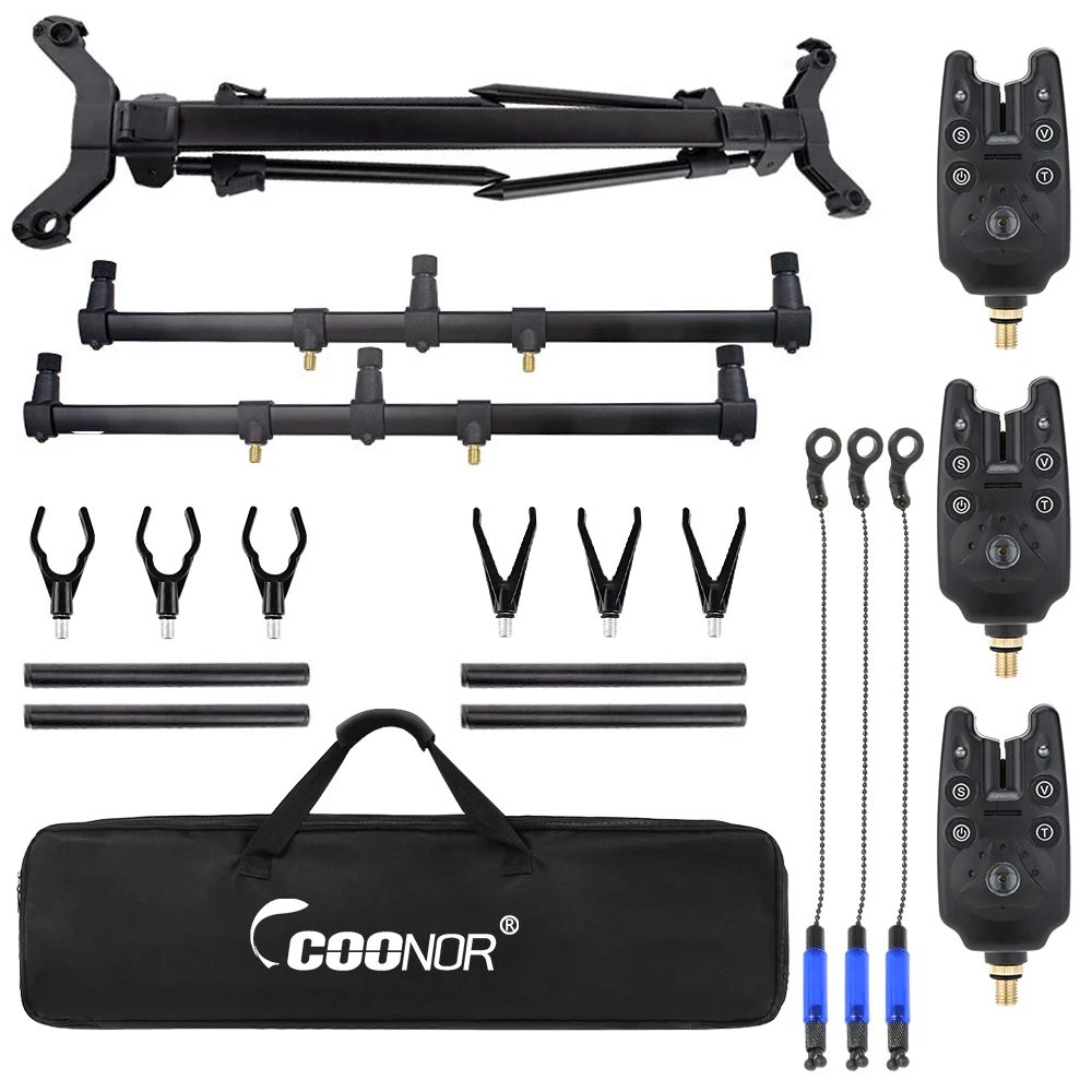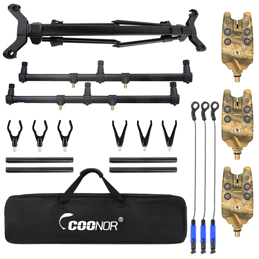 This fishing tool set includes an adjustable fishing rod stand, 3 fishing bite alarms and 3pcs fishing bait swingers, wonderful gift for fishing enthusiasts.