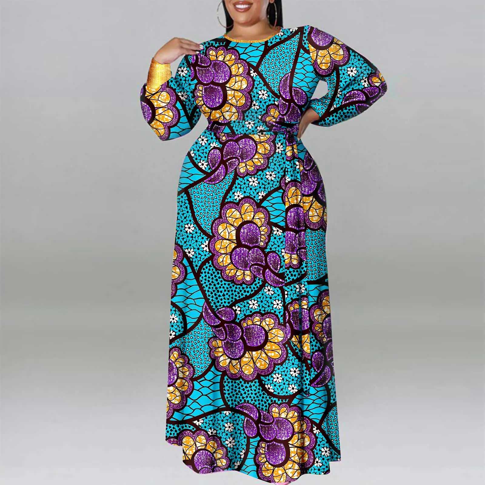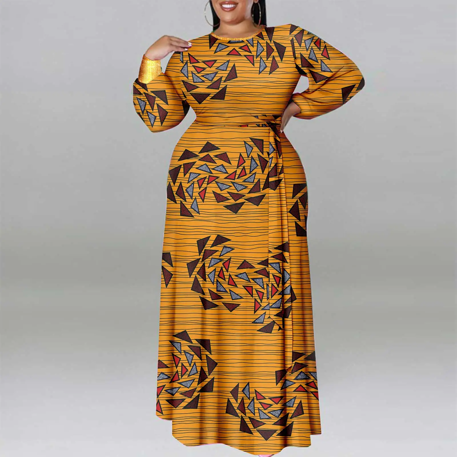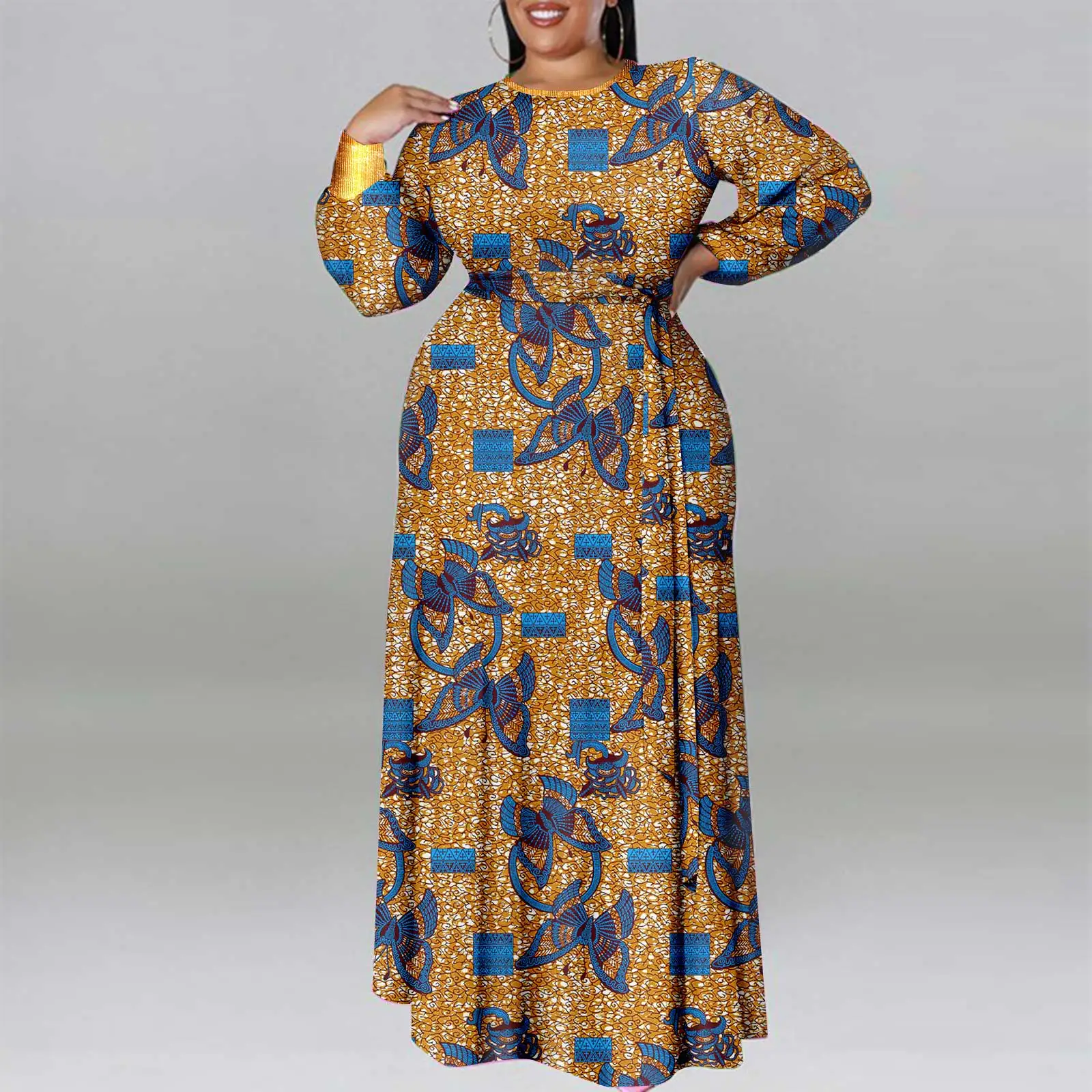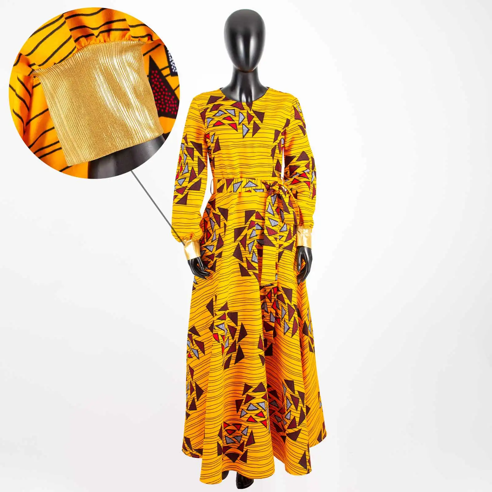 African Women’s Plus Size Dress Ankara Printed Fabric Gold Cuffs Accessory Belt Ankle Casual Dress A2325011