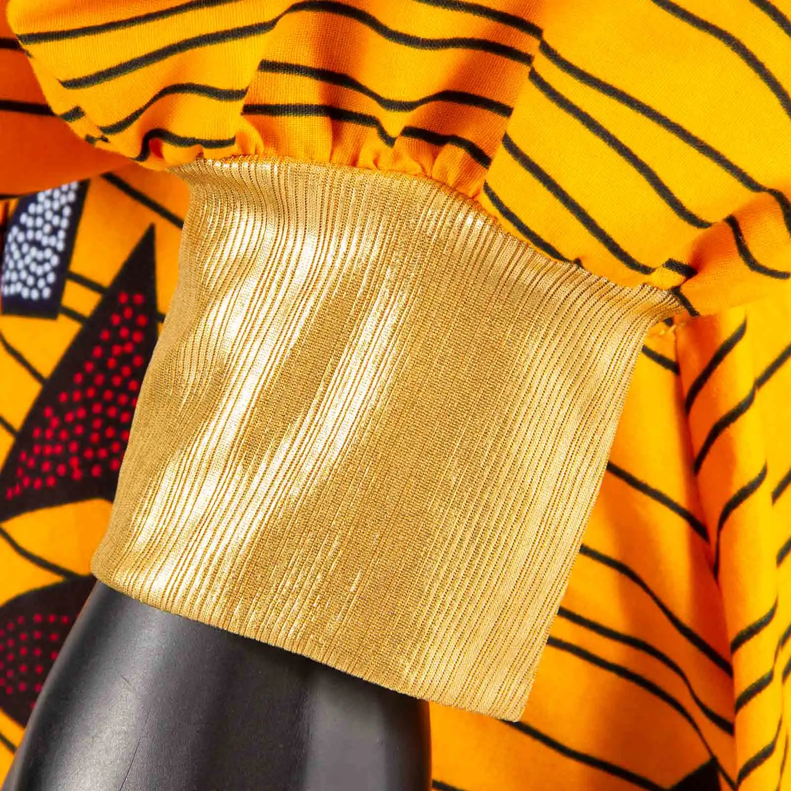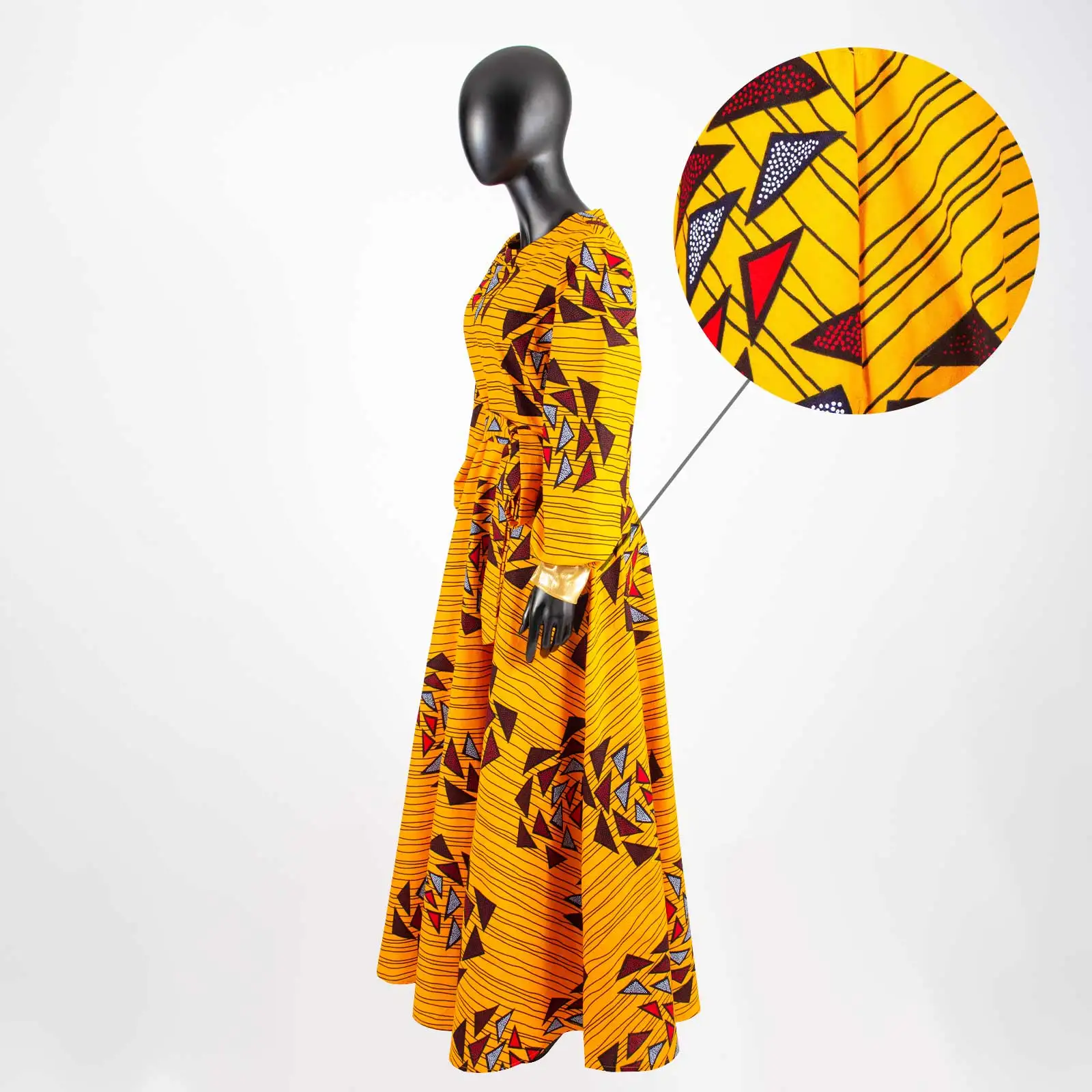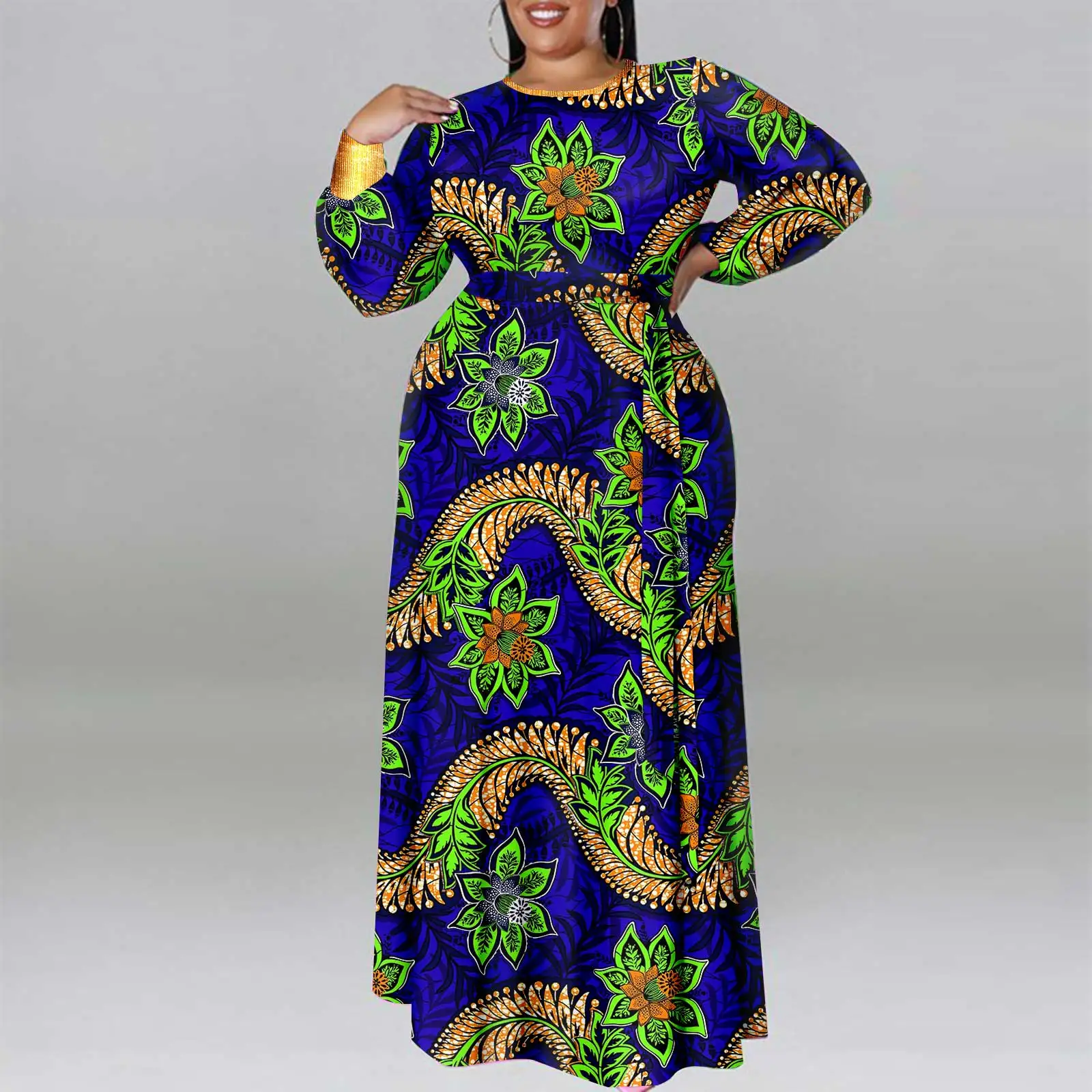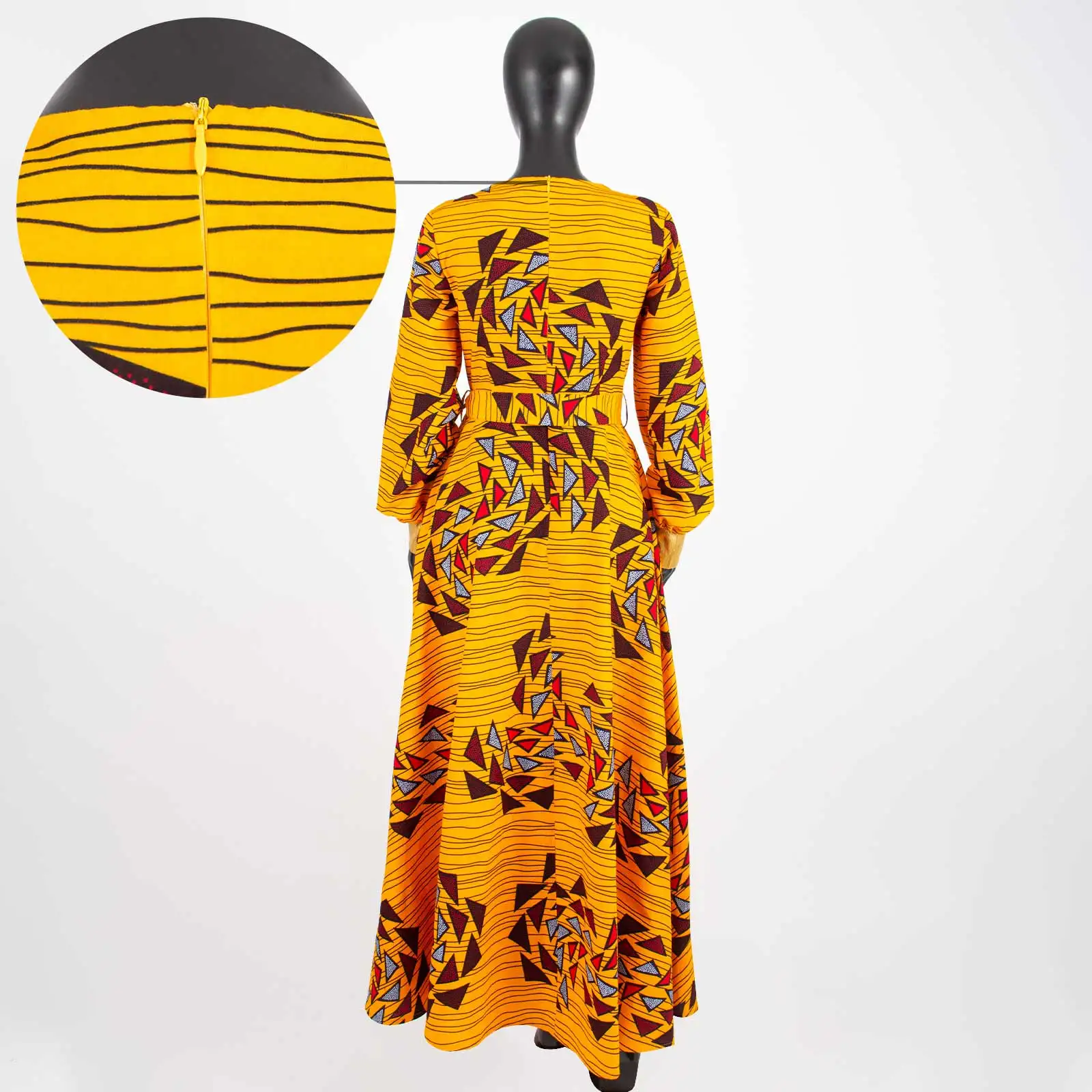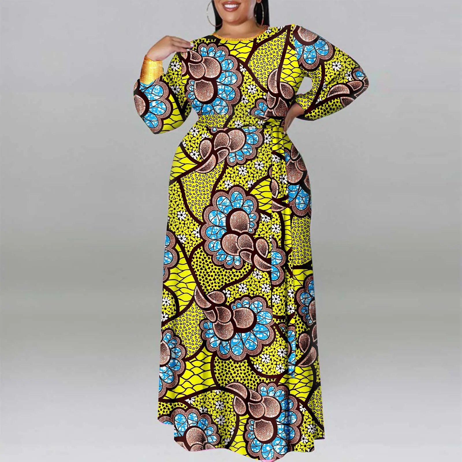 African Women’s Plus Size Dress Ankara Printed Fabric Gold Cuffs Accessory Belt Ankle Casual Dress A2325011