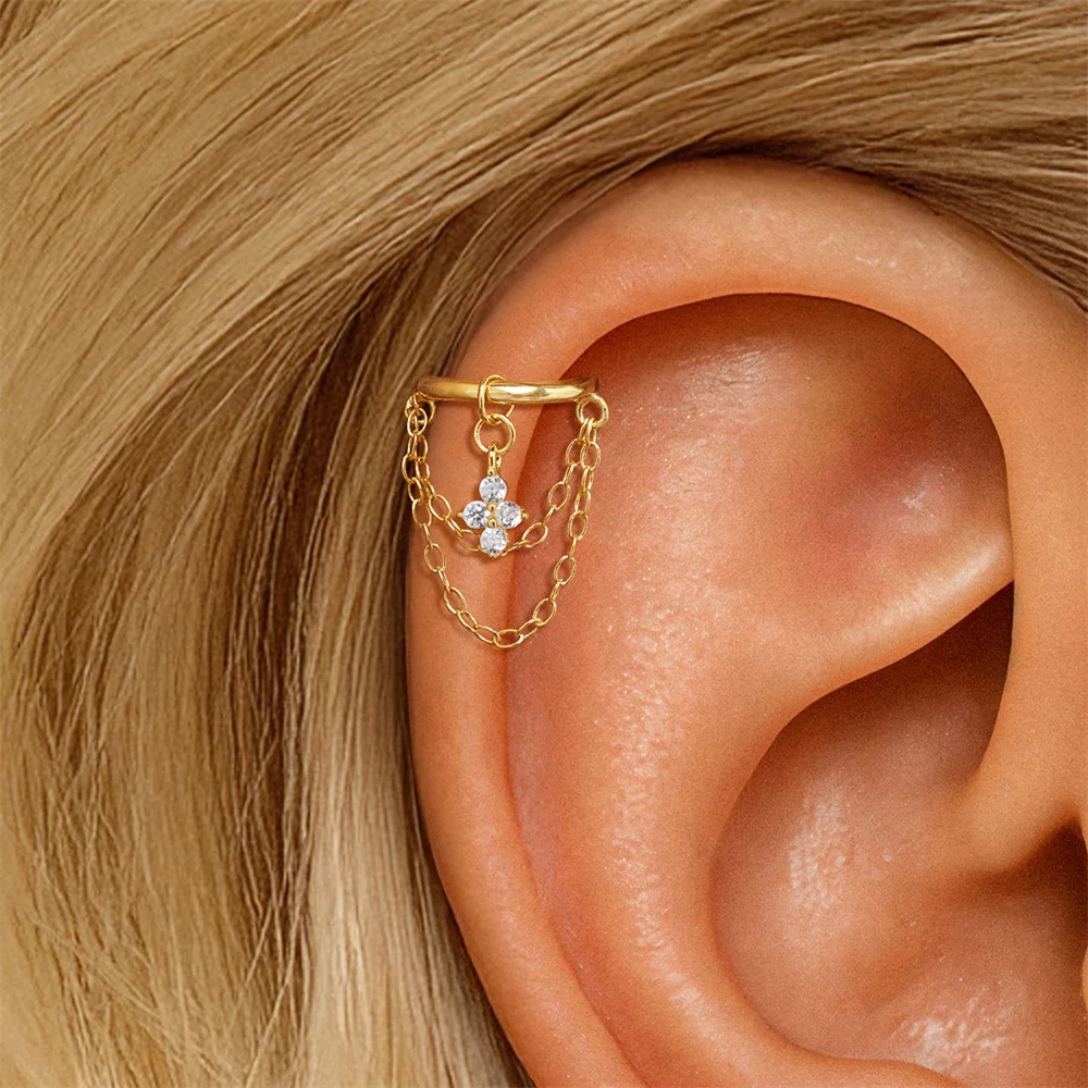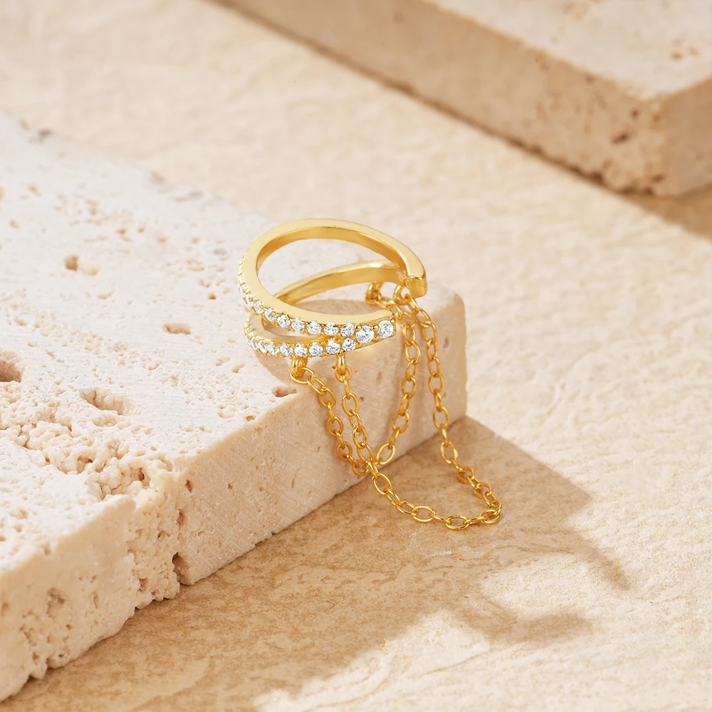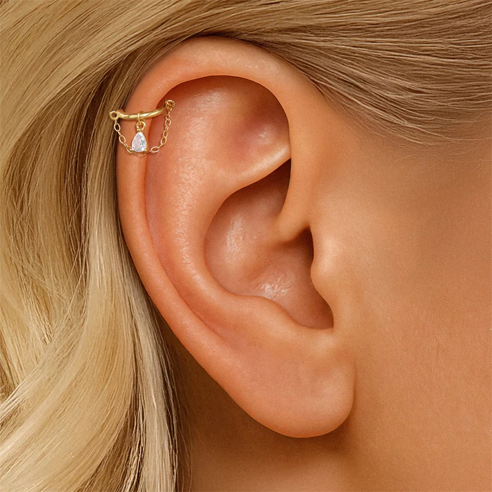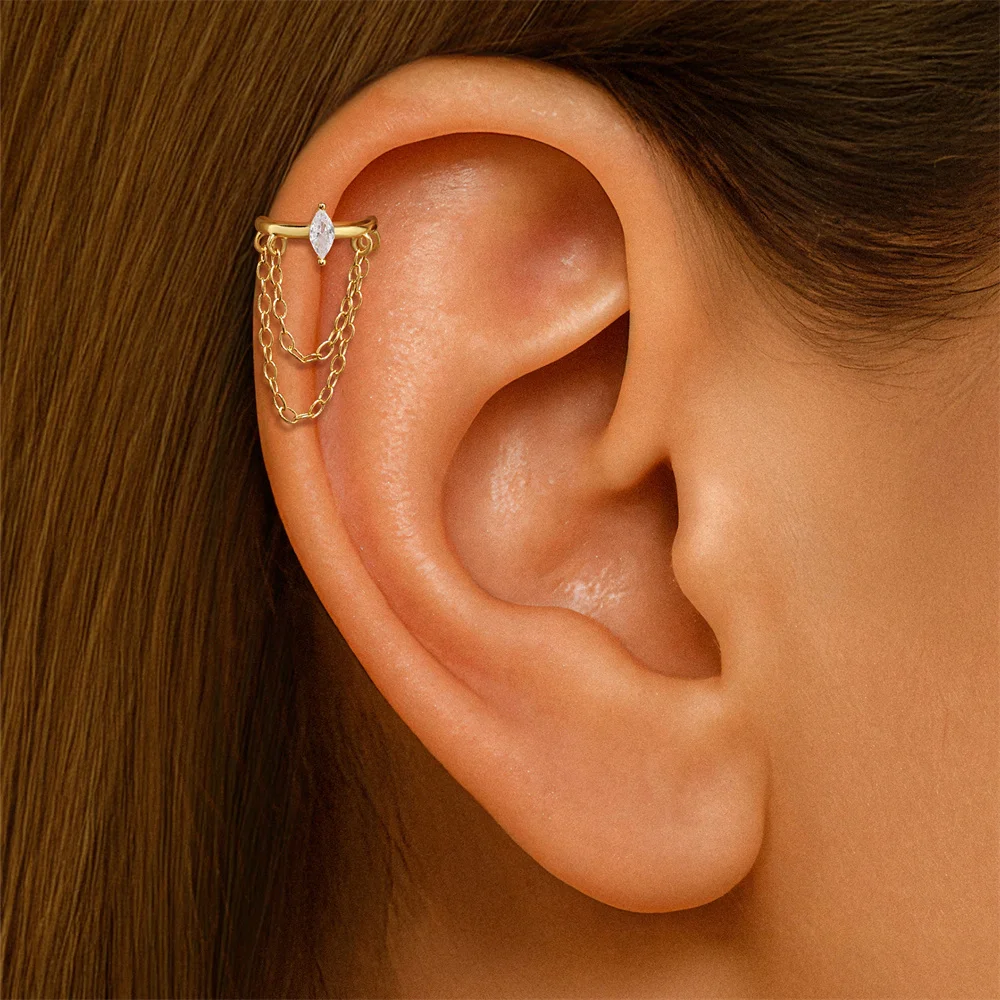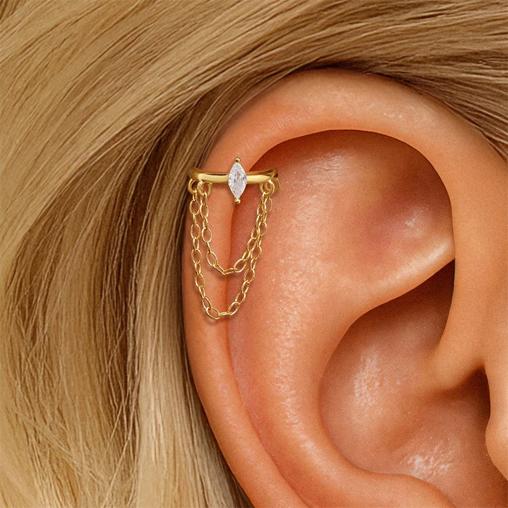 925 Sterling Silver White Zircons Pave Chain Tassel Ear Cuffs For Women Non Pierced Oval Crystal Crown Shape Clip Earrings
