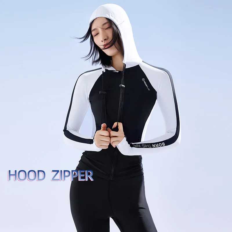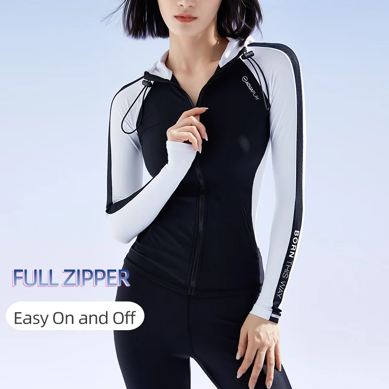 AquaPlay Women Sports Swimwear Fitness Black and White Sleeves Swimsuit Beach Rash Guard Long Sleeve Surfing Clothes Diving