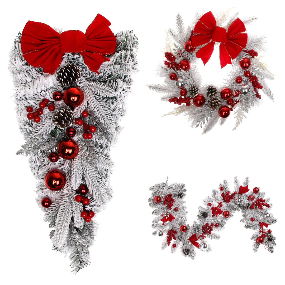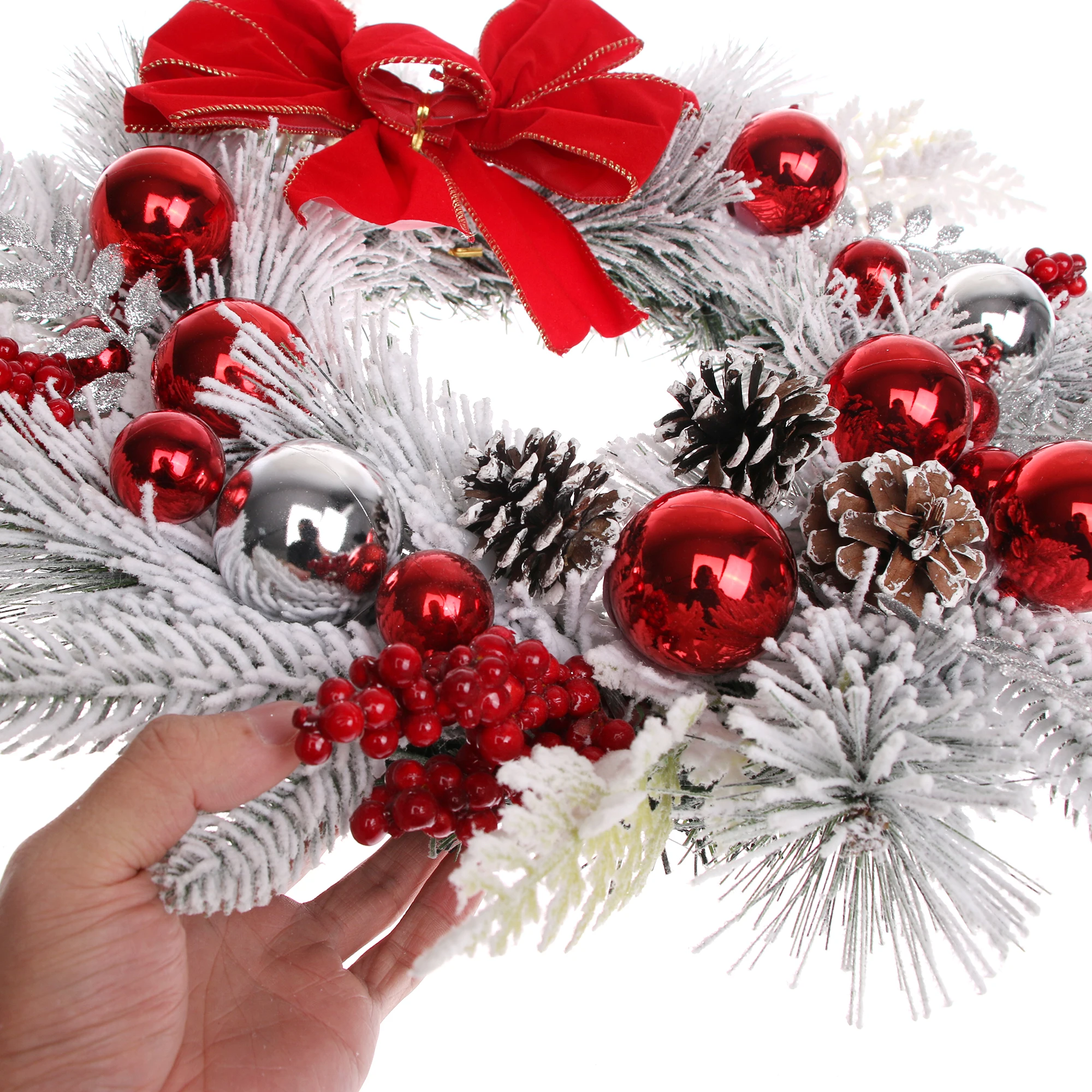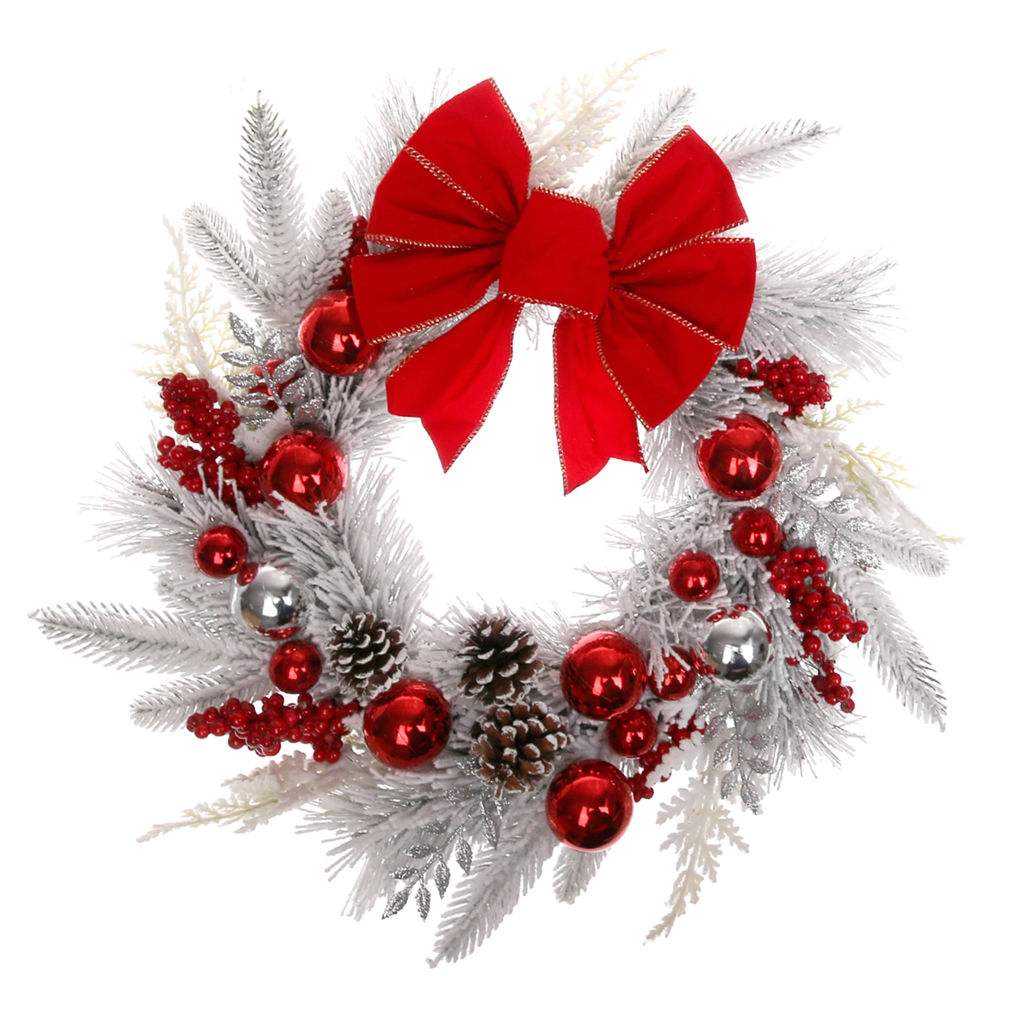 Each artificial christmas wreath with four sizes of glossy red and white ornaments. Flocked pinecones, red berry clusters, and more red ribbons nestle among green plants, it looks like the growth pattern of branches