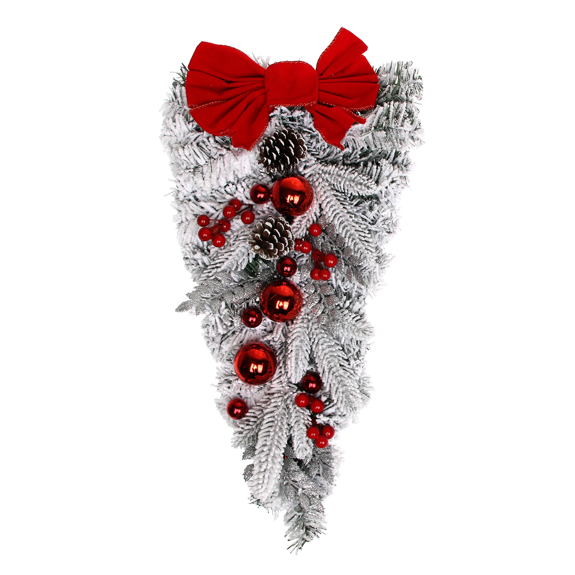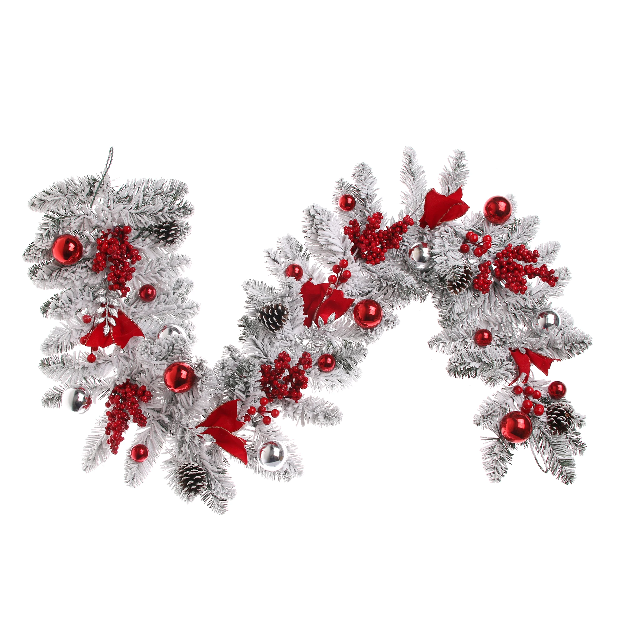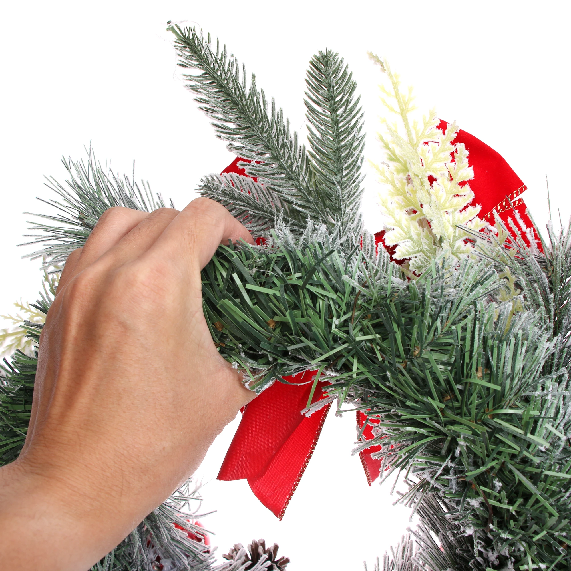 Each artificial christmas wreath with four sizes of glossy red and white ornaments. Flocked pinecones, red berry clusters, and more red ribbons nestle among green plants, it looks like the growth pattern of branches