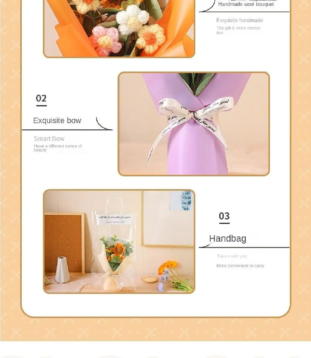1. **Handmade Craftsmanship**: Each bouquet is meticulously handcrafted using crochet techniques, showcasing the skill and artistry involved in creating these beautiful and intricate artificial flowers. The attention to detail ensures each flower is unique and of high quality.
