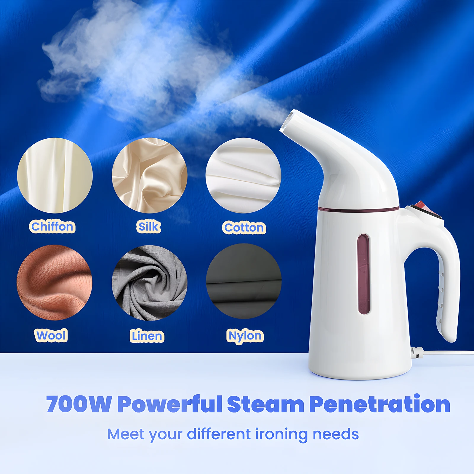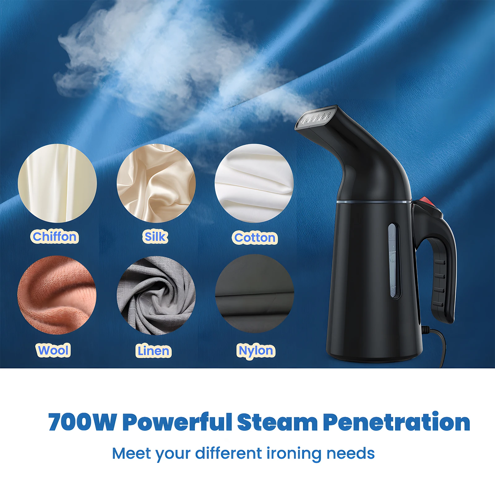 【Powerful and Efficient】: The 700W clothing steamer is designed to provide powerful and efficient steam for quick and easy wrinkle removal. With a 120ml water tank, it can continuously iron 4-5 garments without the need for refills.
