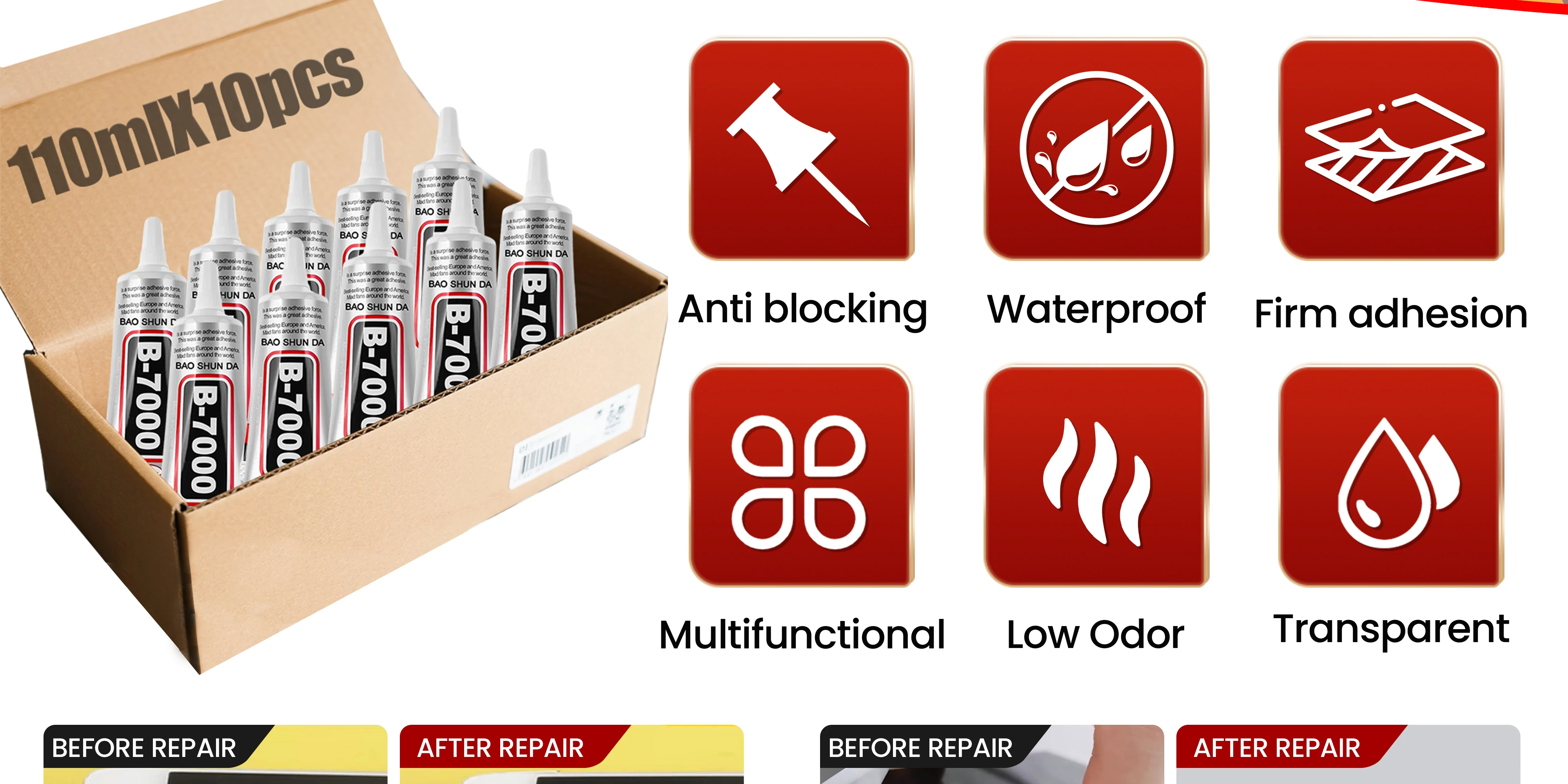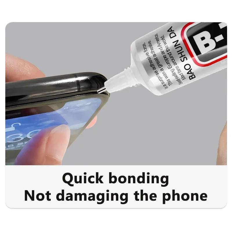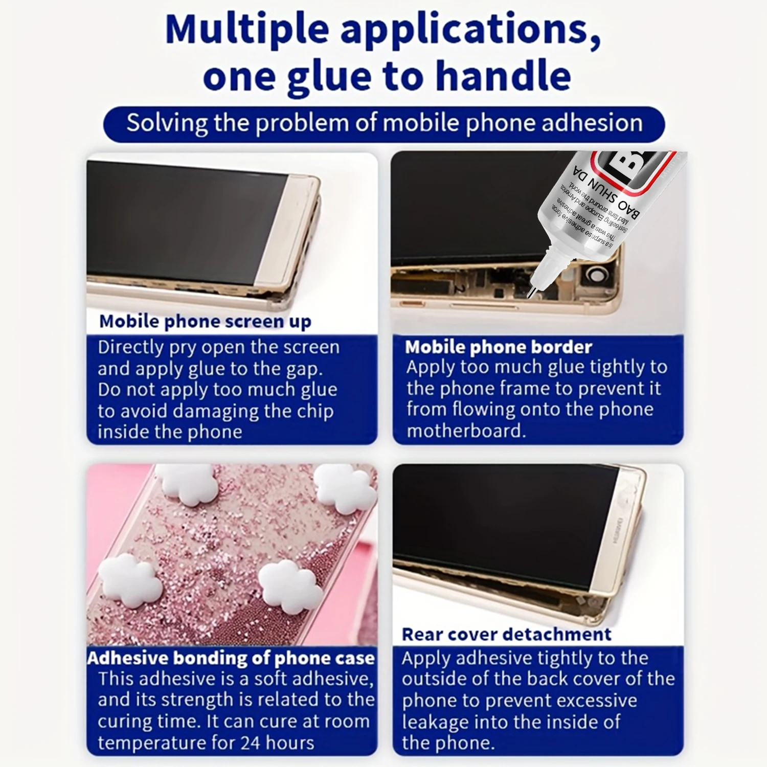 1.B7000 Cell Phone Glue: Can be used for cell phones, tablets, electronic products (such as watches, Bluetooth headphones), jewelry, toys, metal, plastic, glass, rubber, fiber, paper, ceramics, wood, cloth, fabric, nylon, PVC, leather, glass, crafts and other materials.