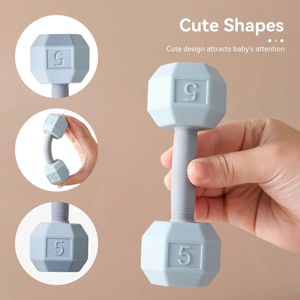 100% Baby Safe: Crafted from 100% premium food-grade silicone, this baby dumbbell rattle is free from latex, phthalates, lead, and toxic substances. With no sharp edges or small parts, this teething dumbbell toy is completely safe for newborns.
