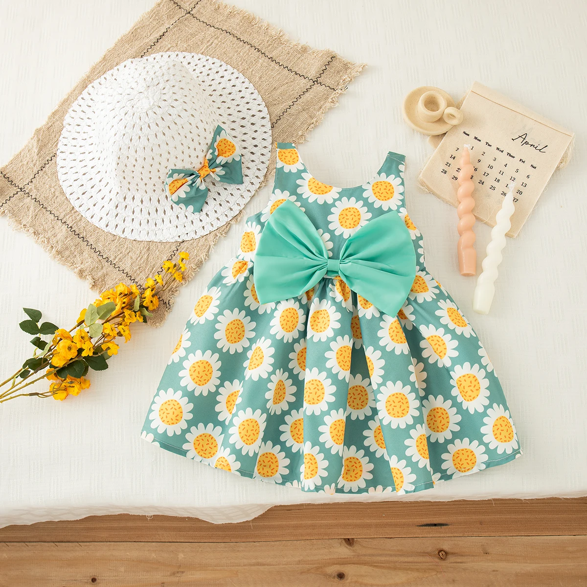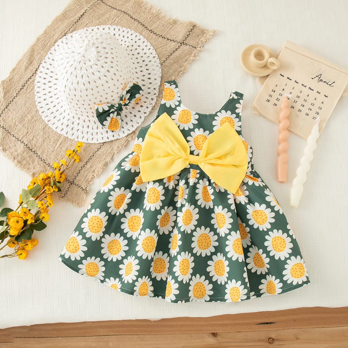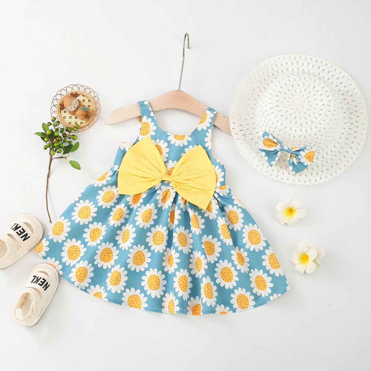 Baby Girl Dress Summer Bow And Sunflower Pattern Halter Beach Girl Kid’s Dress Cute Casual Baby Dresses With Hat
